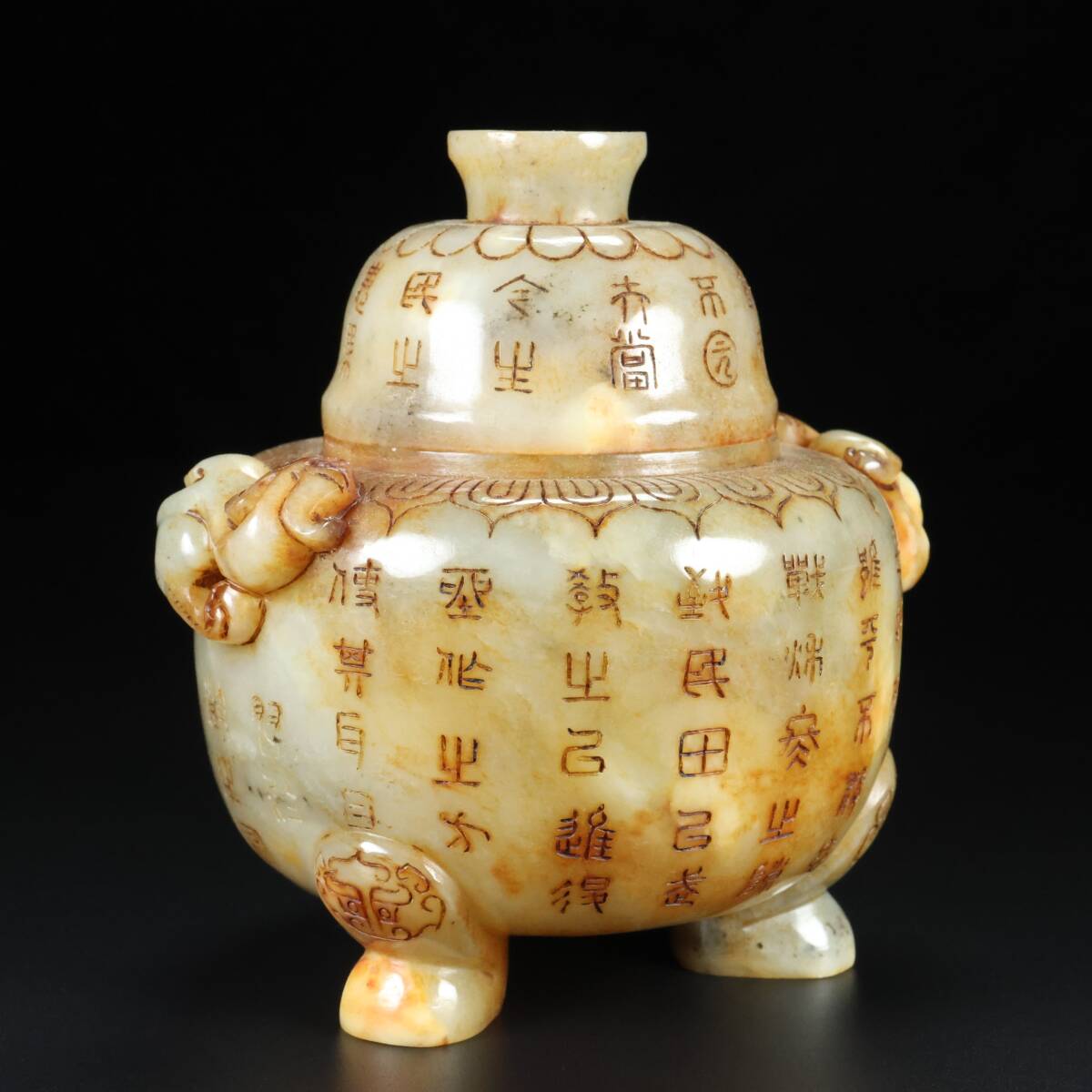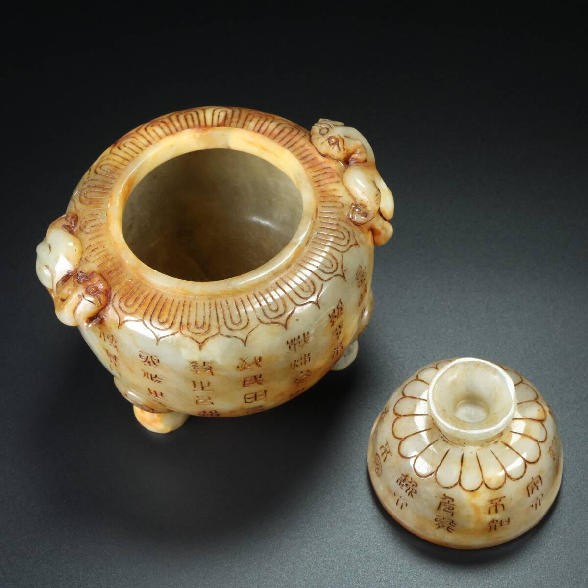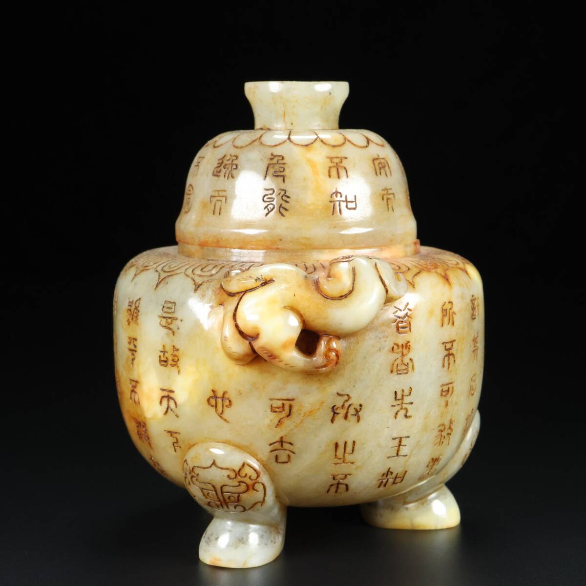古玉彫 旧蔵 清代 和田老玉 雙獸香爐 細密細工 時代物 古置物 古賞物 中国古美術 中國文玩 S74