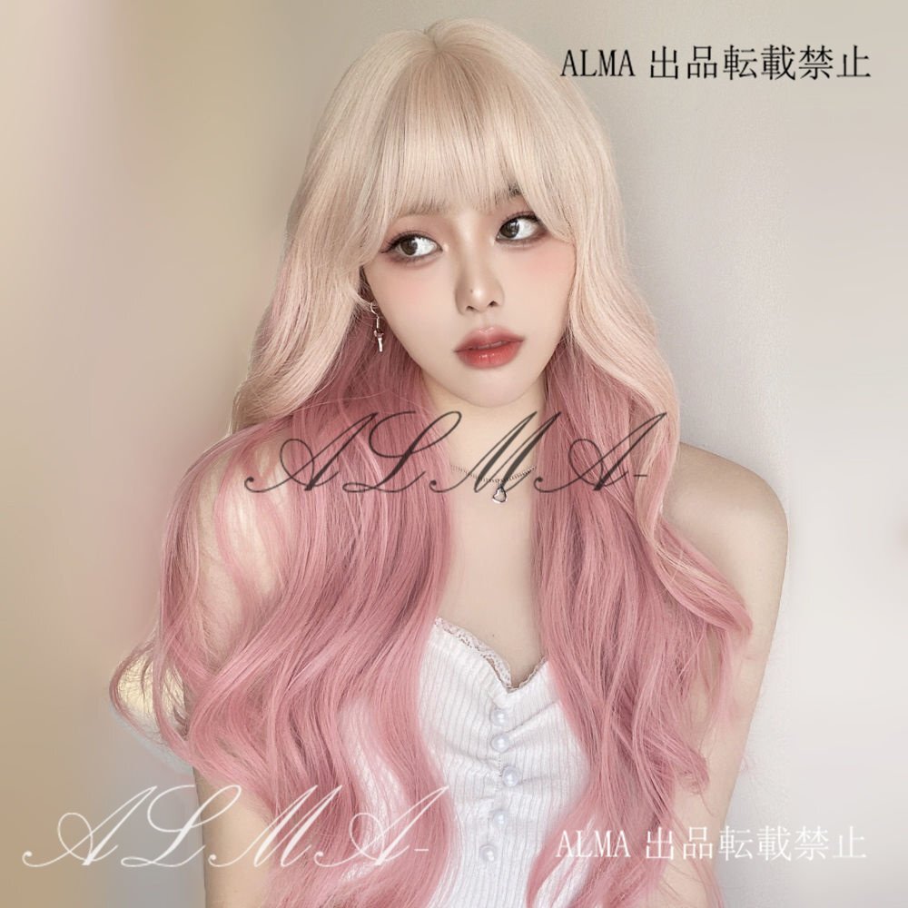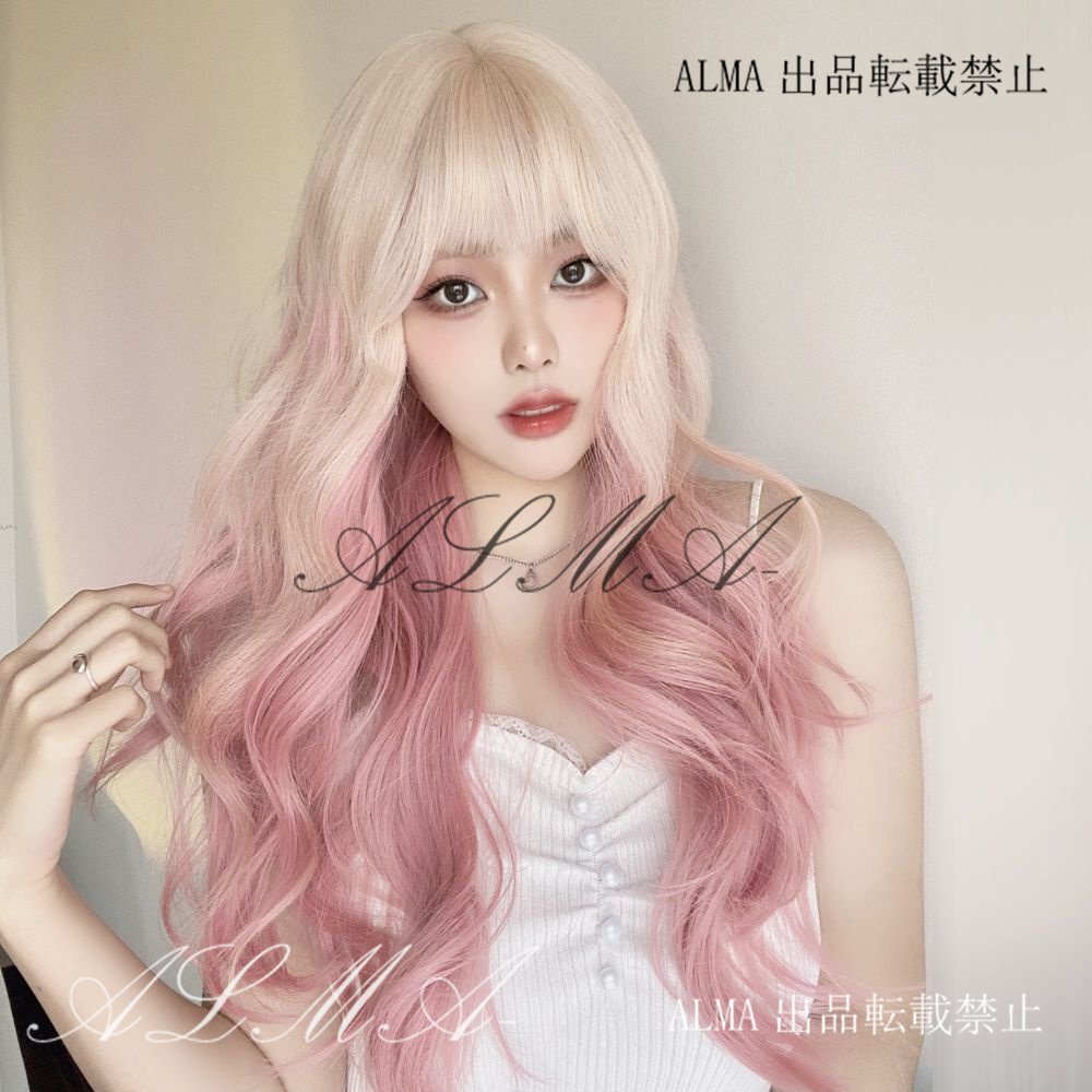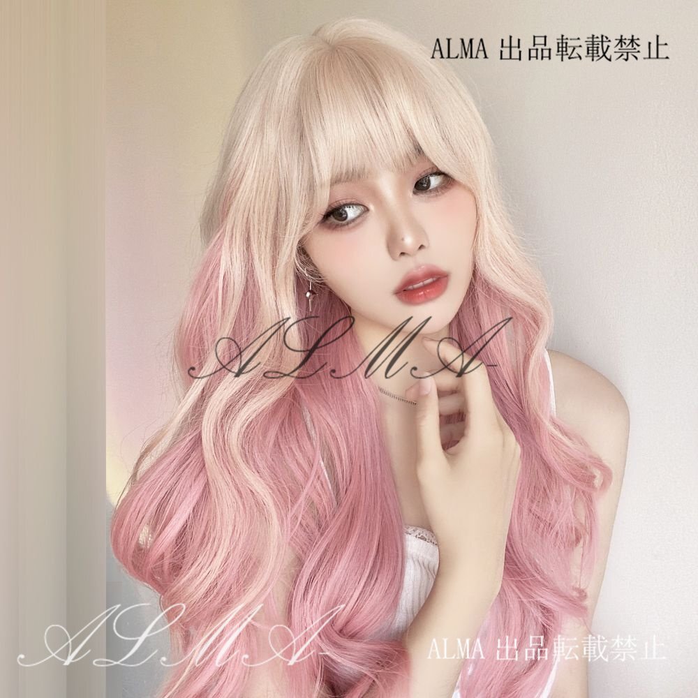 新品人毛 春色さくらピンク ゆめかわ ドーリー系 プラチナカラー グラデピンク ロングカール つむじ部分手植え 自然に見えますフルウィッグ