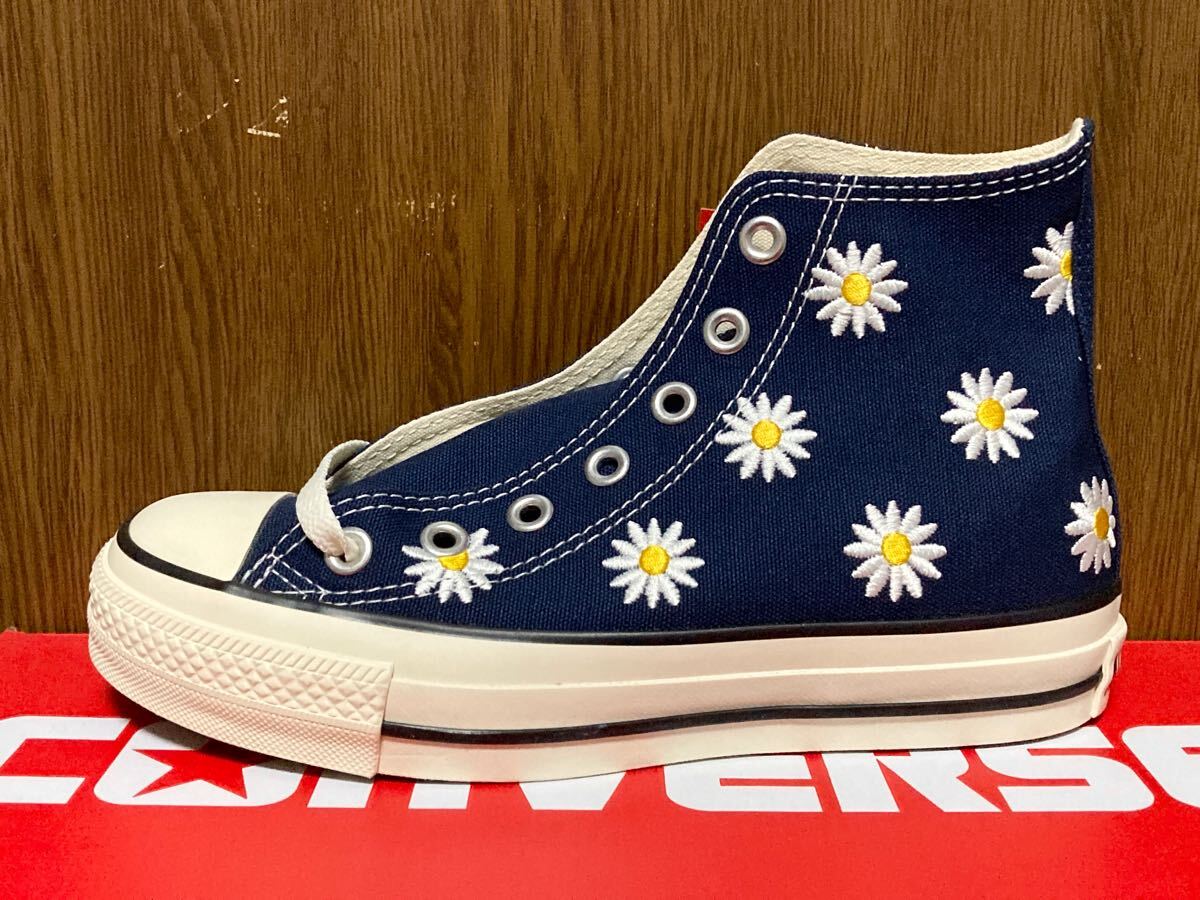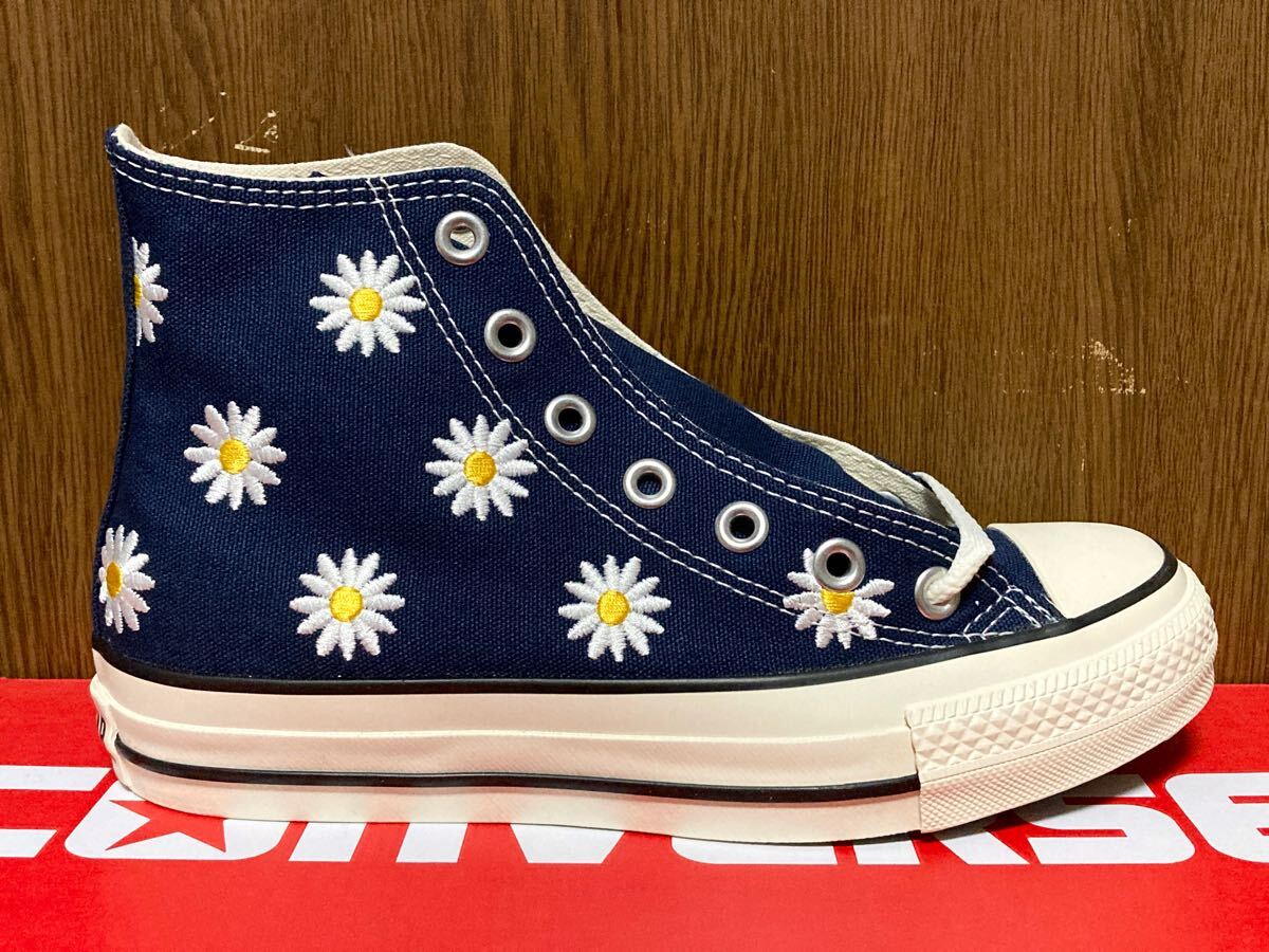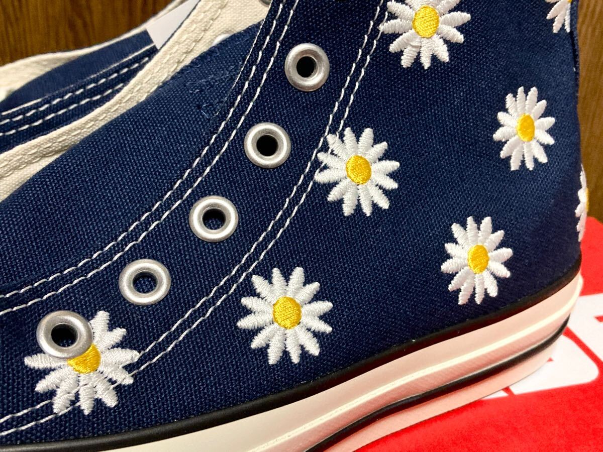 濃いネイビーのキャンバス生地アッパーにデイジーの花柄が刺繍されたモデルです。
