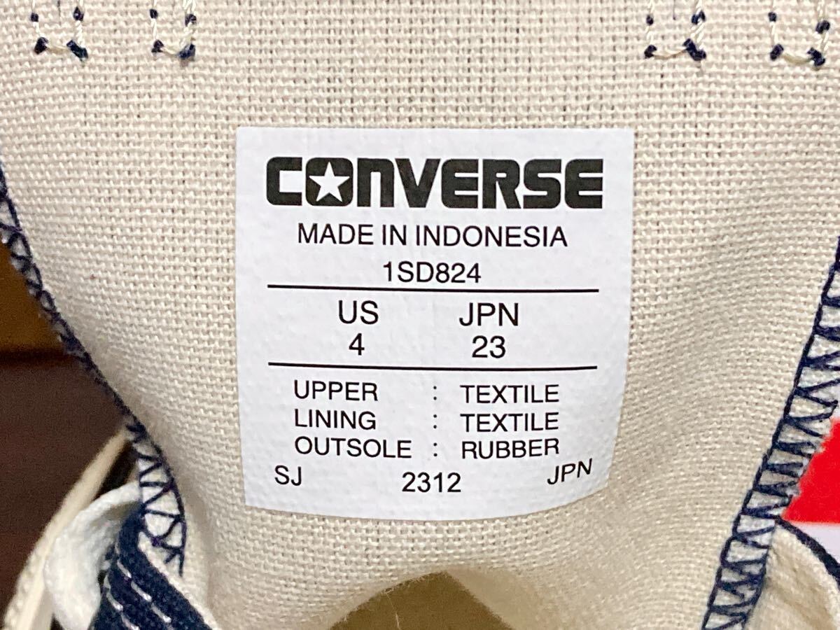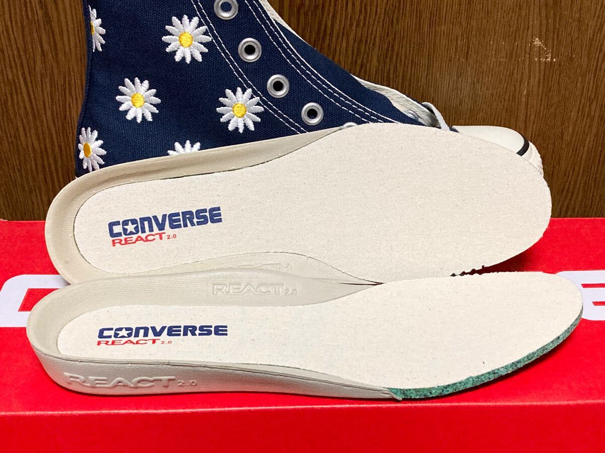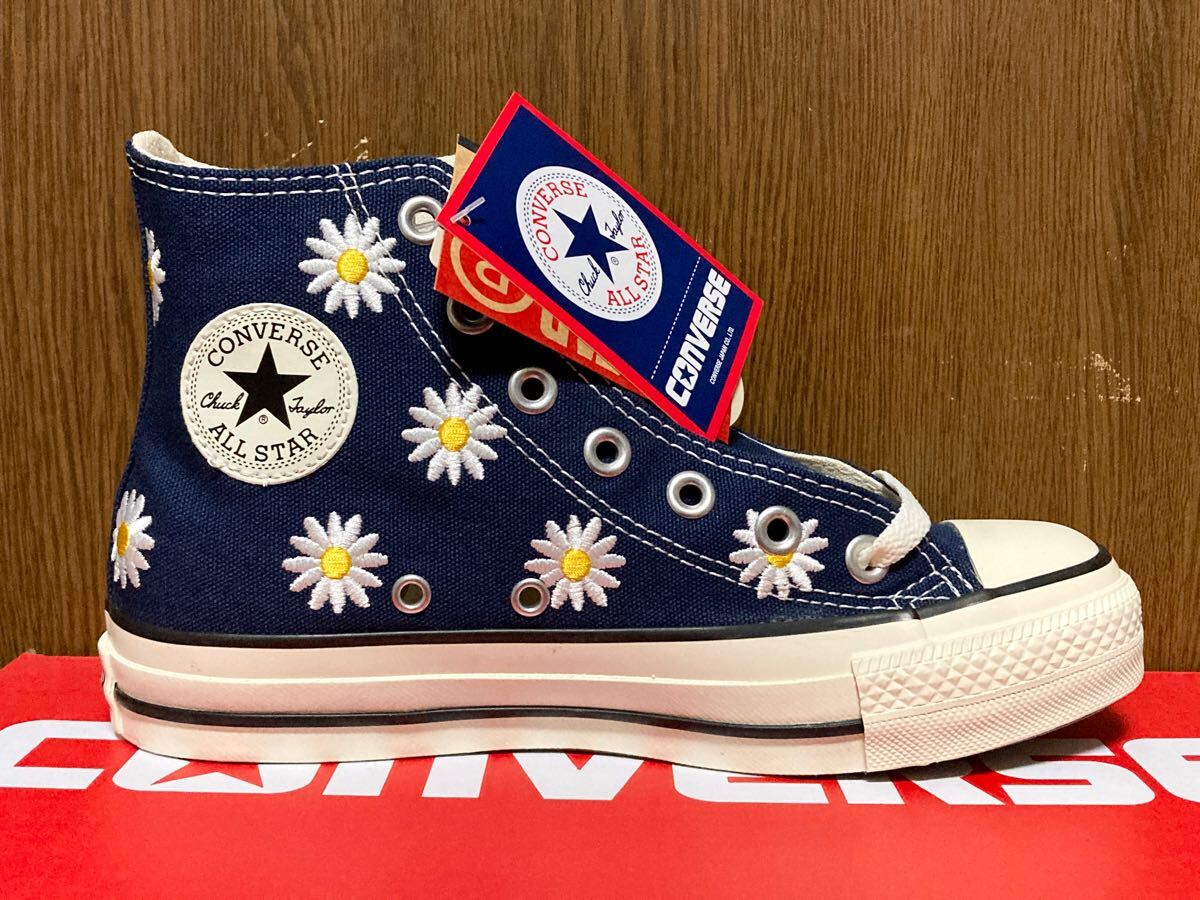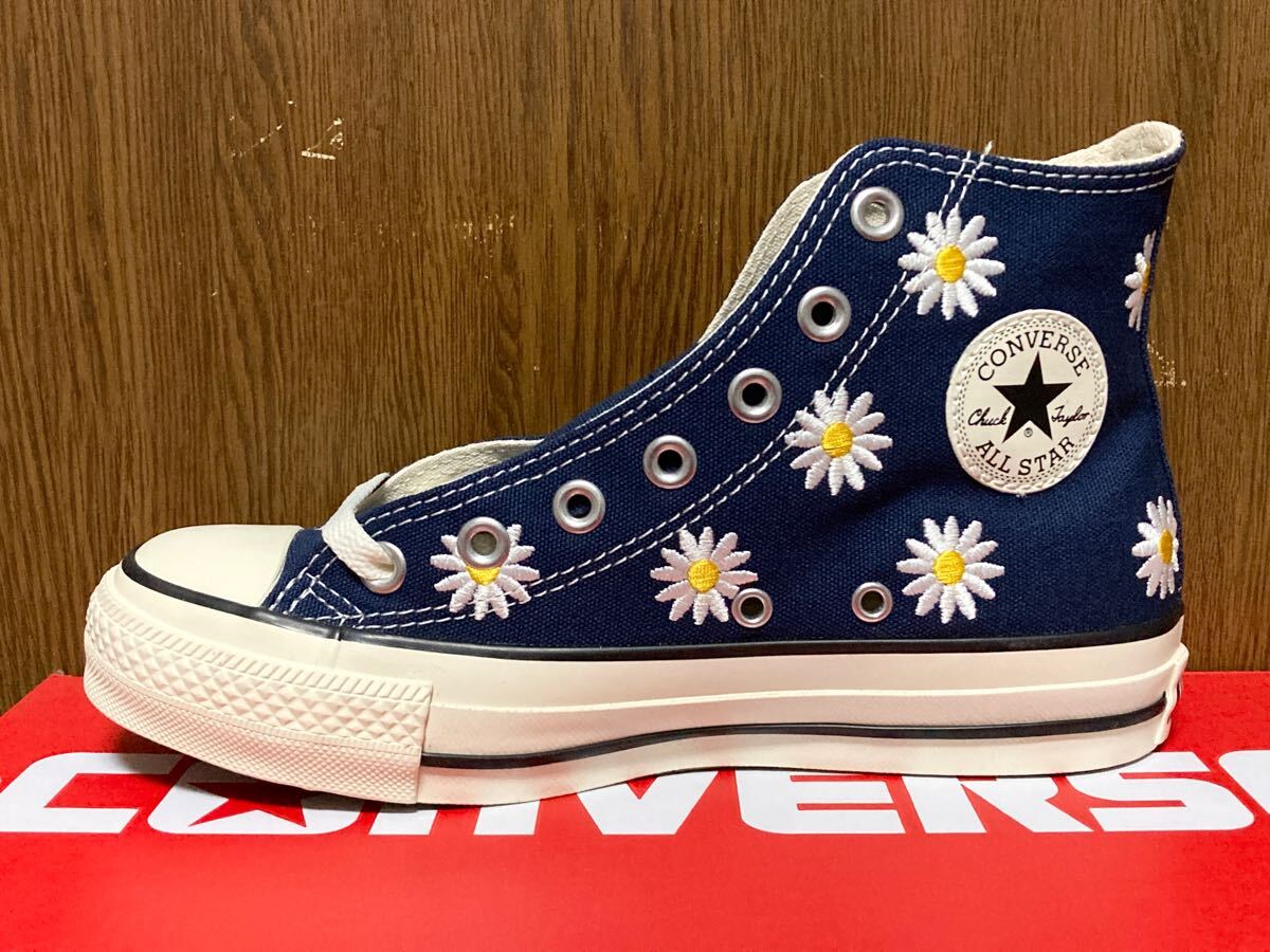 濃いネイビーのキャンバス生地アッパーにデイジーの花柄が刺繍されたモデルです。