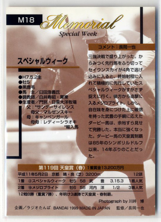 | ★スペシャルウィーク M18 メモリアルカード 銀文字箔押し バンダイ サラブレッドカード 99年上半期版 武豊 日本ダービー 天皇賞(春) 天皇賞(秋) ジャパンカップ 写真 画像 競馬カード 即決 | |