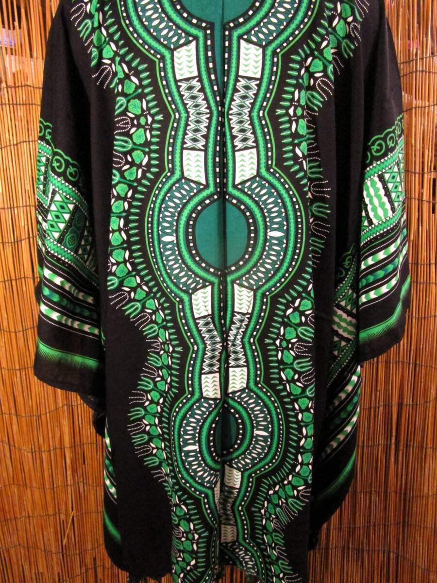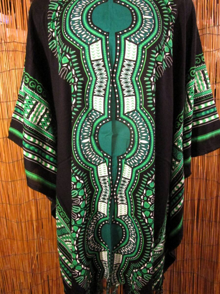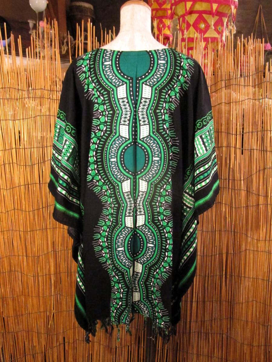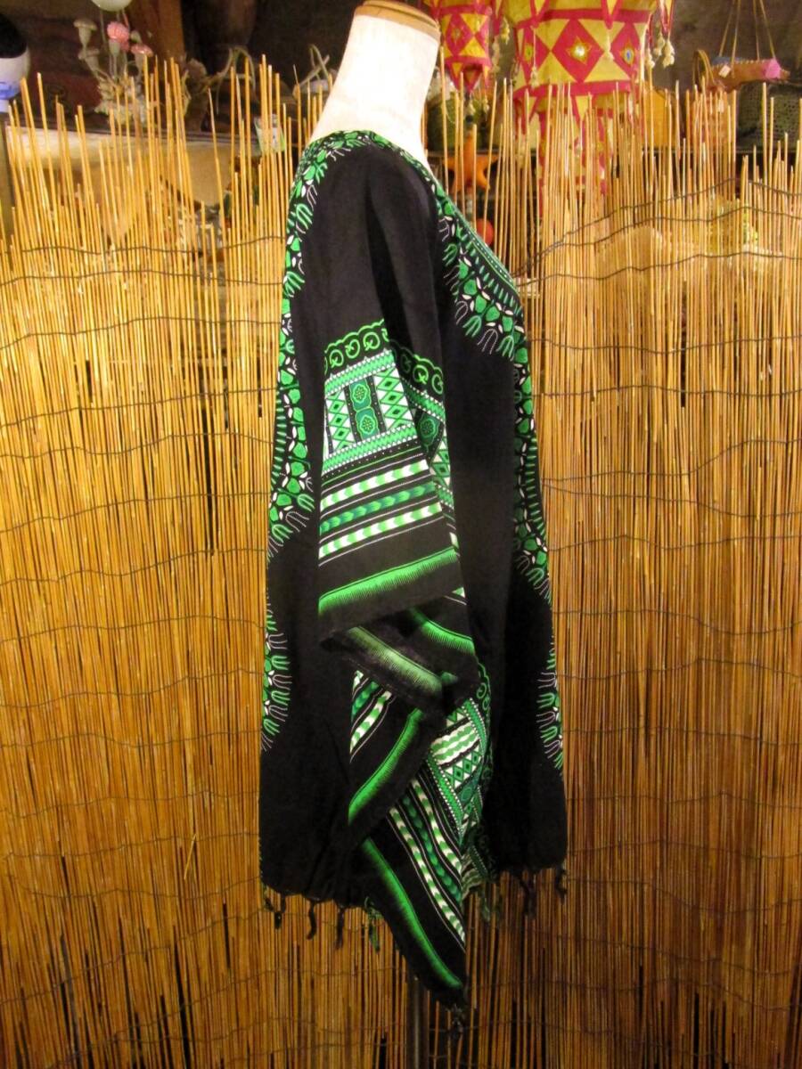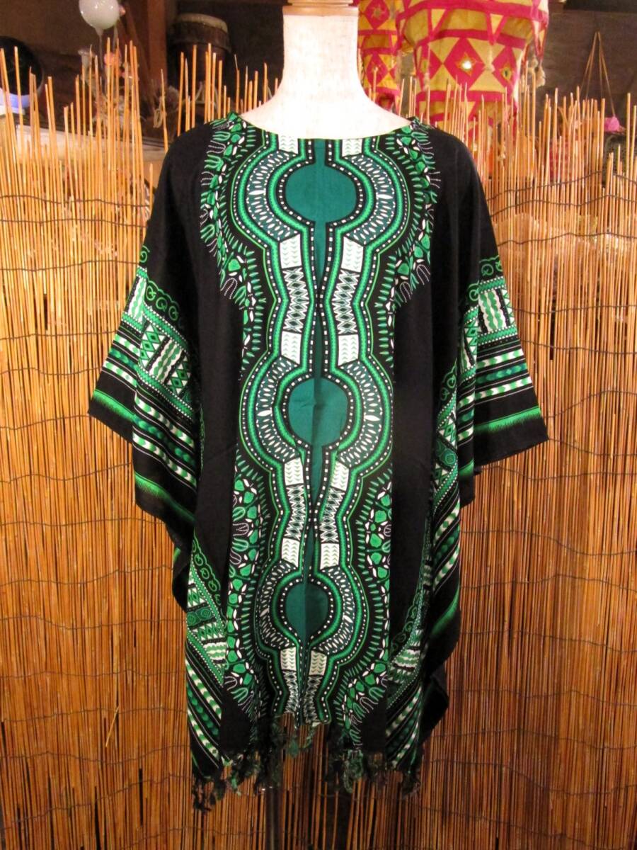 ⑩新品*男女兼用*レーヨン素材*黒色*アフリカンプリント*ダシキ*ゆったりサイズ*フリンジ*ポンチョ