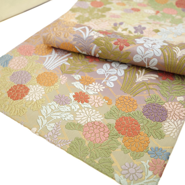 袋帯 正絹 京都 西陣 唐織 金箔糸 金糸 オフホワイト 灰紫 薄灰緑 四季の花 フォーマル 春 秋 冬 新古品 仕立て上がり みやがわ sb53788