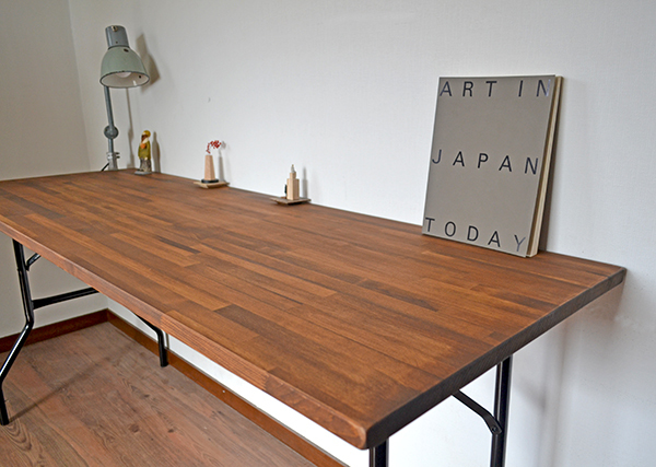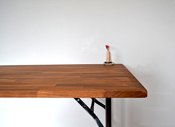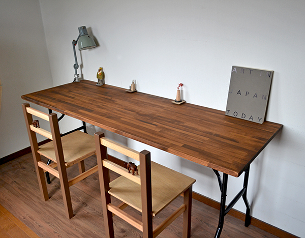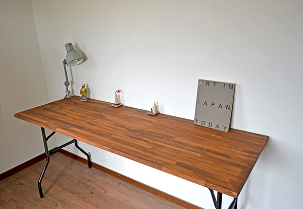 天板はフラットな集成材の無垢材を使用しており、厚みのあるしっかりとした材料で、丁寧に研磨しております。