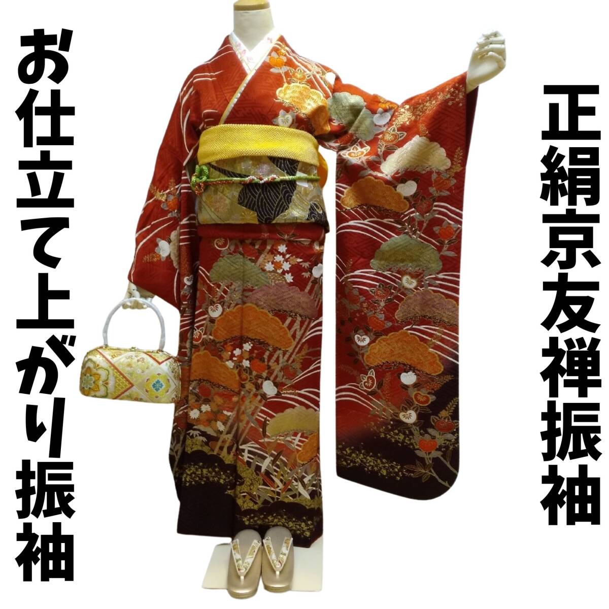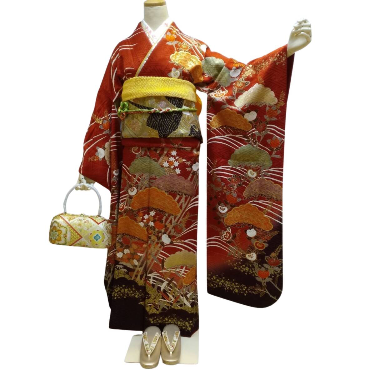 振袖 正絹 lf079 赤色地古典花文様柄 お仕立て上がり 長襦袢付き2点セット 送料込み