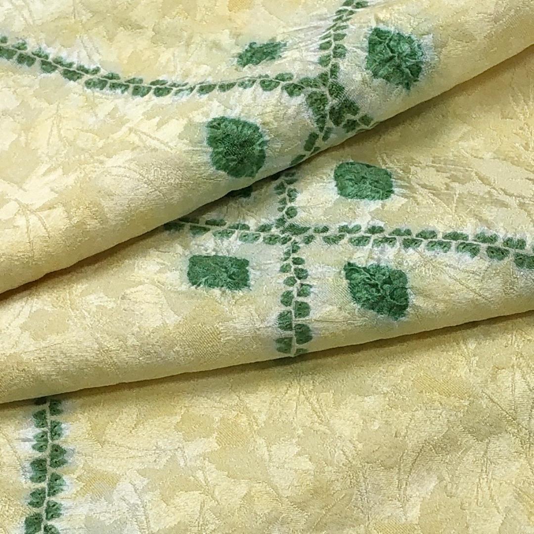 黄色ベースのお色味に花柄地模様、絞り柄の葉模様の柄裄がデザインされた素敵なお品でございます。