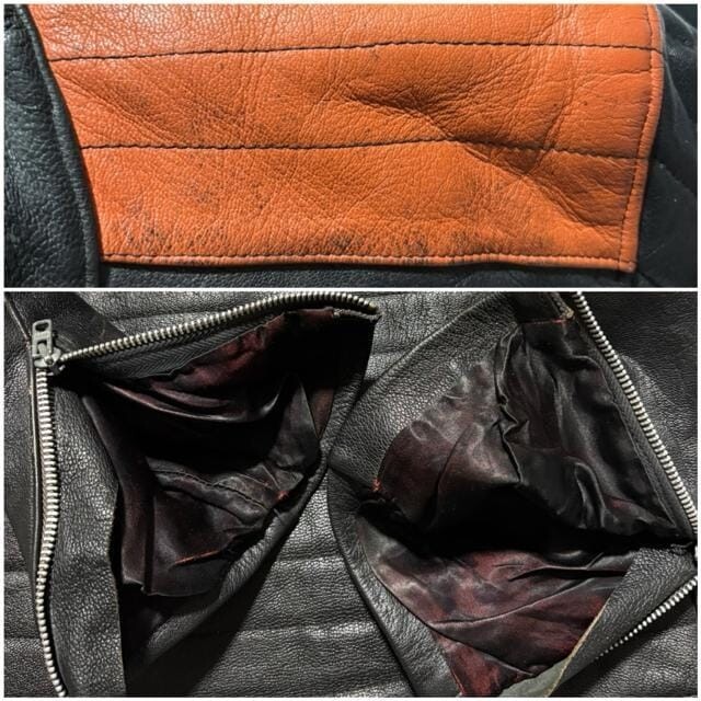 革なので当然シワや擦れ感の革風合いはありますが年代物としてはまともに感じます(一例オレンジ部分の色感同アップ画像参照)