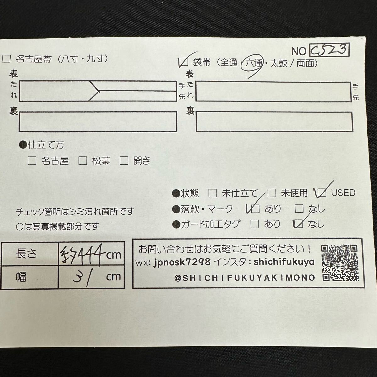 【七福】c523 逸品 高級品 正絹 袋帯 六通 金糸 金彩 じゅらく帝王紫 華文 花丸文 刺繍 豪華