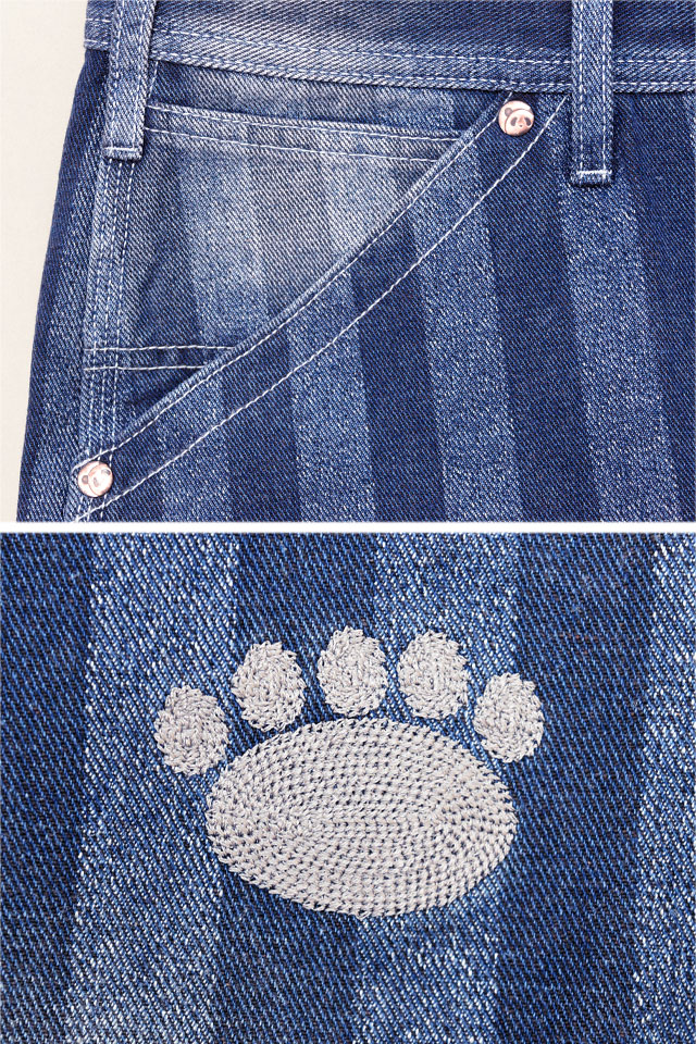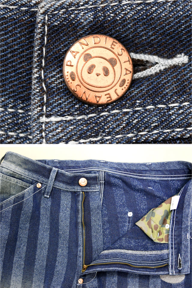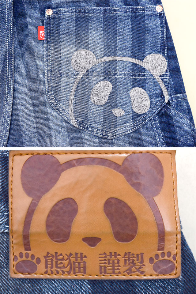 和柄ブランド【錦】の姉妹ブランドとして誕生した、お茶目なパンダをモチーフとした【PANDIESTAJAPAN】より「熊猫謹製ストライプジャガードワイドペインターパンツ(585651)」のご紹介です。 丸みを帯びたフォルムと表情が何とも愛らしいパンディエスタが大活躍! ボディーにストライプジャガード柄を施した、柔らかな穿き心地のペインターパンツです。 サイドにはそれぞれハンマーループとポケットが縫い付けられています。 フロント左腿には、パンダのフットスタンプを刺繍。 バック右ポケットにはパンダのアイコンをこちらも刺繍で表現しました。 トップボタン、リベットにはパンダの刻印入りのオリジナルのものを採用。 フロントはジッパーフライです。 ゆったりとしたシルエットで、楽に穿いて頂ける逸品です。 | ||||||||||||||||||||||||||||||||||||||||