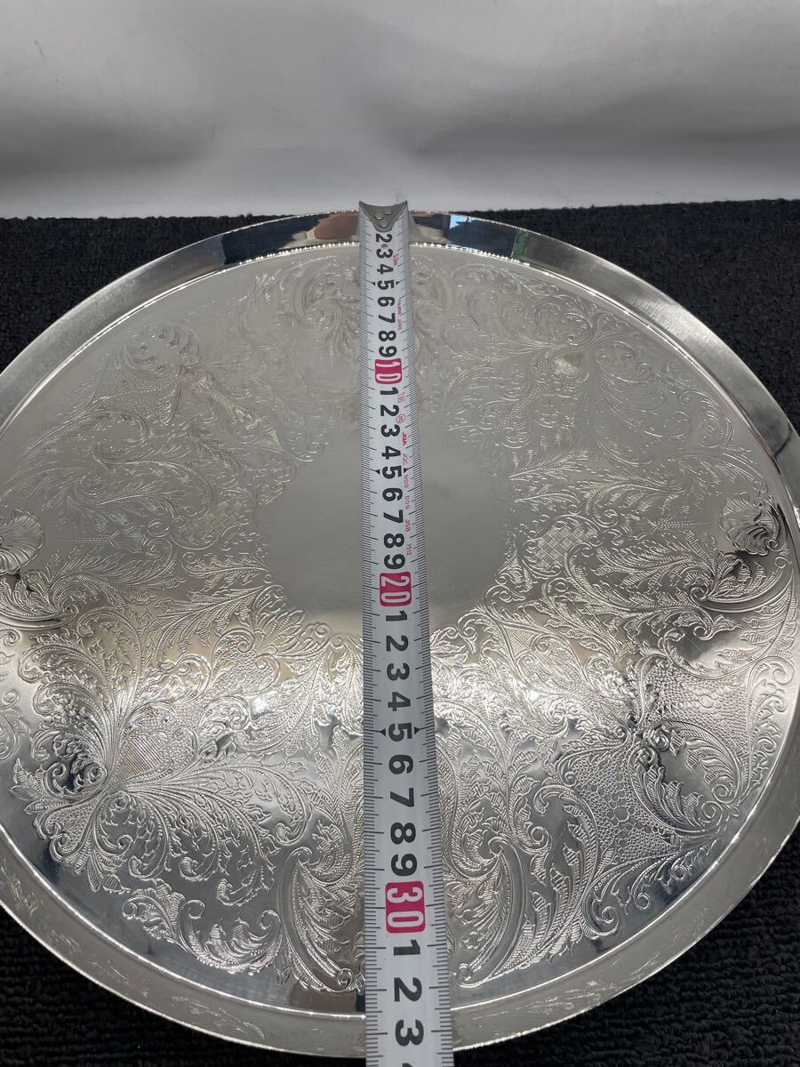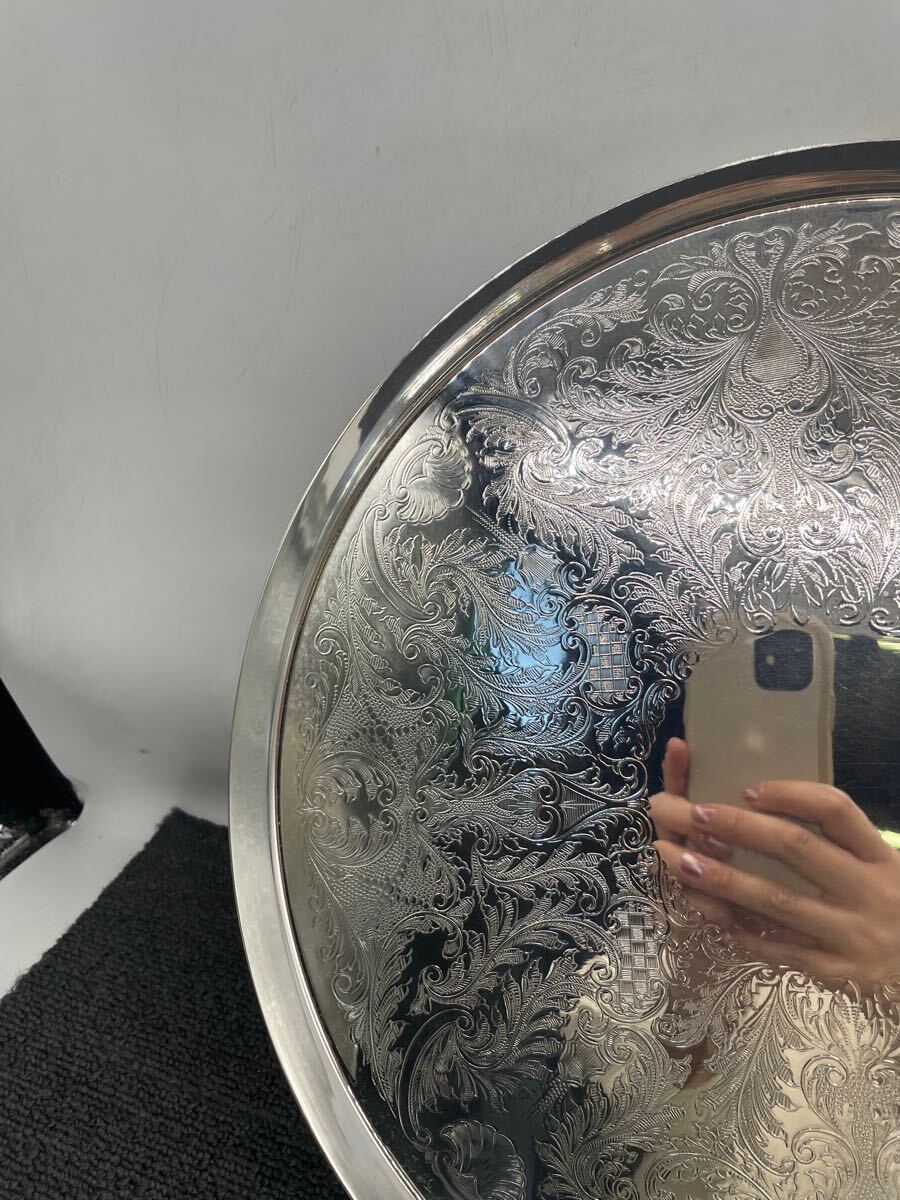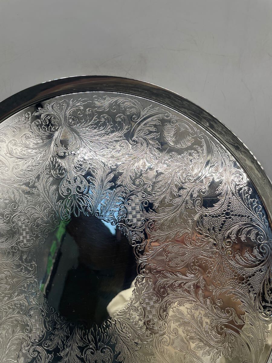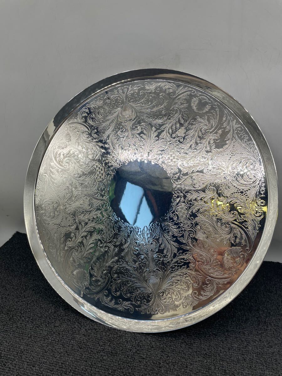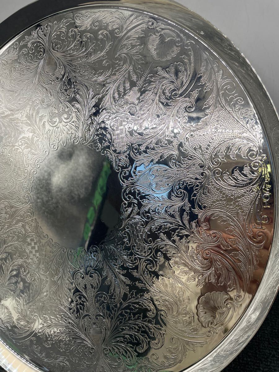 繊細な彫金装飾が美しい、イギリス製アンティークのシルバープレート・ケーキトレイです。