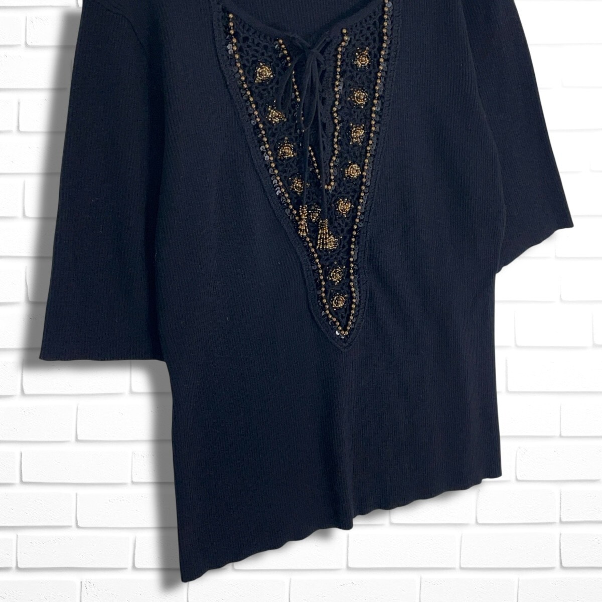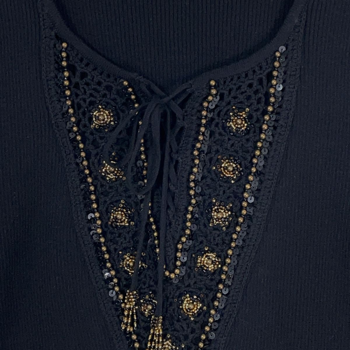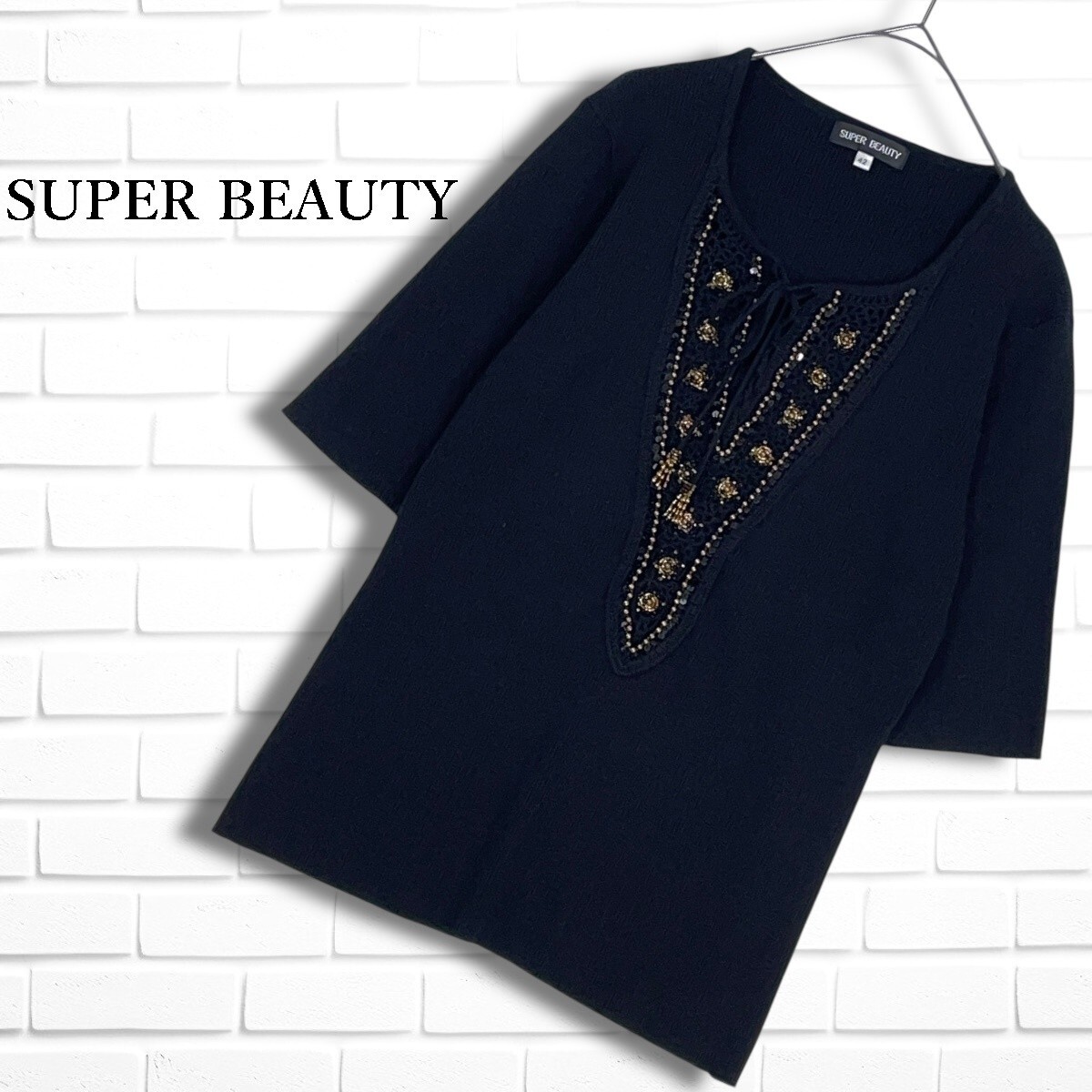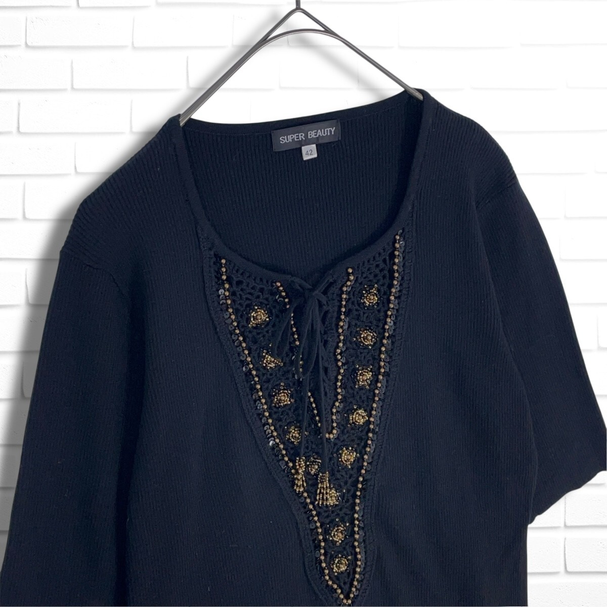 ◆美品◆ SUPER BEAUTY スーパービューティー ビーズ スパンコール レースアップ デザイン コットン リブ ニット カットソー 黒 ブラック レディース 42 ◆送料無料◆ 1965F◎