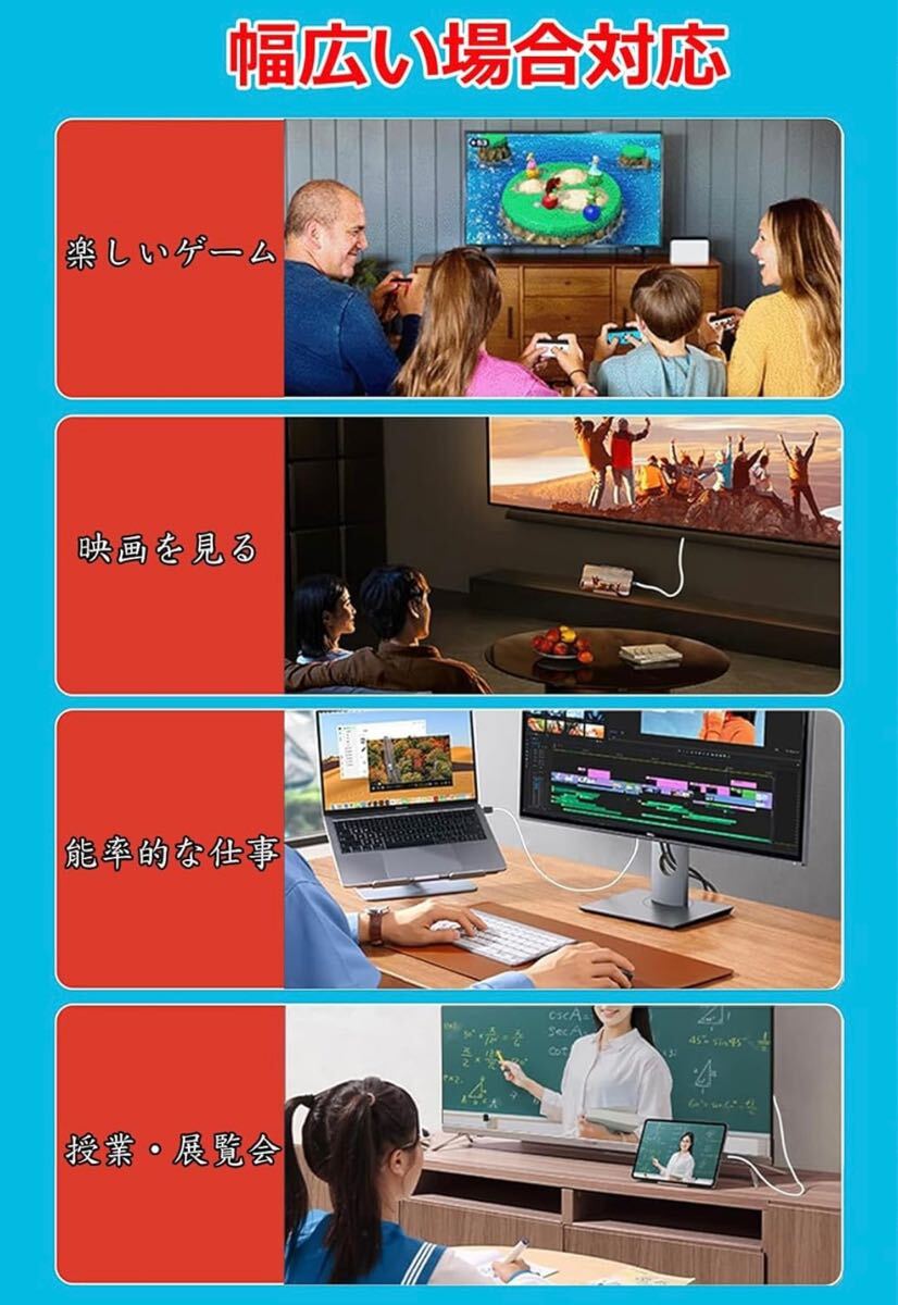 【4K解像度&鮮明な画質】Switch ドックケーブルの最大解像度は4K(3840x2160P)@30Hz、クリアで鮮やかな映像を提供します。Switch/パソコン/タブレット/スマホをHDMIポートを持つのテレビ、モニター、プロジェクターなどの機器に接続できます。クリアな音声と映像を安定かつ効率的に伝送でき、ゲーム映像を完璧に表示します。さまざまなシーンで自分のニーズに合わせて選択できます。Switch/Switch OLEDに対応。注意:出力機器が4Kに対応していることを確認する必要があります(スイッチは1080Pにのみ対応しています)。
