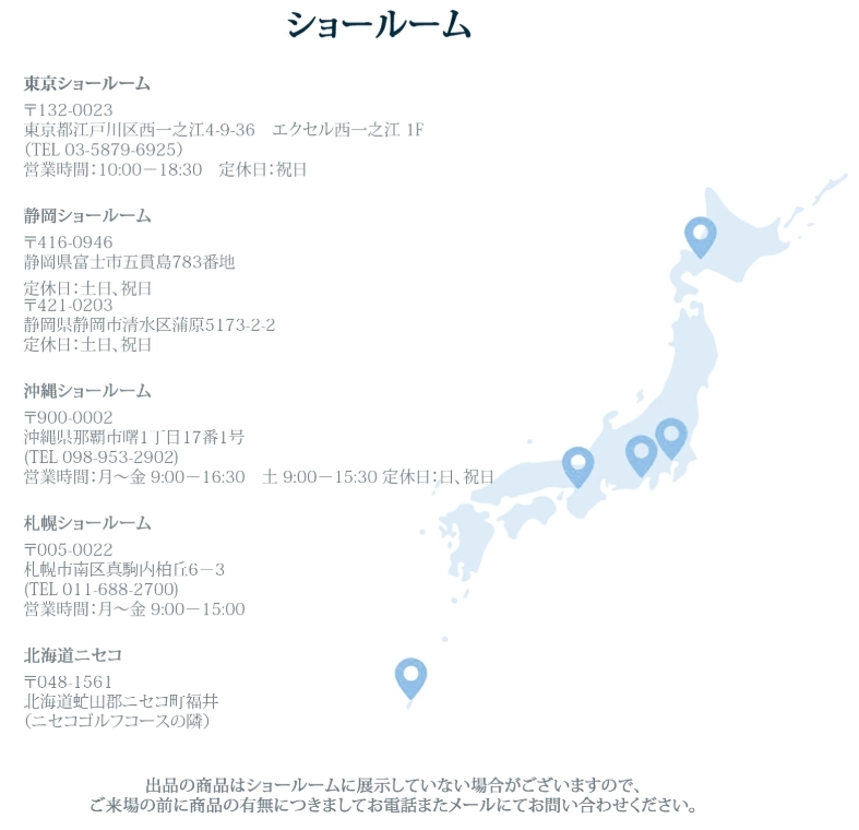 ● 東京、静岡、沖縄、札幌、ニセコにショールームを開設しております。