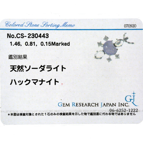 | 石目 | ハックマナイト1.46ct ムーンストーン0.81ct ダイヤモンド0.15ct |