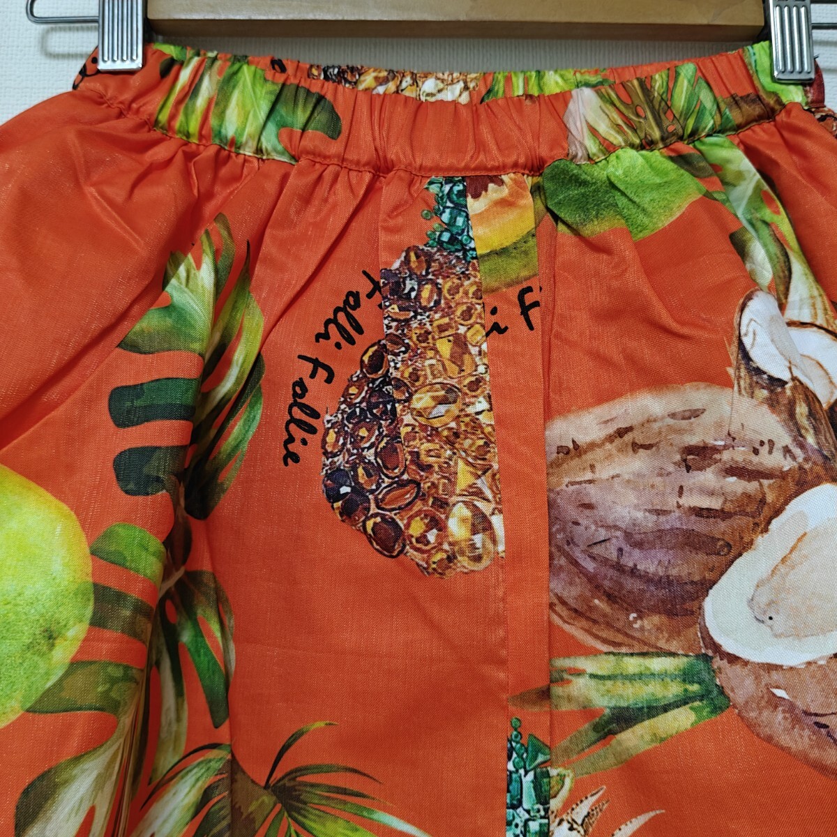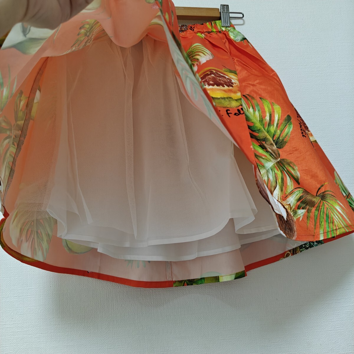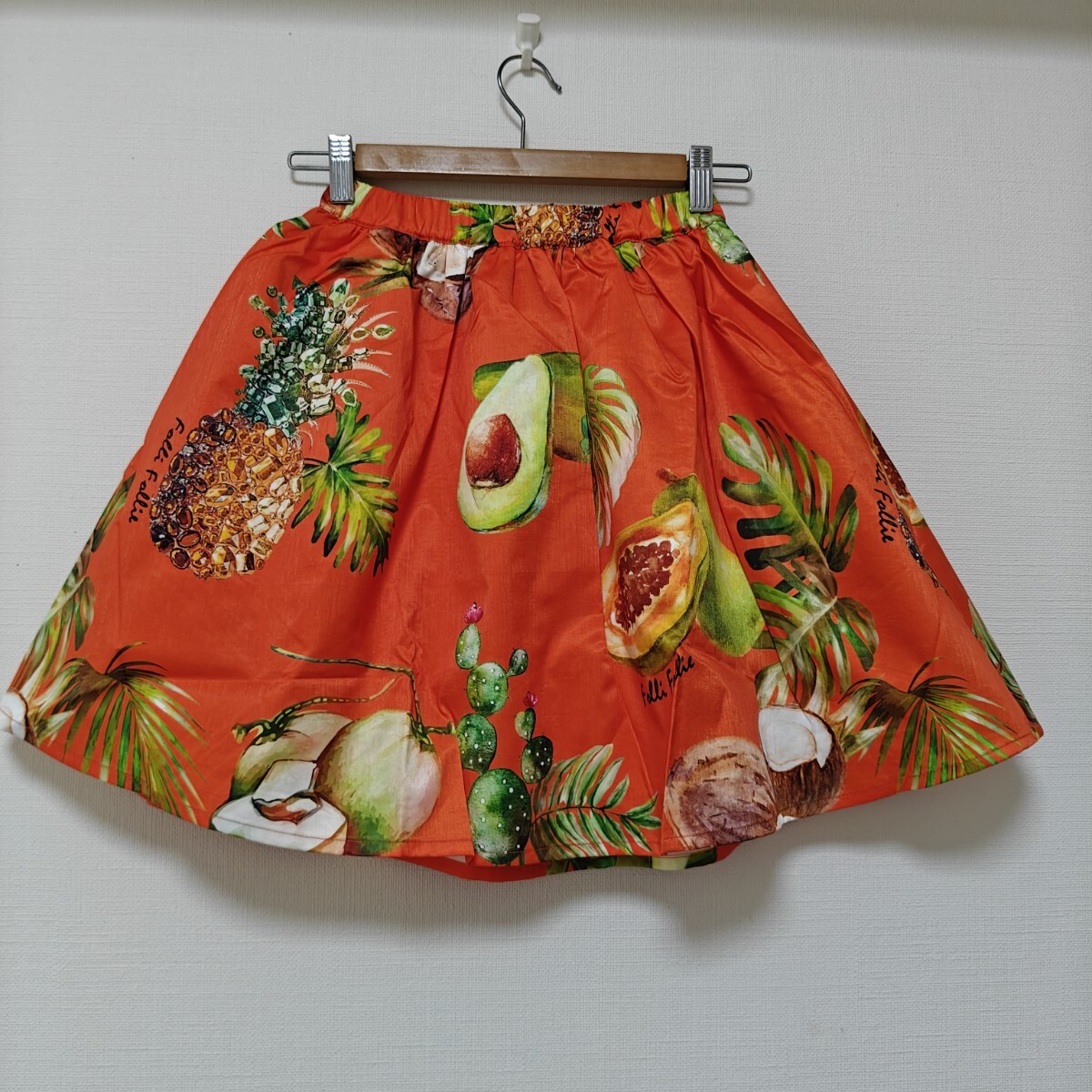 鮮やかなオレンジ色のフルーツ柄スカート、コットン素材で快適な着心地。