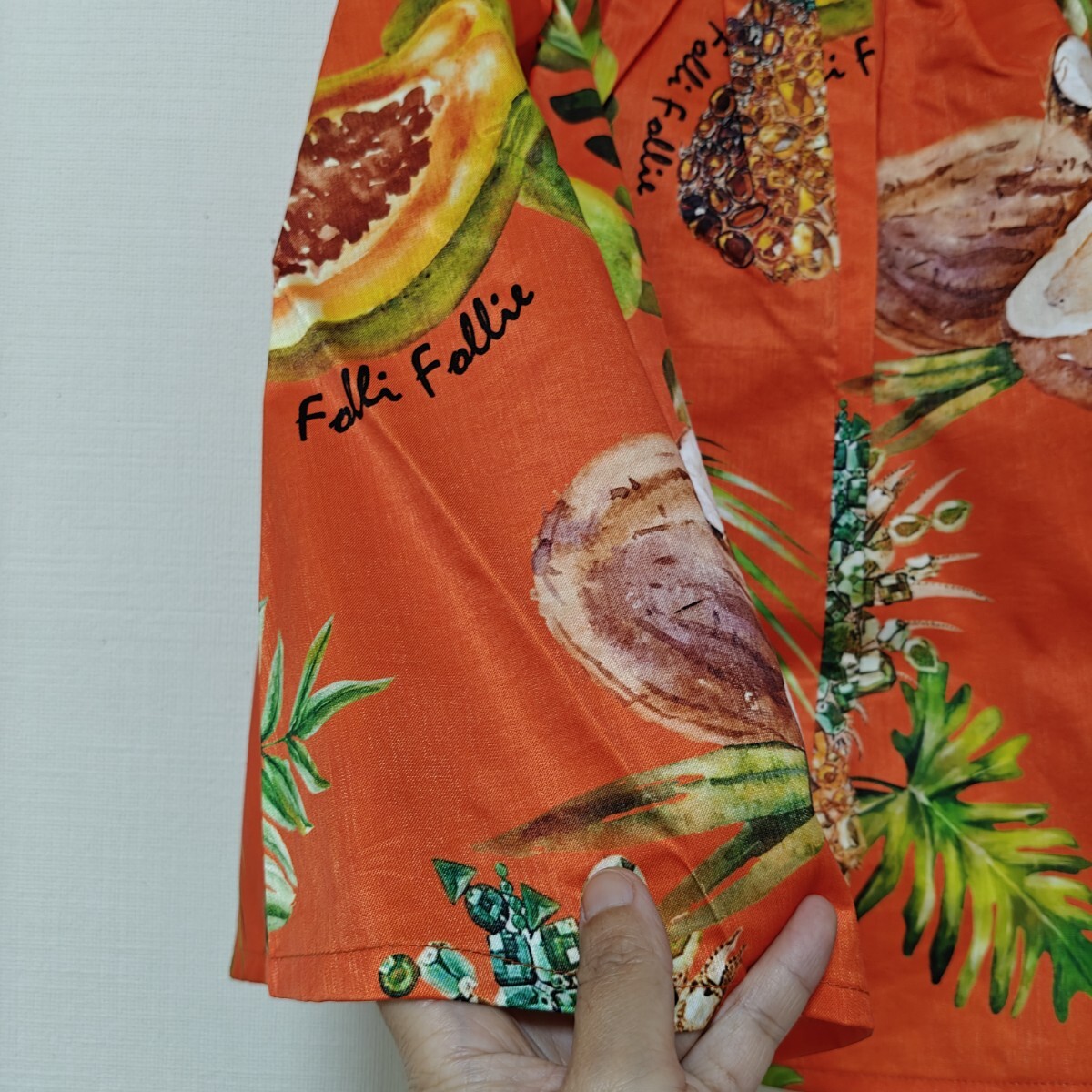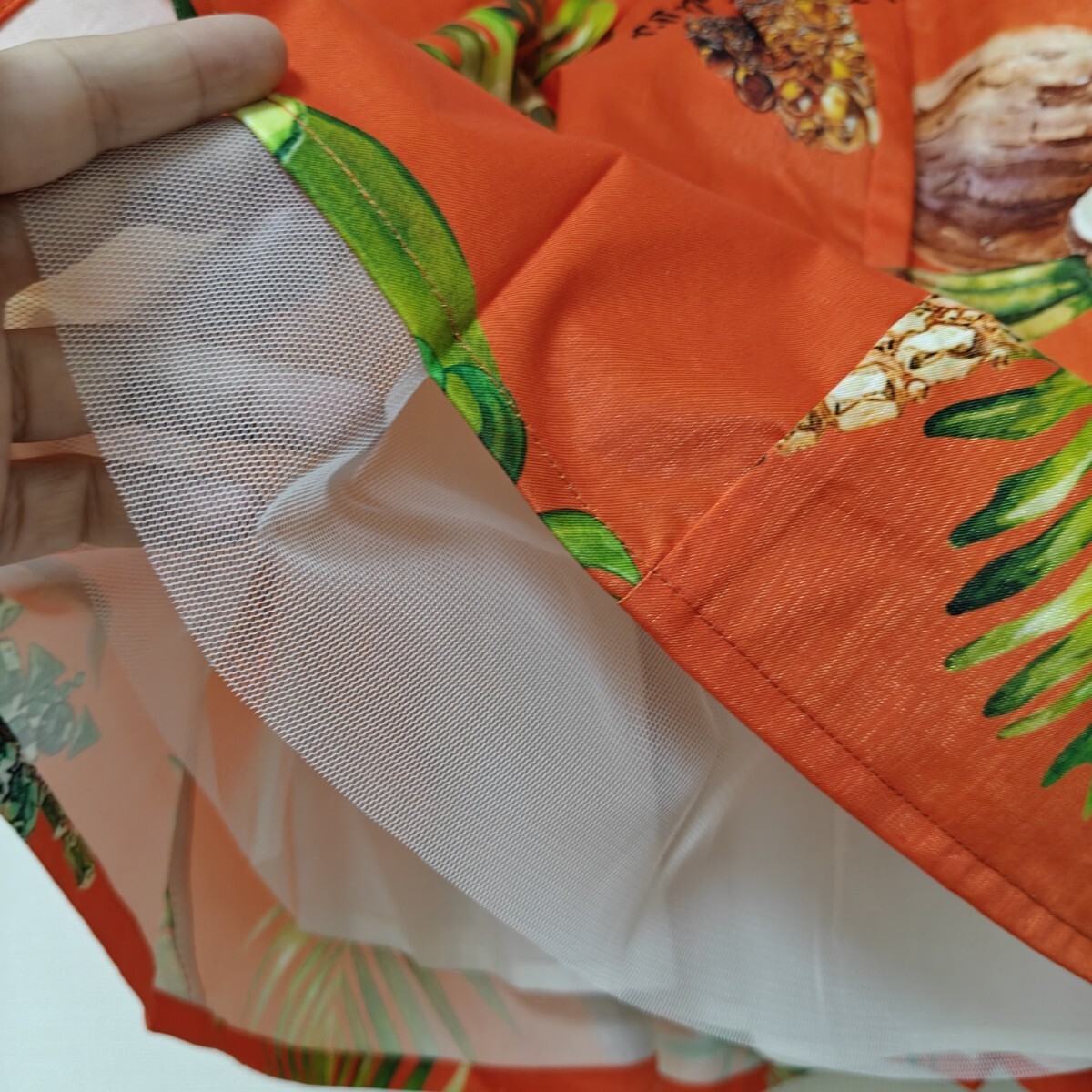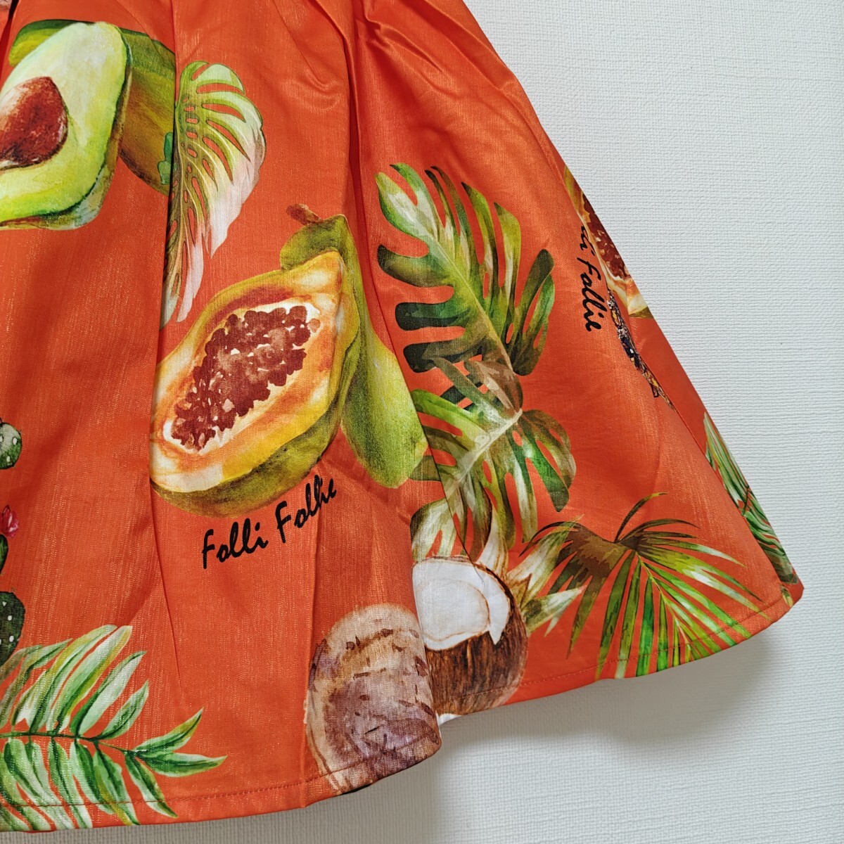 鮮やかなオレンジ色のフルーツ柄スカート、コットン素材で快適な着心地。