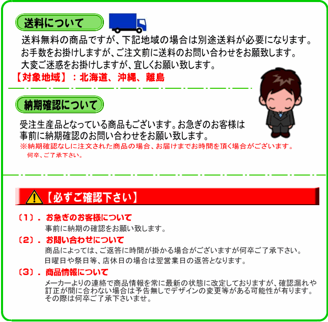 | (1).お届先が「北海道・沖縄・離島」(※商品によっては「東北」を含む)の場合は 別途送料が掛かります。 お届先の情報をもとに送料を設定させて頂きますので、お支払については 当店より送料のお知らせの後にお願い致します。 (2).一部商品については「個人様宅」へのお届の場合、別途送料が掛かる場合が ございます。 (3).送料のお問い合わせの際は、以下の情報をご連絡下さい。 ・お届け先の郵便番号 ・お届け先が「個人様宅」or「法人様」 |