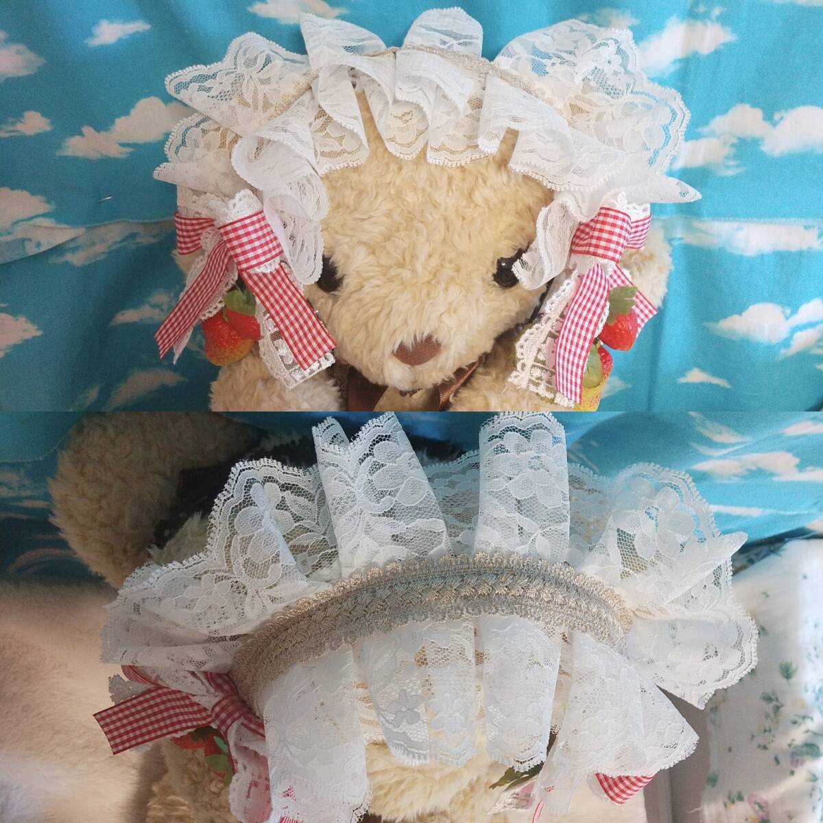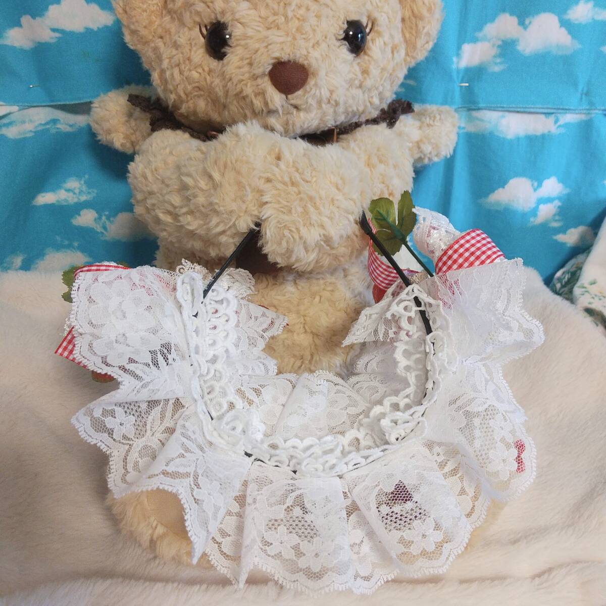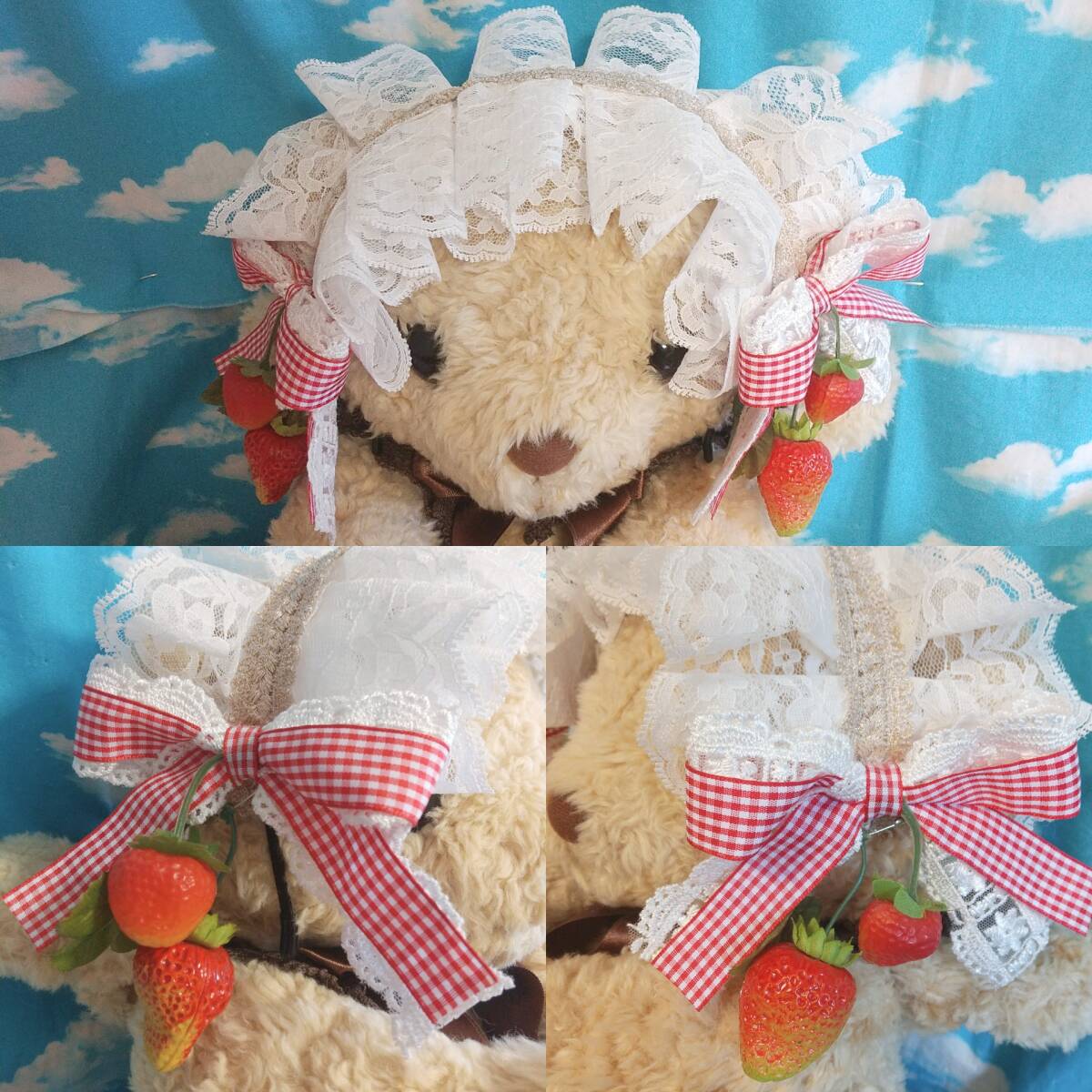 状態についての特記 元々付いていた一部のレースが気に入らなかった為切り外し、元々付いていた苺以外に、リボンの真ん中部分にも安全ピンで苺を付けてリメイクしています(取り外し可能)。未使用で、部屋に飾っていました。軽く粘着ローラーをかけています。特に汚れや破損などはなく状態は普通です。