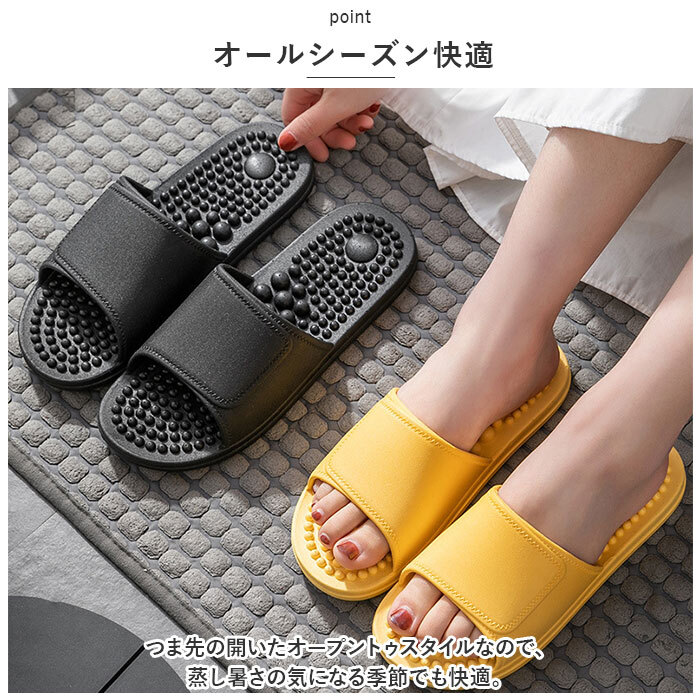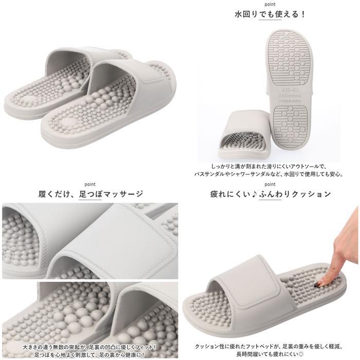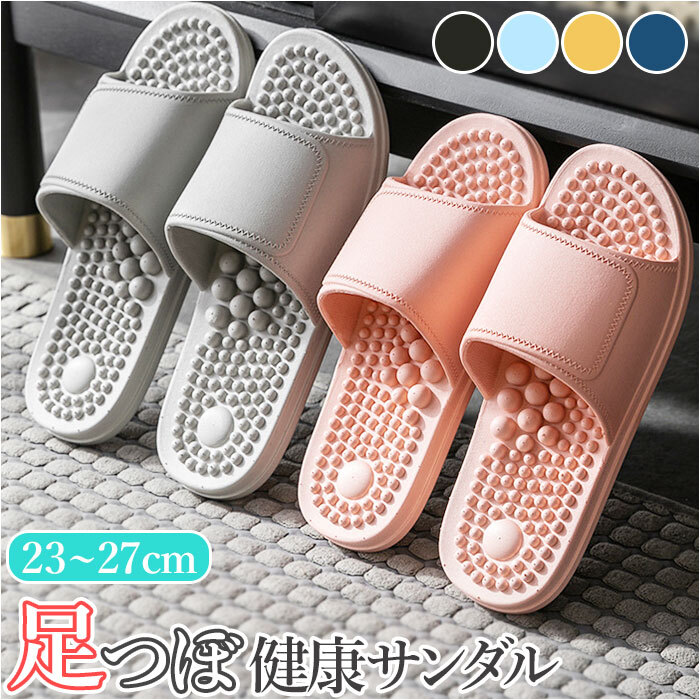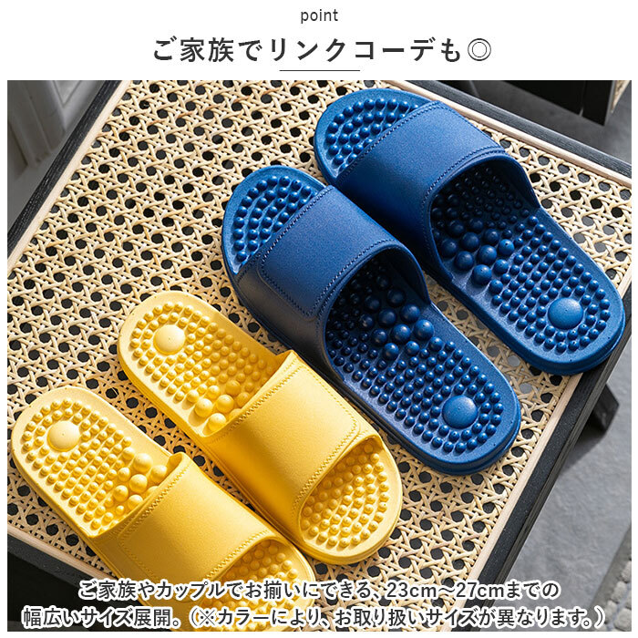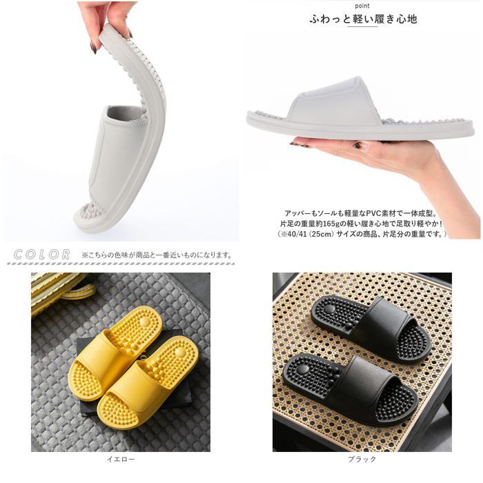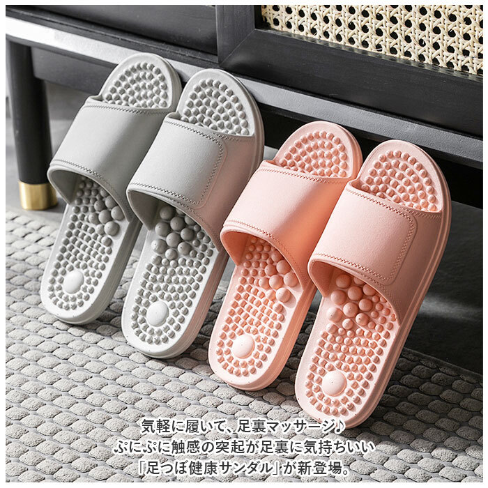 | 商品説明 | ・・気軽に履いて、足裏マッサージ♪ぷにぷに触感の突起が足裏に気持ちいい「足つぼ健康サンダル」が新登場。 ・【履くだけ、足つぼマッサージ】 ・大きさの違う無数の突起が、足裏の凹凸に優しくフィット!足つぼを心地よく刺激して、足の裏から健康に! ・【疲れにくい♪ふんわりクッション】 ・クッション性に優れたフットベッドが、足裏の重みを優しく軽減。長時間履いても疲れにくく、家事の間に履くだけで手軽に健康づくりをスタート。 ・【ふわっと軽い履き心地】 ・アッパーもソールも軽量なPVC素材で一体成型。片足の重量約165gの軽い履き心地で足取り軽やか!(※40/41(25cm)サイズの商品、片足分の重量です。) ・【オールシーズン快適】 ・つま先の開いたオープントゥスタイルなので、蒸し暑さの気になる季節でも快適。 ・【水回りでも使える!】 ・しっかりと溝が刻まれた滑りにくいアウトソールで、バスサンダルやシャワーサンダルなど、水回りで使用しても安心。 ・【ご家族でリンクコーデも◎】 ・男性も女性もぴったりサイズが見つかる!ご家族やカップルでお揃いにできる、23cm~27cmまでの幅広いサイズ展開。(※カラーにより、お取り扱いサイズが異なります。イエロー・ピンク・スカイブルーは23cmから25cmまで。グレー・ネイビーは25cmから27cmまでとなります。ご注意ください。) ・【インテリアに馴染むカラー】 ・インテリアに馴染むベーシックカラー&くすみカラーのバリエーション。ルームシューズやオフィス用サンダルにもオススメ。 |