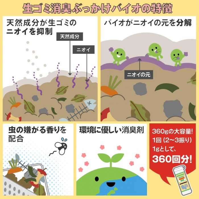 ◆ 生ゴミ消臭 ぶっかけバイオ 虫よけ剤入 ◆ シンクやゴミ箱の生ゴミに振り掛けるだけで臭いを消臭します。 注:写真はイメージです。 【商品仕様】 |