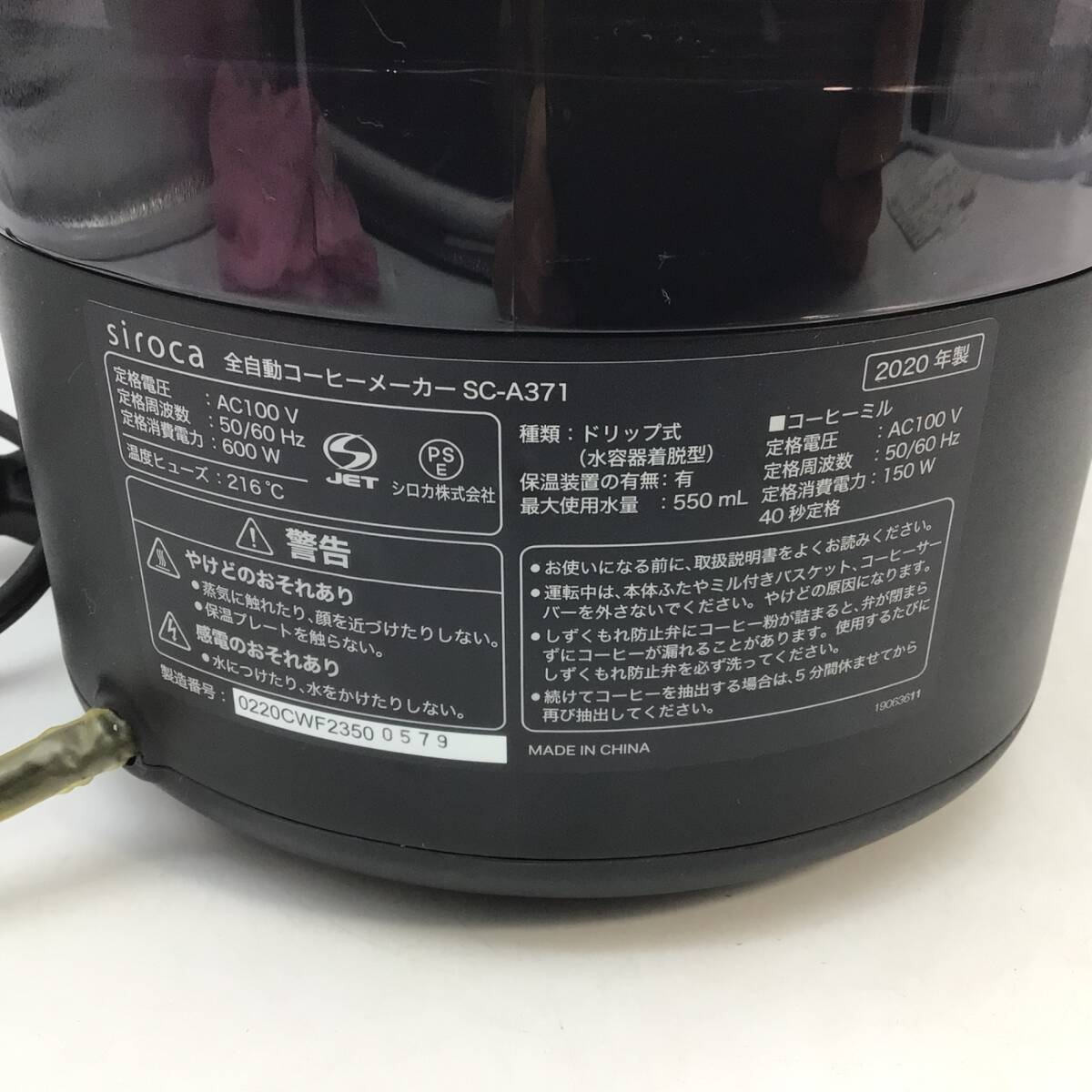 | 商品説明 | ・Siroca シロカ 全自動コーヒーメーカー SC-A371 ブラック 2020年製 ドリップ式 ステンレスサーバー付き 1点です ・電源を入れて、動作することを確認いたしました。 ・実際に使用していたため、若干のくすみ汚れがあります。また使用感もございます。 ・お品物に芳香剤か洗剤の香りがします。 ・写真に写っているものが全てです。 |
