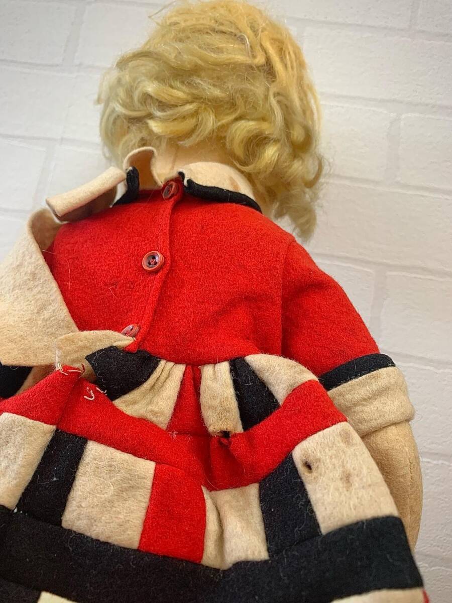 ドレスはLenciドールらしい、フェルトを用いた鮮やかな赤・黒・生成りの格子柄のスカートが特徴的。