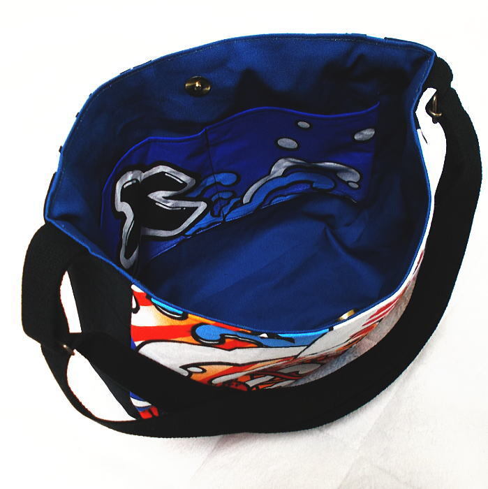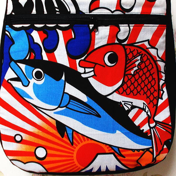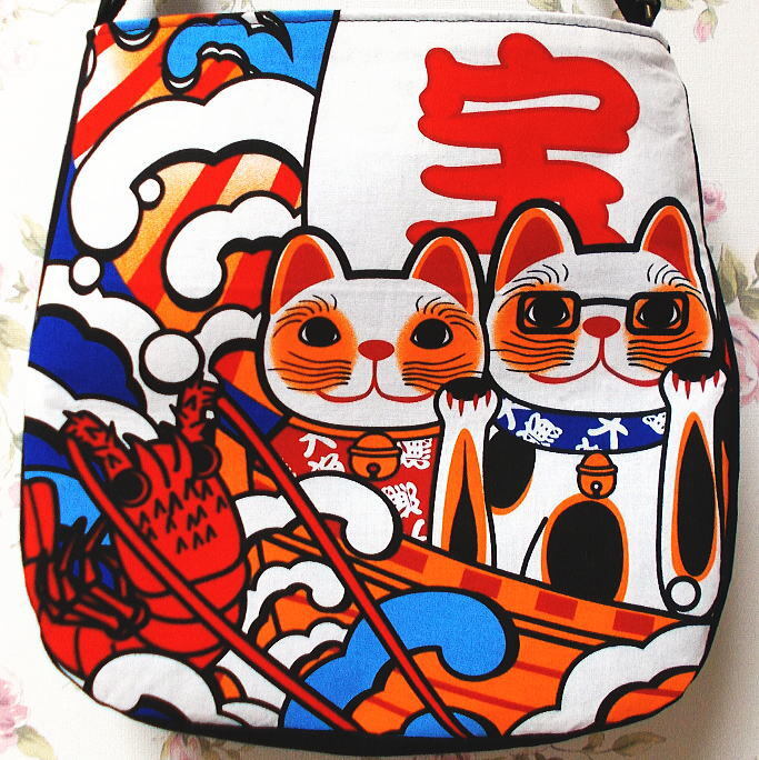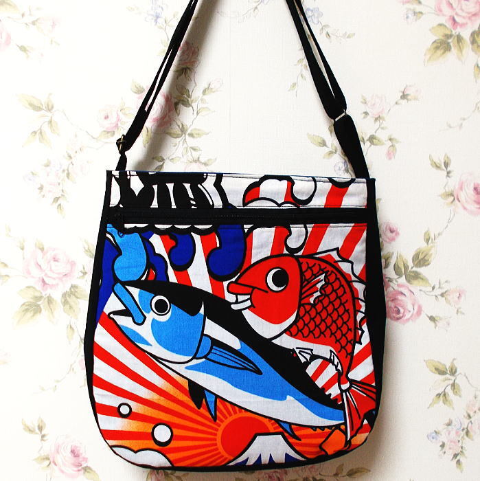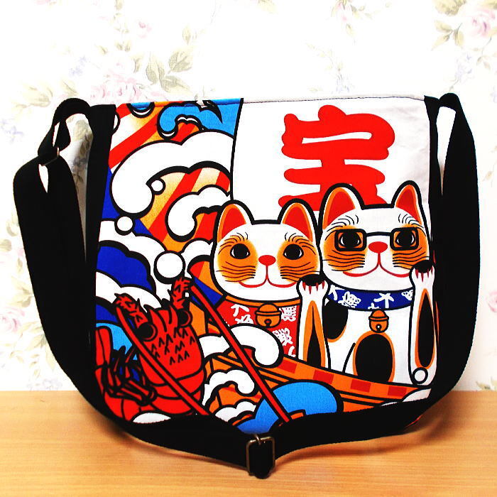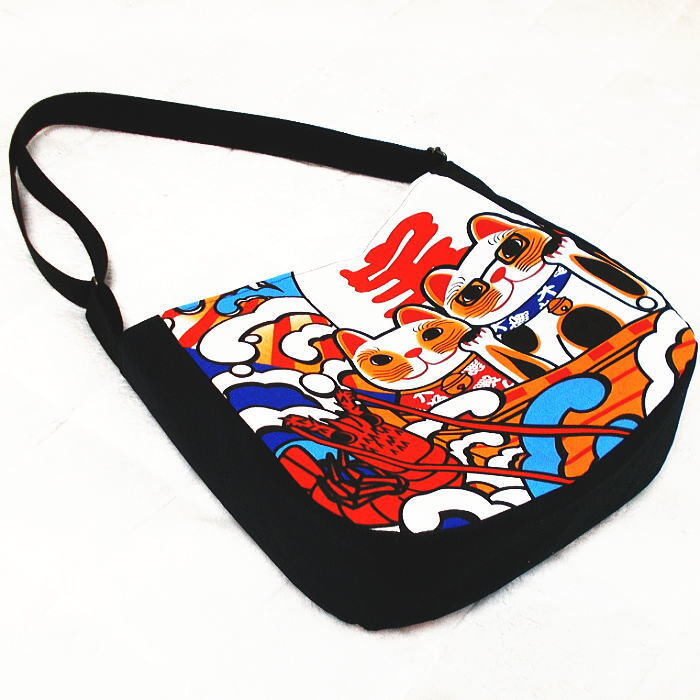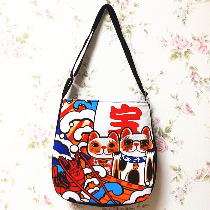 和柄丸みショルダーバッグ 大漁宝船 まねき猫 出世魚 ファスナーポケット付き ななめ掛けバッグ メンズ レディース