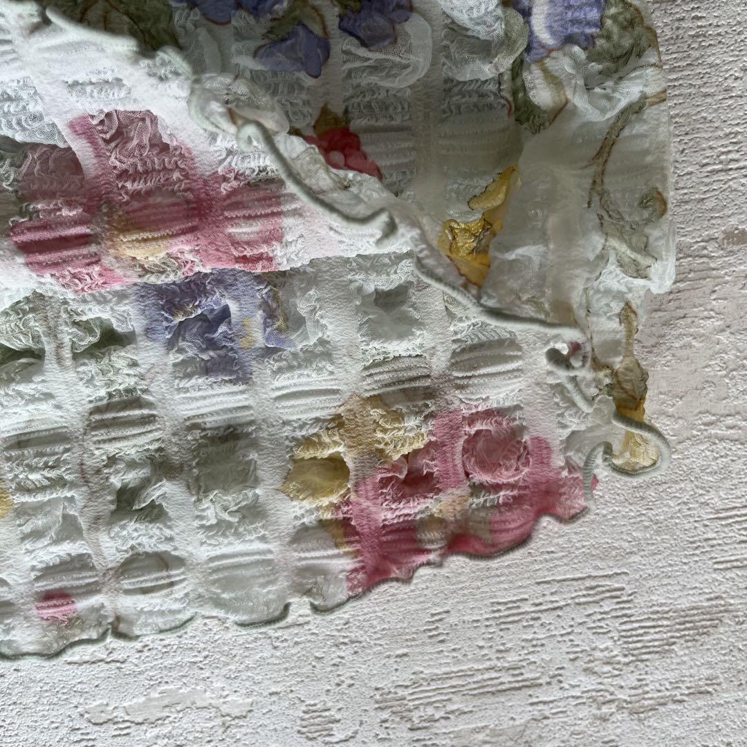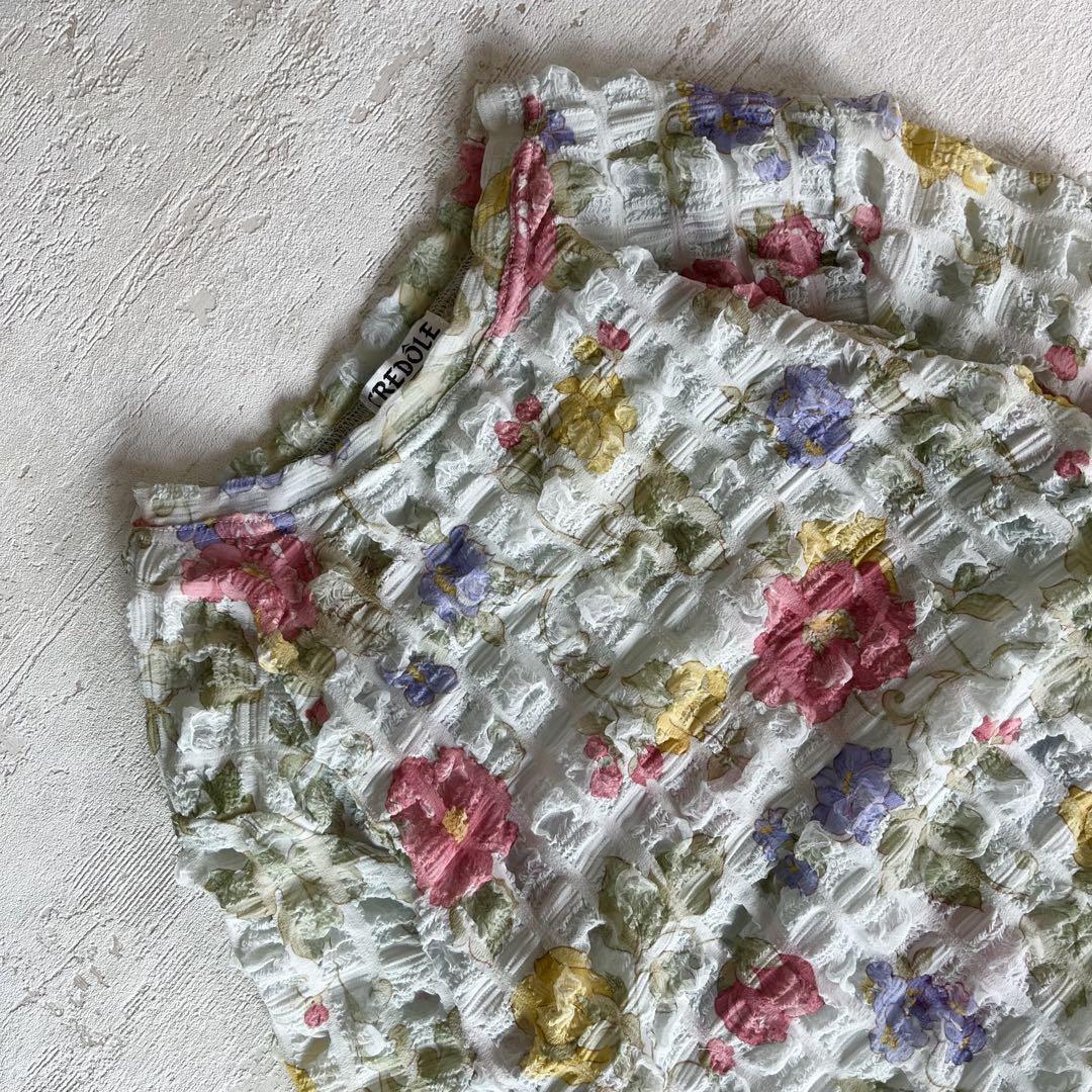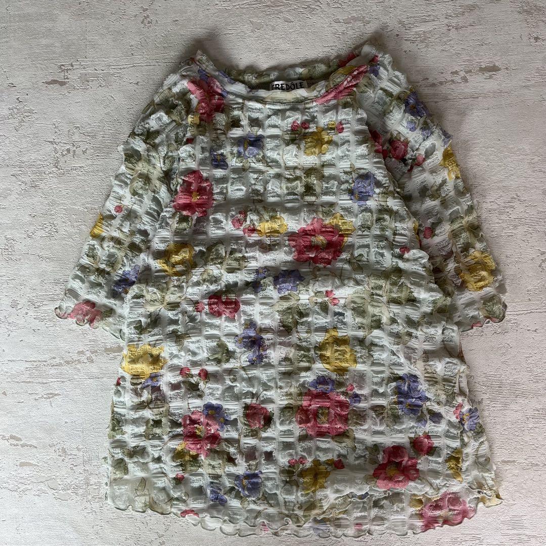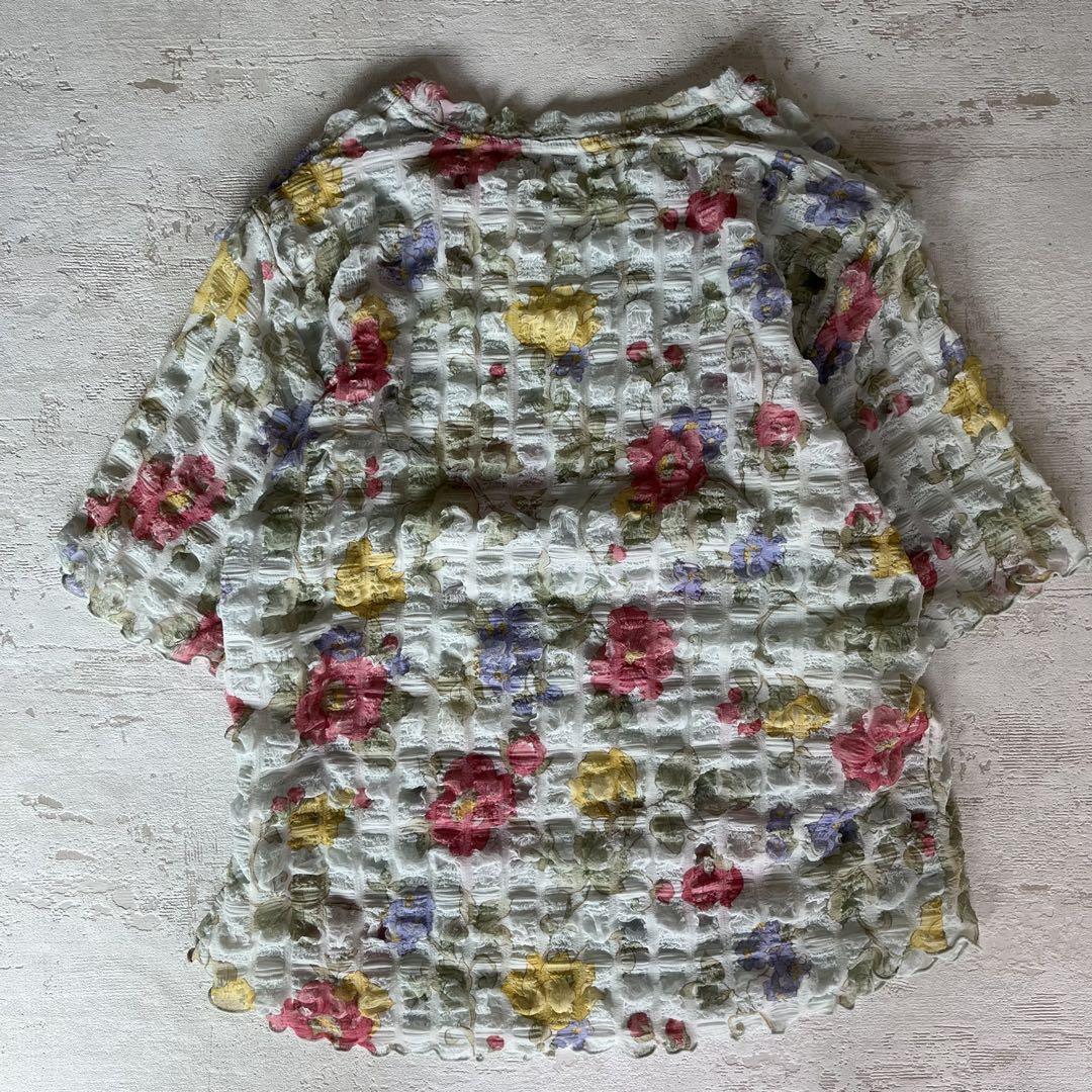 昭和レトロぽこぽこデザイン半袖カットソー花柄デザイン肩パッド付きブルーM-LL1