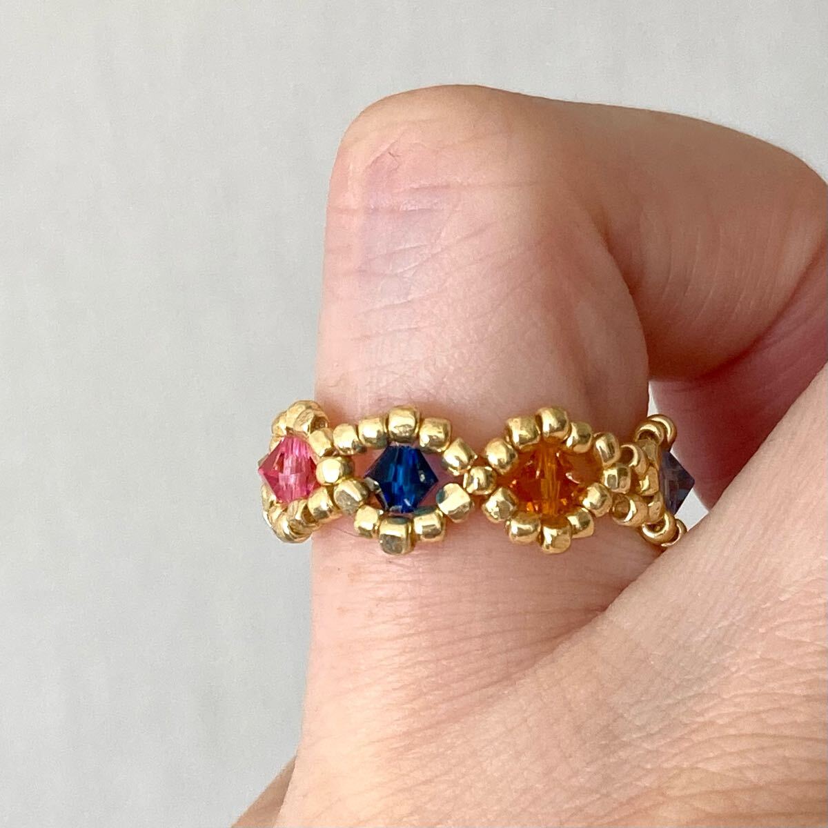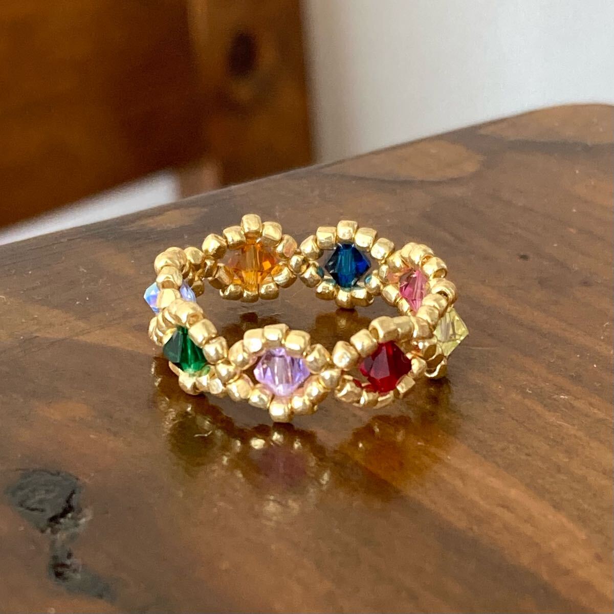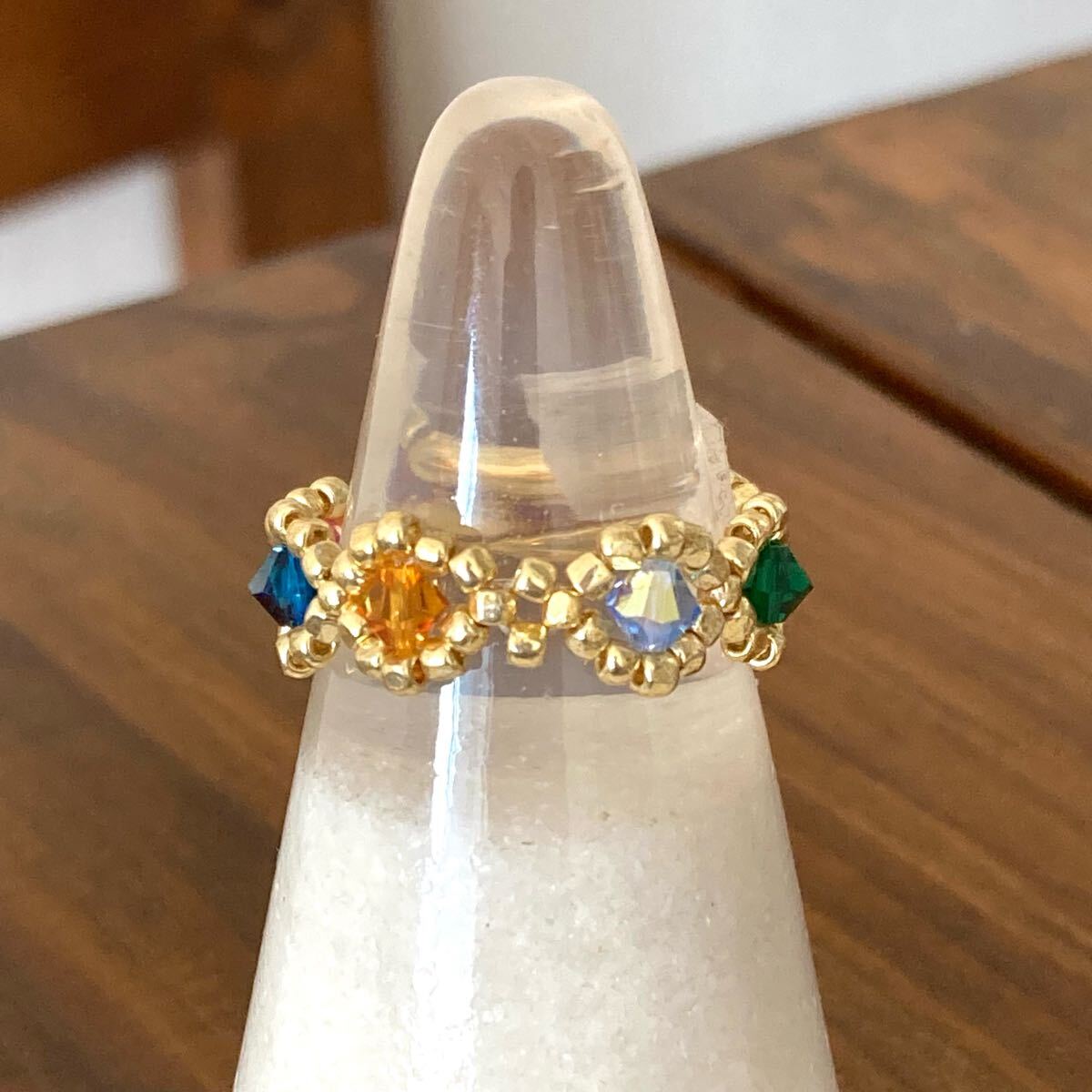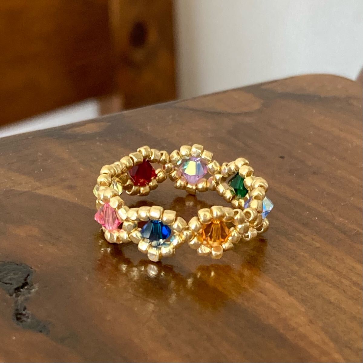 4mmのカラフルなスワロフスキー、ゴールドのスリーカットビーズで作ったリングです。