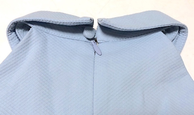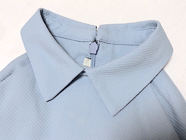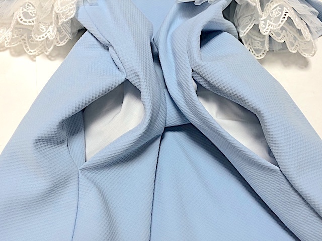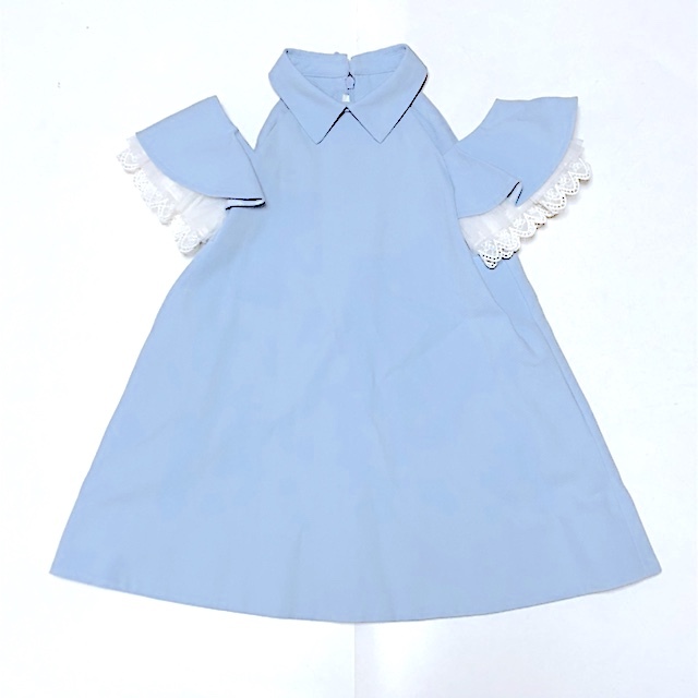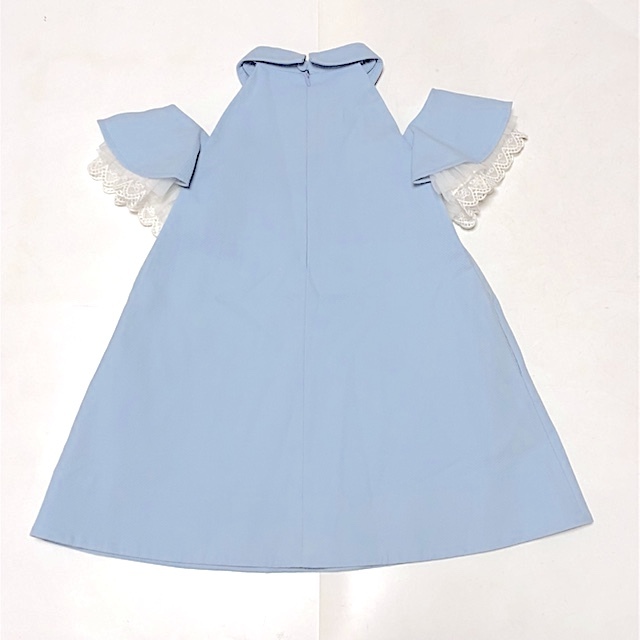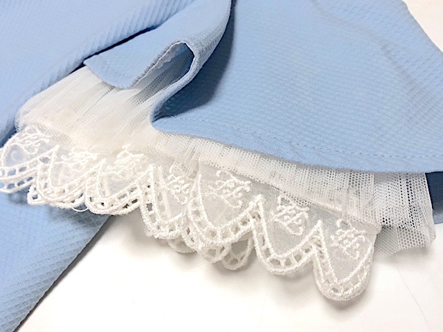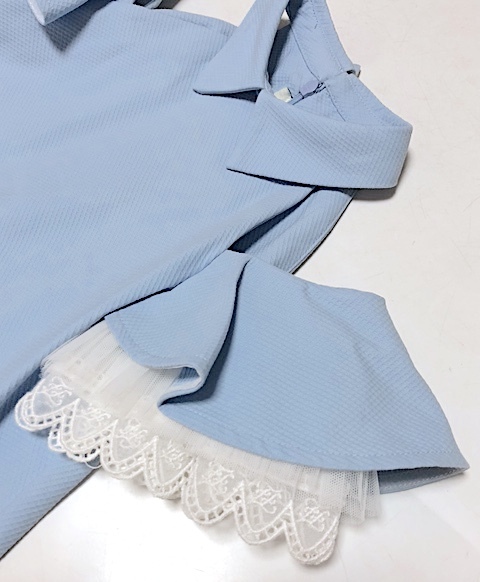淡いサックスブルーの本体に、袖のフリルとレースのディテールが上品で愛らしい一着。