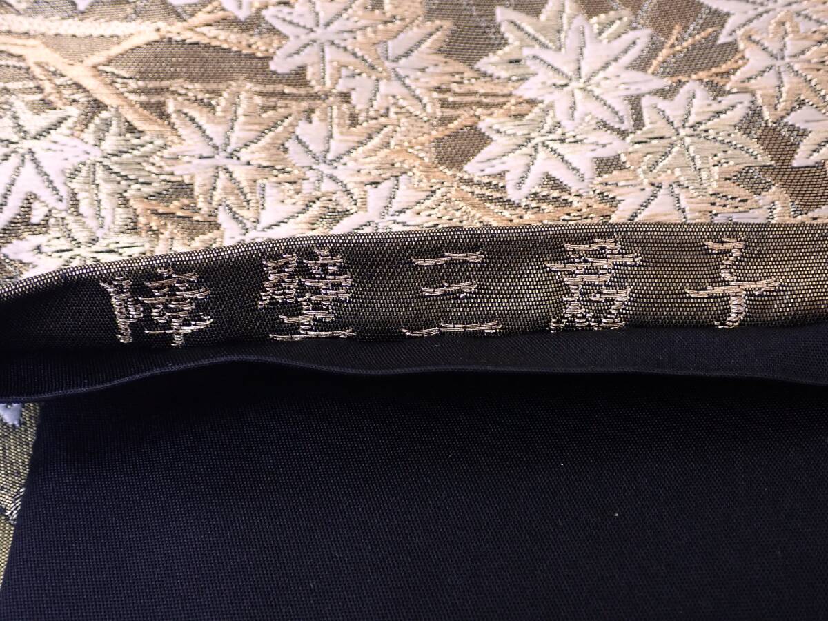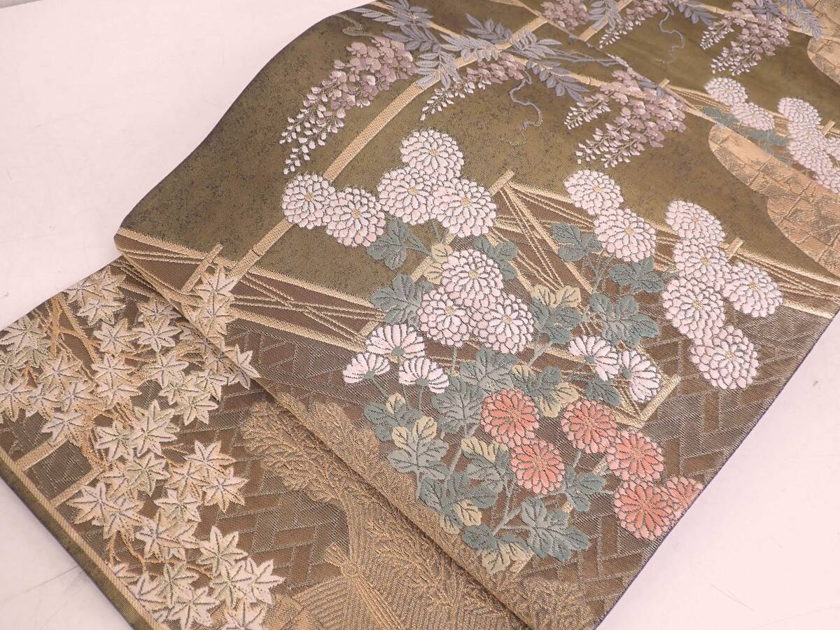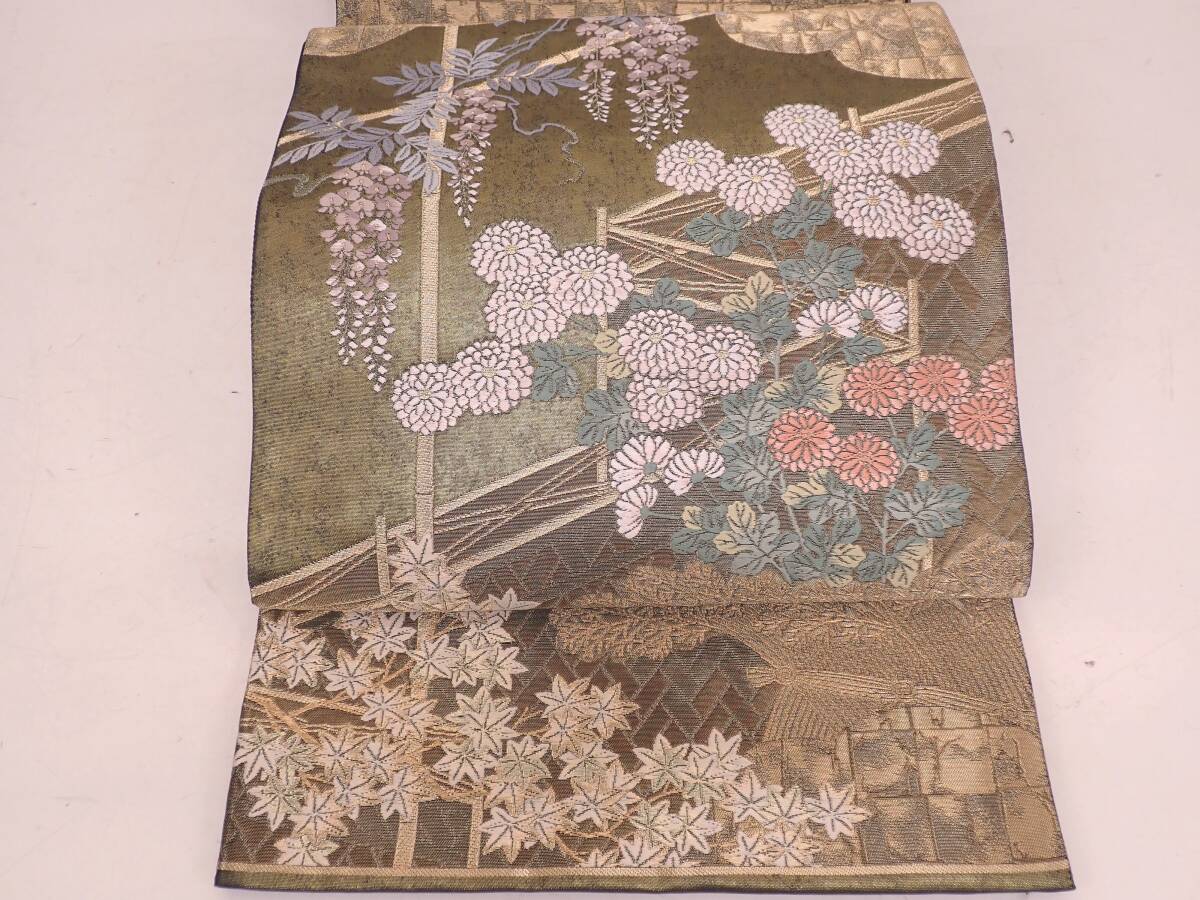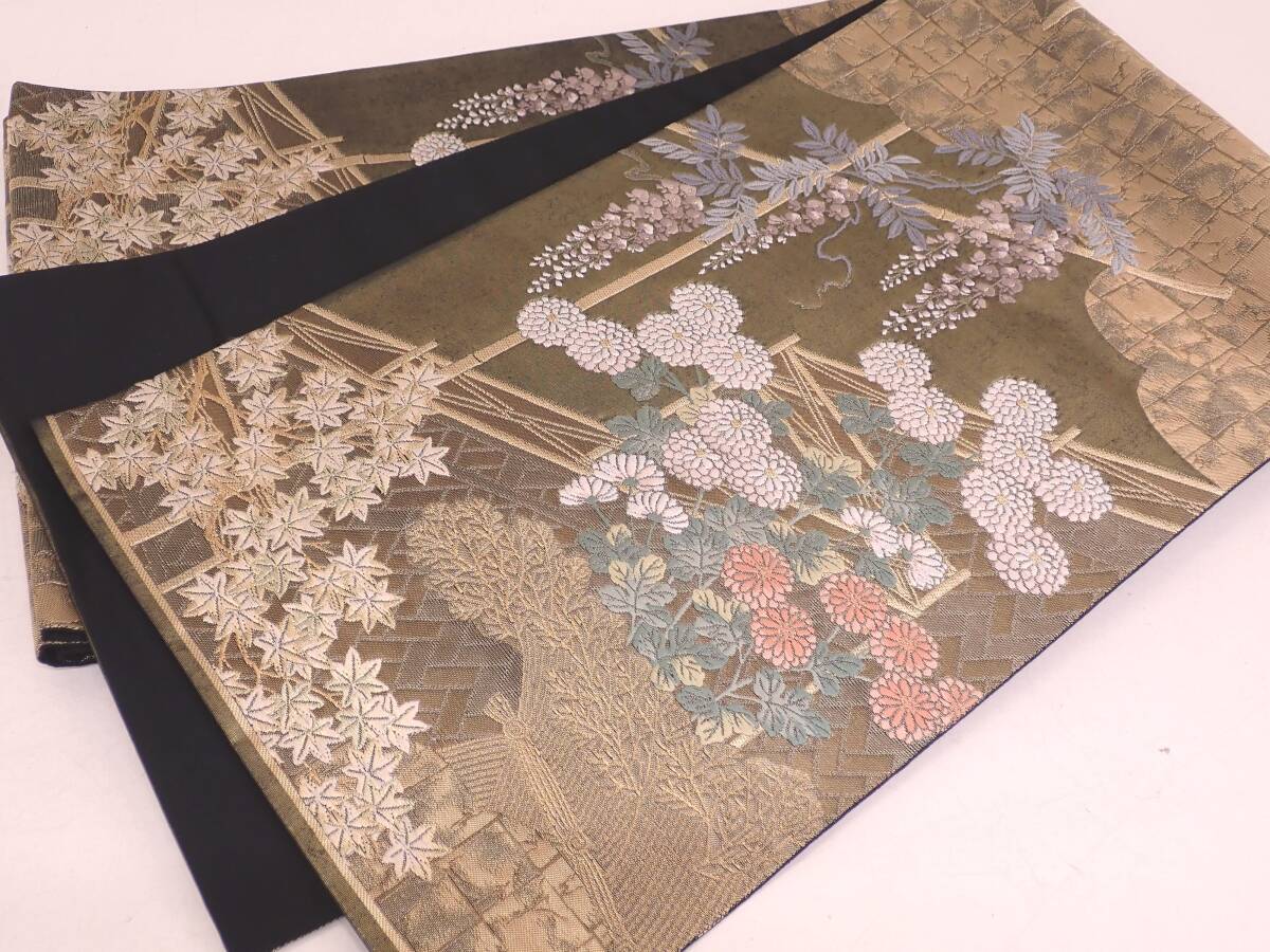 秀品 正絹 袋帯 障壁三君子 季節草花文 金糸 唐織 30.5cm×442cm | ||||