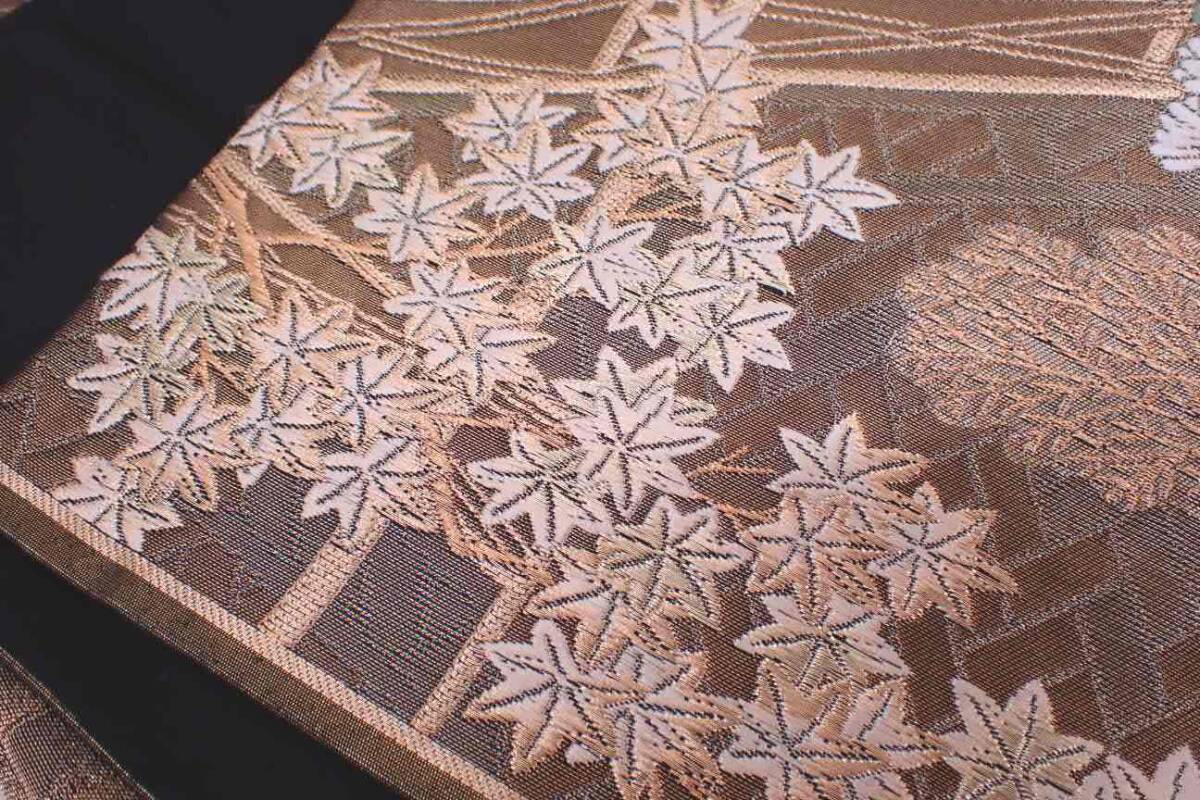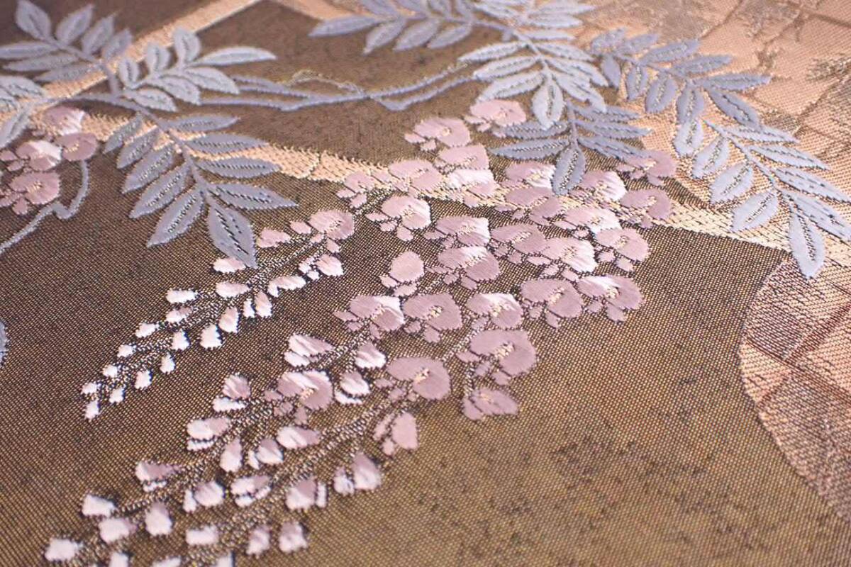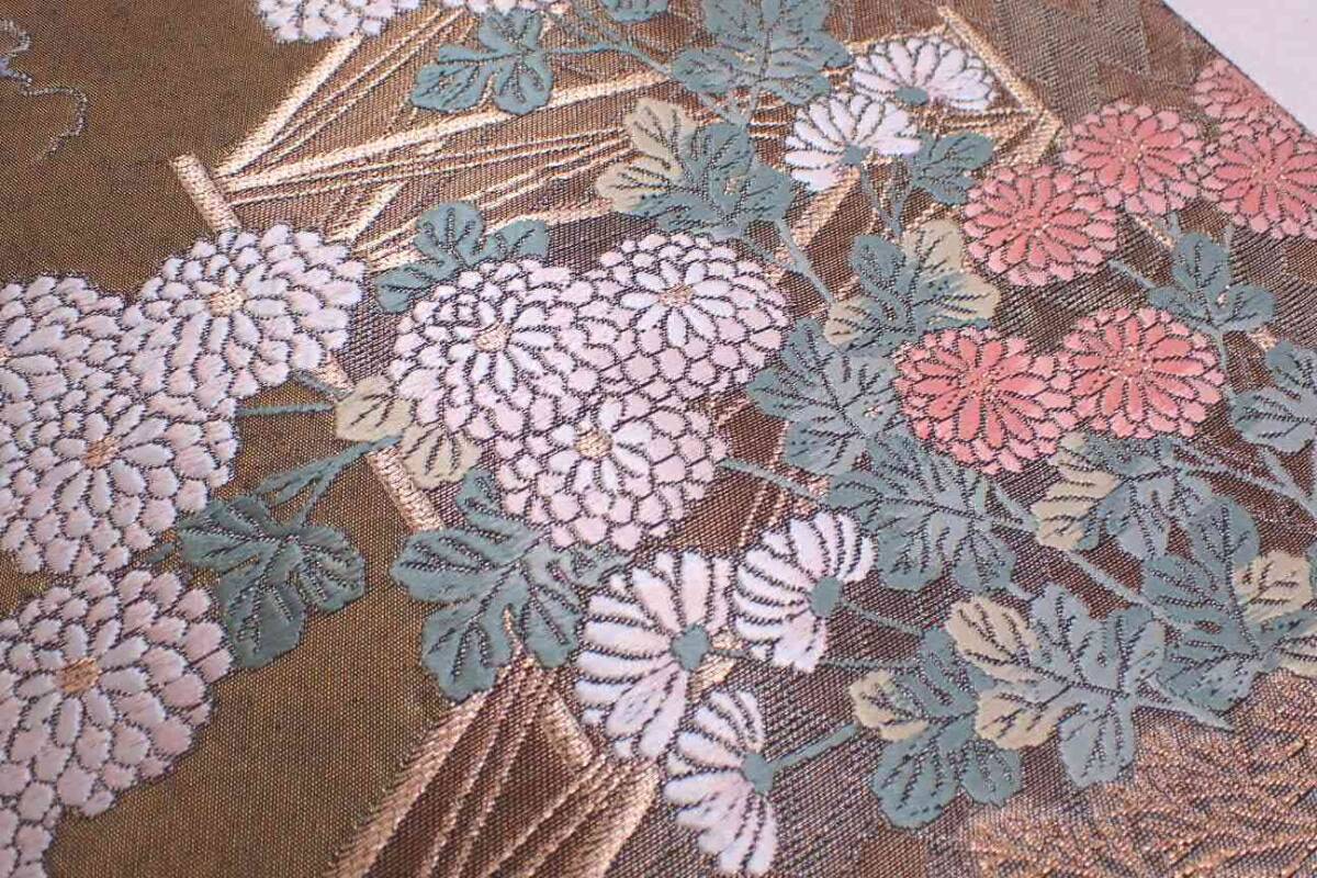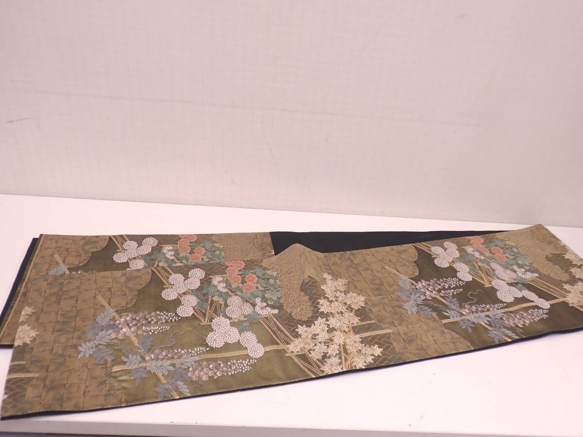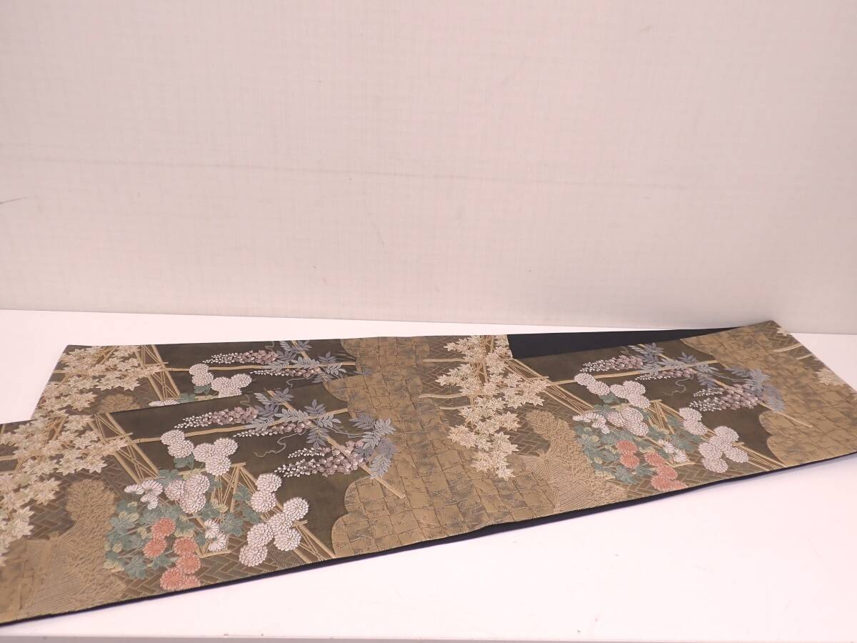 秀品 正絹 袋帯 障壁三君子 季節草花文 金糸 唐織 30.5cm×442cm | ||||