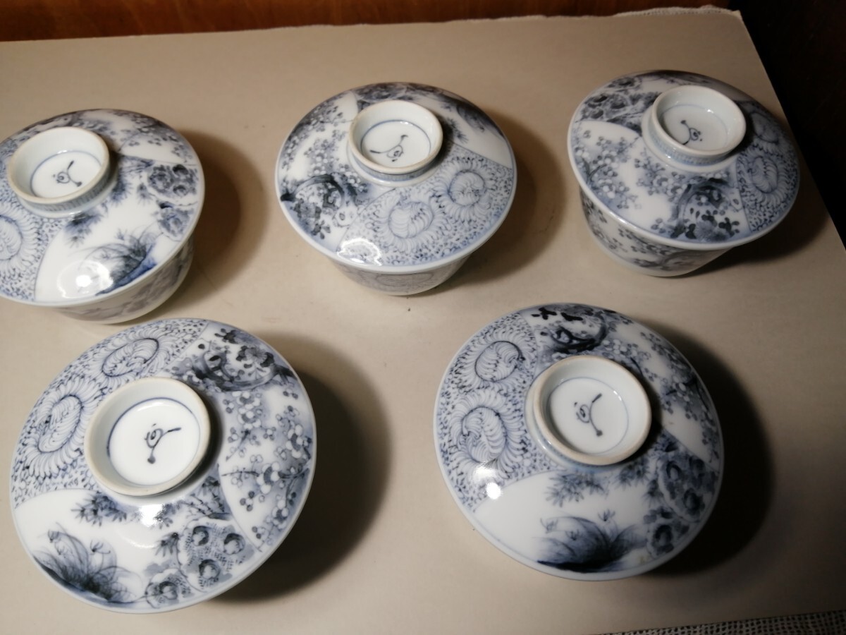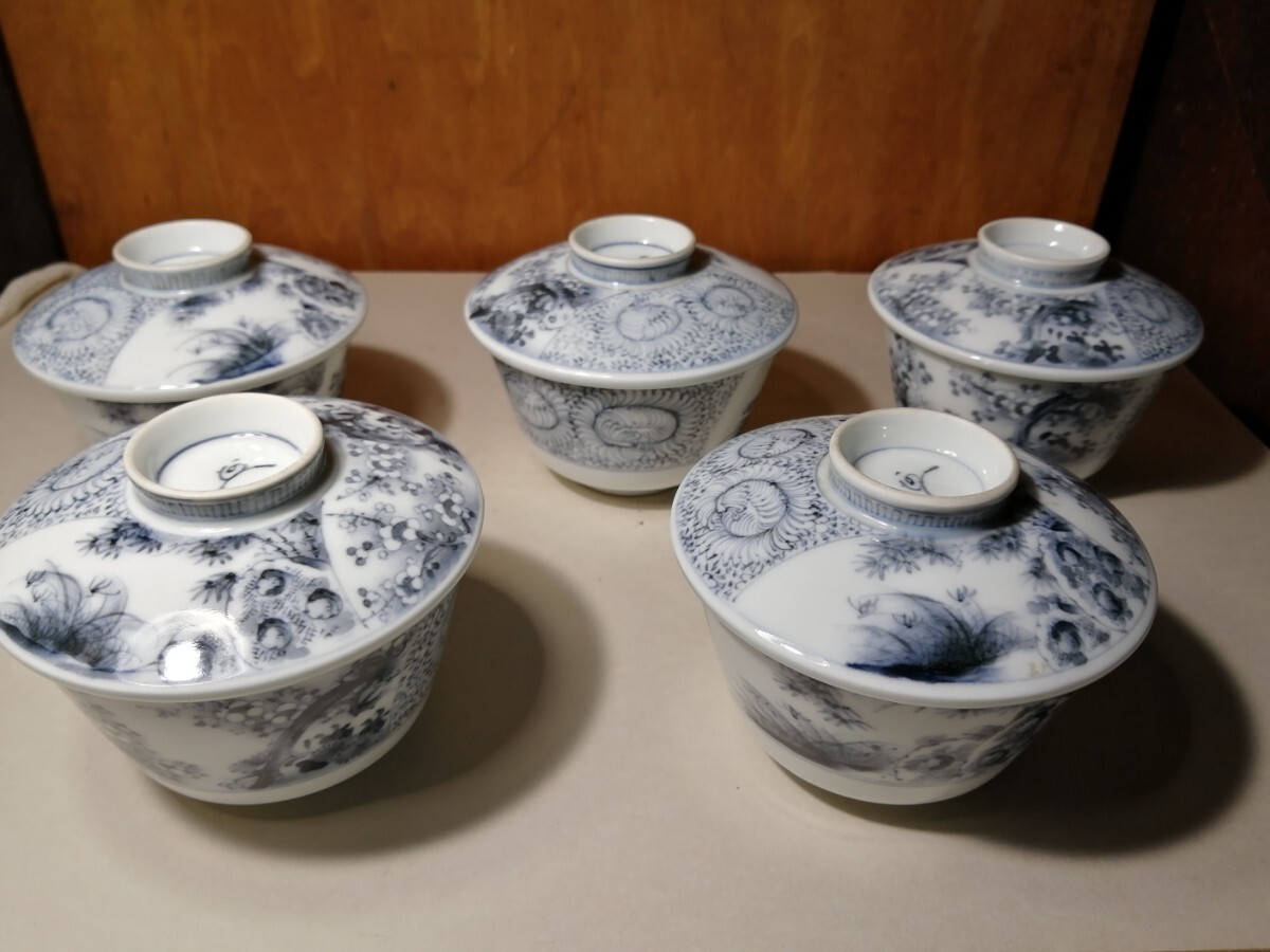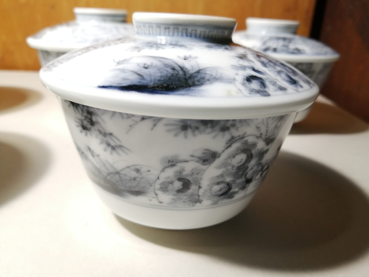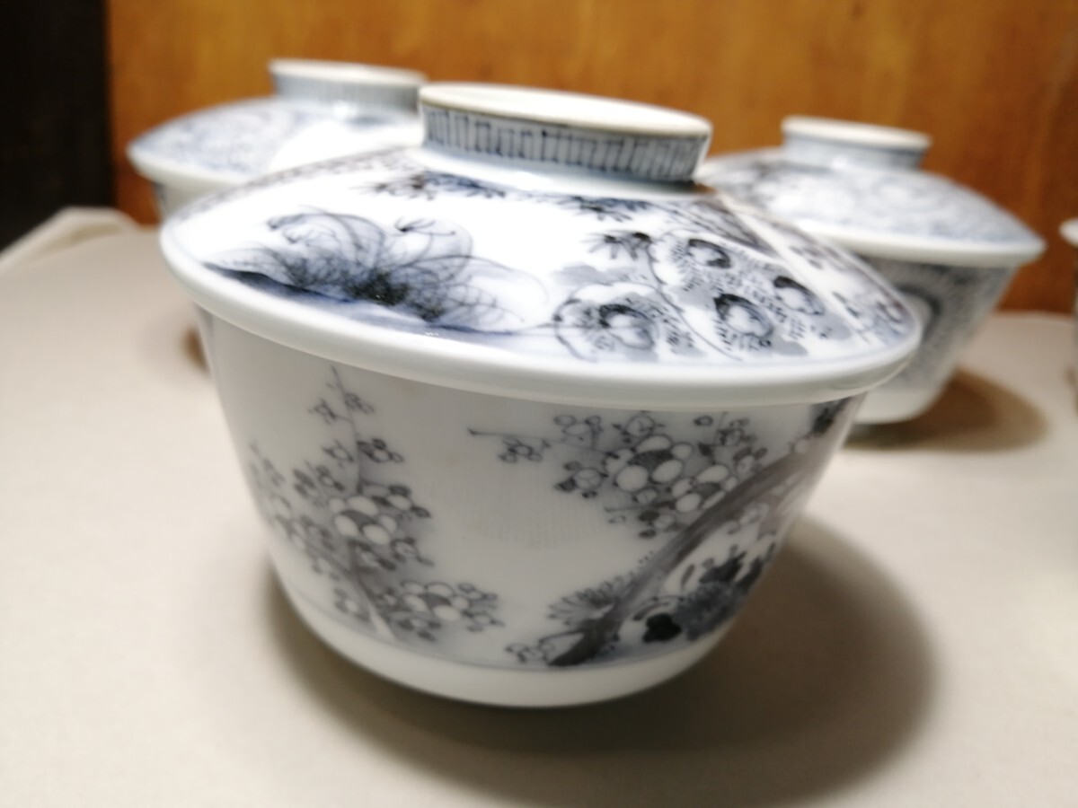 明治の伊万里の茶碗5客です。墨染付で春蘭や竹、梅が描かれています。墨染は有田のウラニウムで下絵を描き、還元焼成したものです。