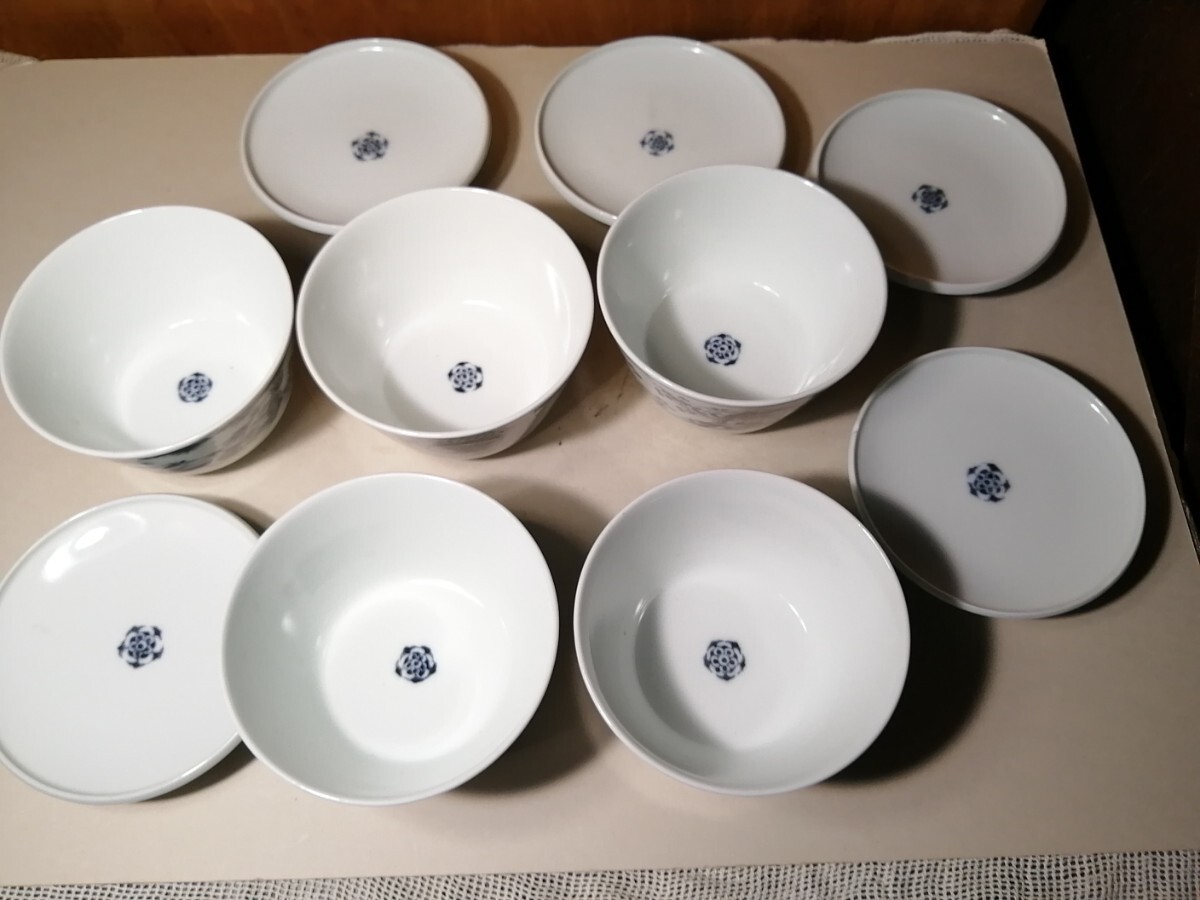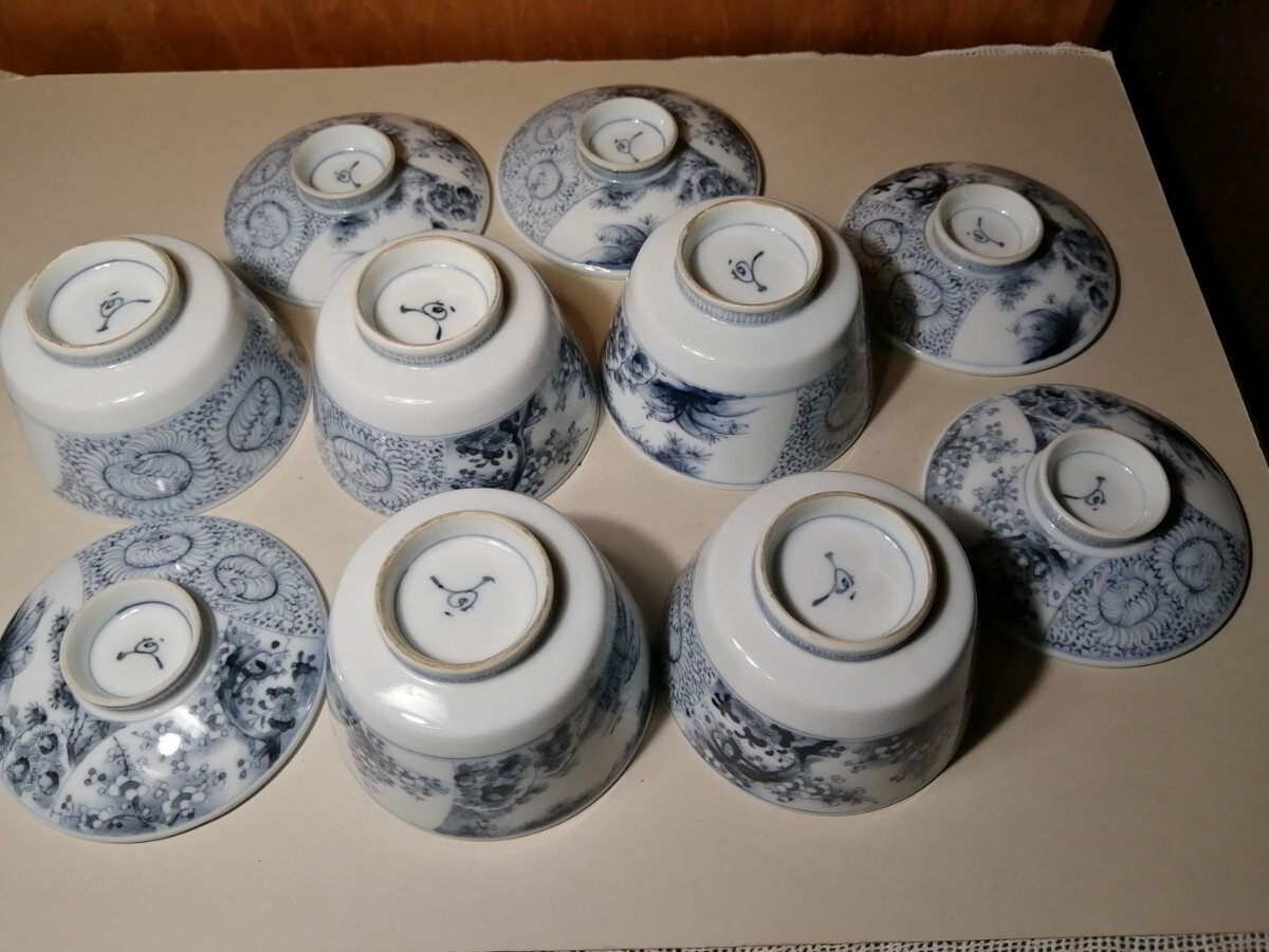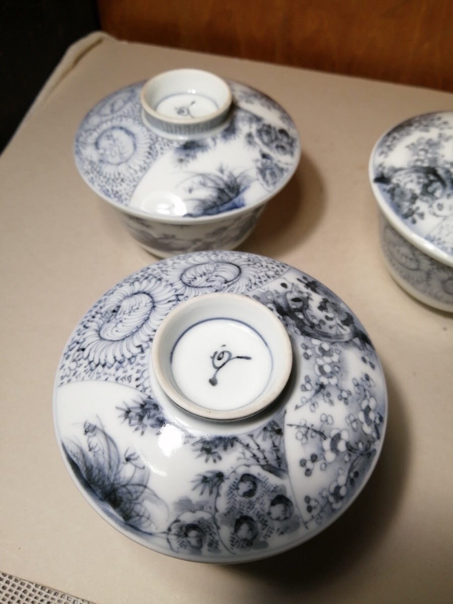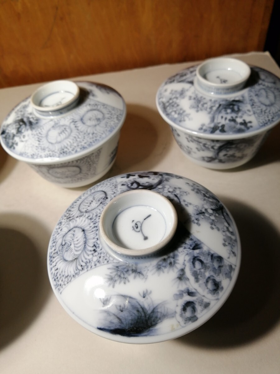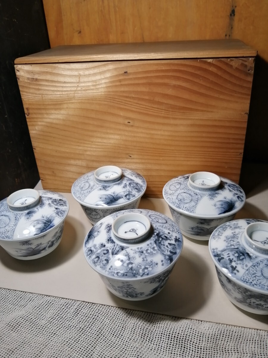 明治の伊万里の茶碗5客です。墨染付で春蘭や竹、梅が描かれています。墨染は有田のウラニウムで下絵を描き、還元焼成したものです。