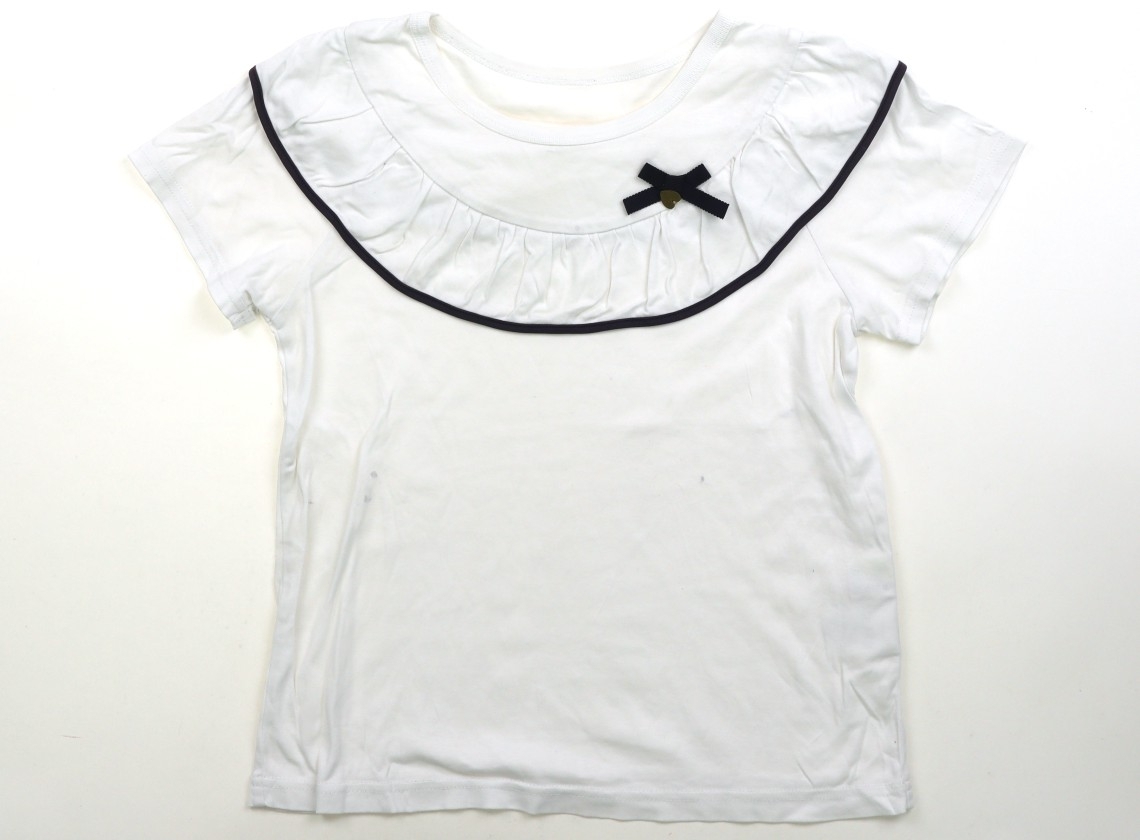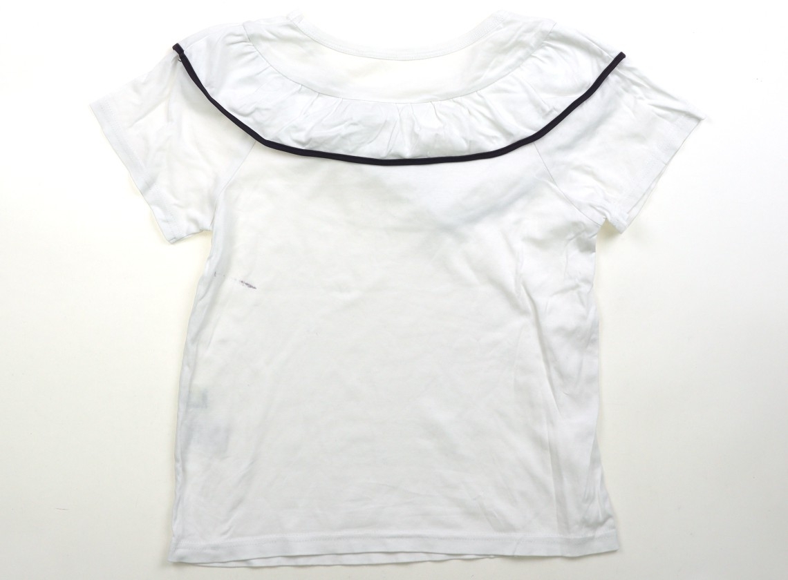 前後ろともに薄い紫のシミ汚れが点在しています。前のリボン下のプレートはこすれたような跡もあり、使用感は強めです。