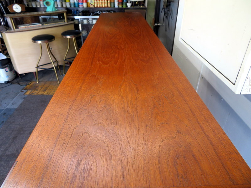 天板に薄い線傷程度は御座いますのと、端部に小さなリペアを必要とする程度で目立つ傷はなく、概ね良好な状態を保って入荷を致しましたが、外部の塗膜は経年でクスミが御座いましたので剥離し、削り直しをした後にオイルとワックスを再施工致しました。