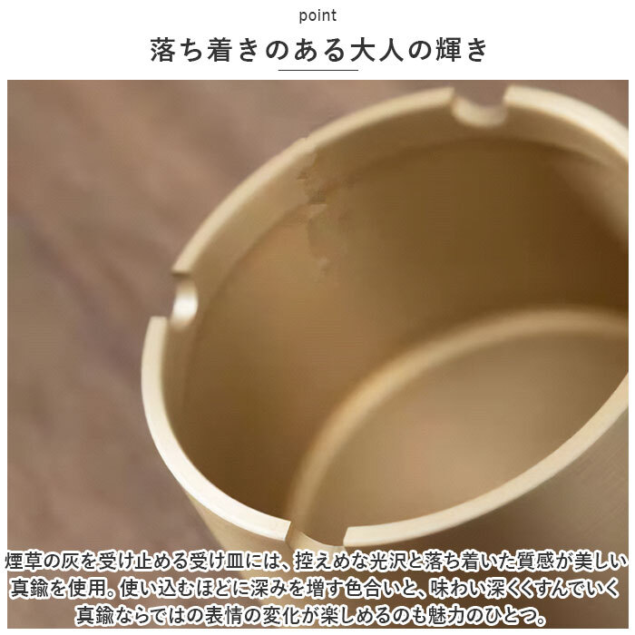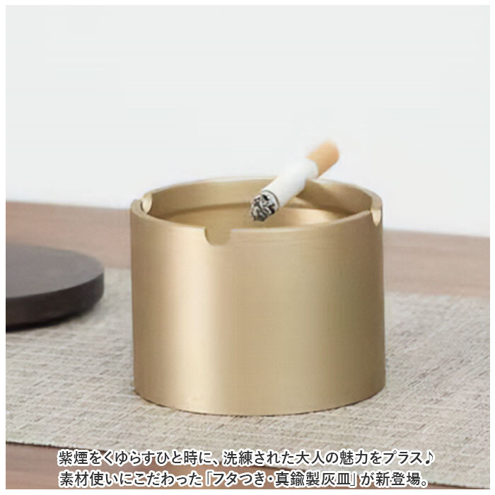 商品説明 | ・・紫煙をくゆらすひと時に、洗練された大人の魅力をプラス♪素材使いにこだわった「フタつき・真鍮製灰皿」が新登場。 ・【ヴィンテージ感のある素材使い】 ・上品な輝きを放つ真鍮製の受け皿に、ナチュラルな天然木のフタを合わせた、スタイリッシュな大人のためのアッシュトレイ。 ・【落ち着きのある大人の輝き】 ・煙草の灰を受け止める受け皿には、控えめな光沢と落ち着いた質感が美しい真鍮を使用。使い込むほどに深みを増す色合いと、味わい深くくすんでいく真鍮ならではの表情の変化が楽しめるのも魅力のひとつ。 ・【温かみを添える天然木】 ・ダークブラウンには黒檀材、ブラウンには花梨材。高級家具や楽器の材料として知られる銘木で仕上げた天然木のフタが、金属のソリッドな質感に温かみをプラス。 ・【選べる2つのデザイン】 ・灰皿にフタを被せたまま、煙草の灰が落とせる「穴あきタイプ」と、受け皿上部をすっぽりと覆うことのできる「フタつきタイプ」、2つのデザインからチョイス可能。(※フタつきタイプのみ、受け皿のフチにU字溝がデザインされています。) ・【さまざまなシーンにフィット】 ・リビングのサイドテーブルでリラックスタイムを過ごす時にはもちろん、オフィスの応接室やレストランやバーなど、スタイリッシュな空間を演出するこだわりの逸品。 |