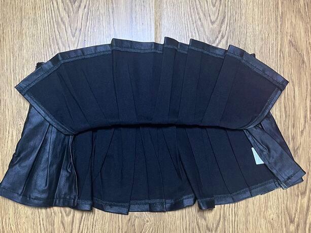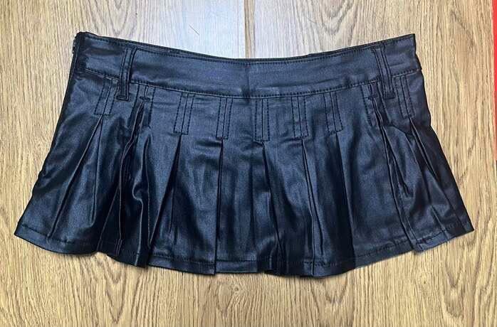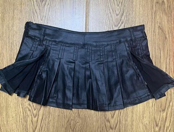 セクシーなシルエットを演出する、黒の革風プリーツスカート。 サイドに深めのスリットが入っており、動くたびに美脚がチラリと覗くデザイン。 21cmのミニ丈で、21cmほどの長さになるとヒップラインやインナーが見えることも。 思わず視線を集める、挑戦的な一着です。 ウエストはゴム仕様で伸縮性があり、履き心地も快適。 スリット部分は風を抜けやすく設計されており、意外にもめくれ上がりにくいのがポイント。 インナーなしのデザインなので、お好みのスタイルで楽しめます。 脚を美しく魅せたい方、セクシーなファッションを楽しみたい方におすすめです。 クリーニング済 発送まで1週間ほどいただいております。