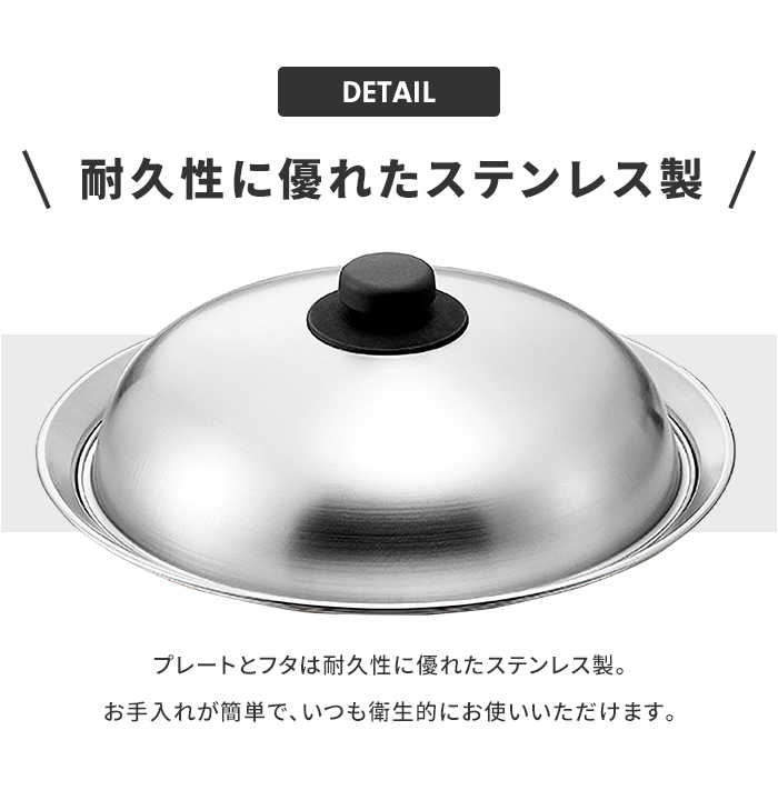 ◇材質 プレート:18-8ステンレス鋼(0.4mm厚) 蓋:18-0ステンレス鋼(0.5mm厚) ツマミ:フェノール樹脂 台座:66ナイロン |
