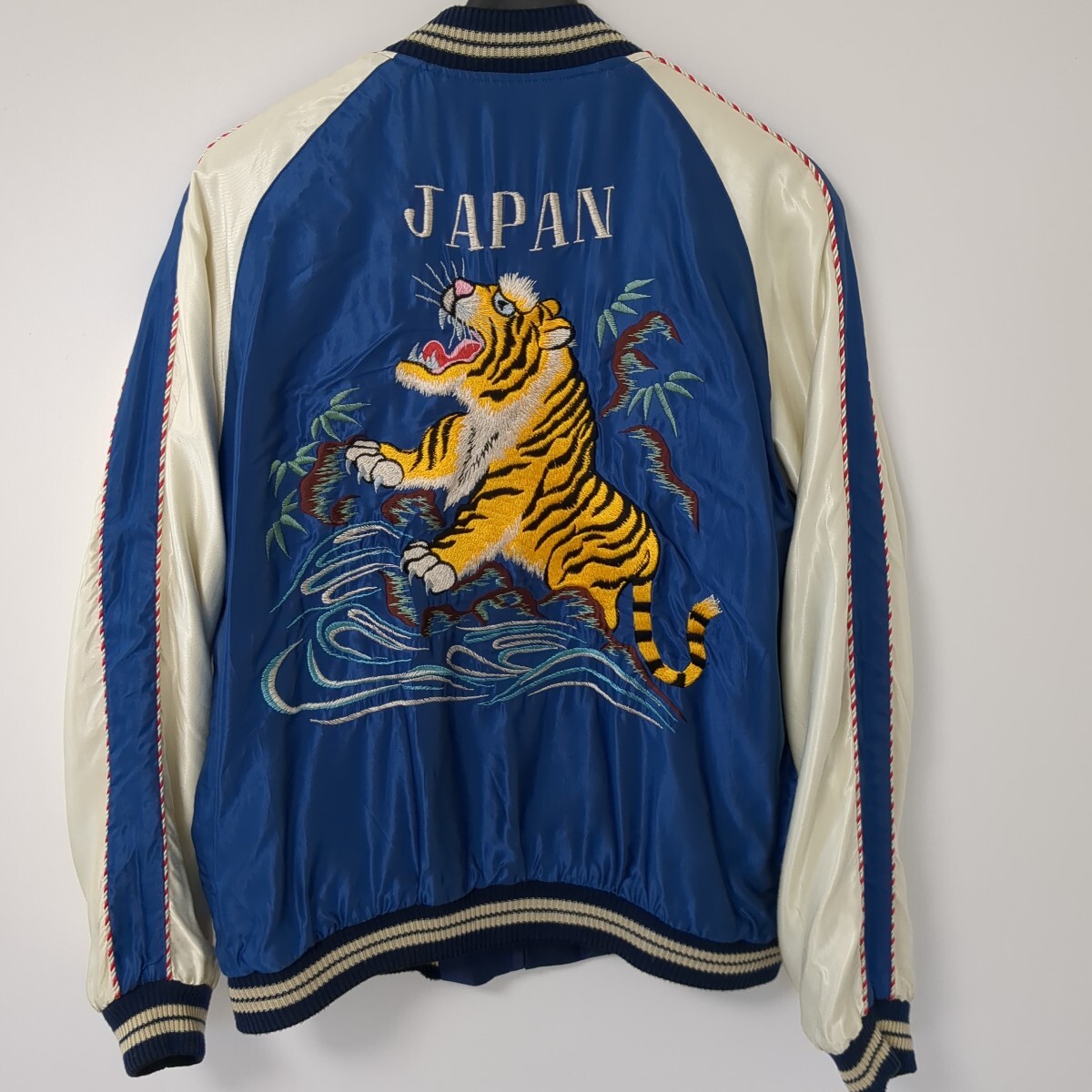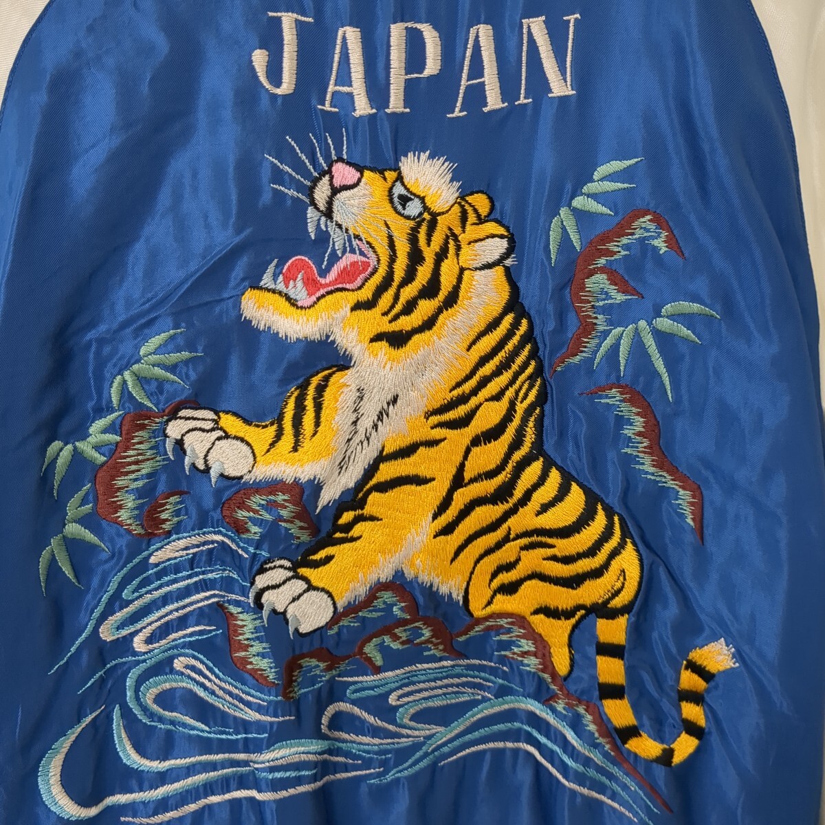 初めての復刻となる1950年代初期の作品。数ある虎柄のスカジャンの中でも、虎の全身が真横からのアングルで描かれたこの絵柄は非常にレア。程よくデフォルメされた猛々しい虎の刺繍をよく見ると鬣(たてがみ)には通常の白、目や牙、爪にはブルーがかった白の刺繍糸が使われており、2色の白を使い分ける凝った仕様もヴィンテージに準じた。加えてブロック体のJAPANの文字や通常より大きい胸の鷲虎の刺繍なども珍しく、ヴィンテージでは評価が高い。
