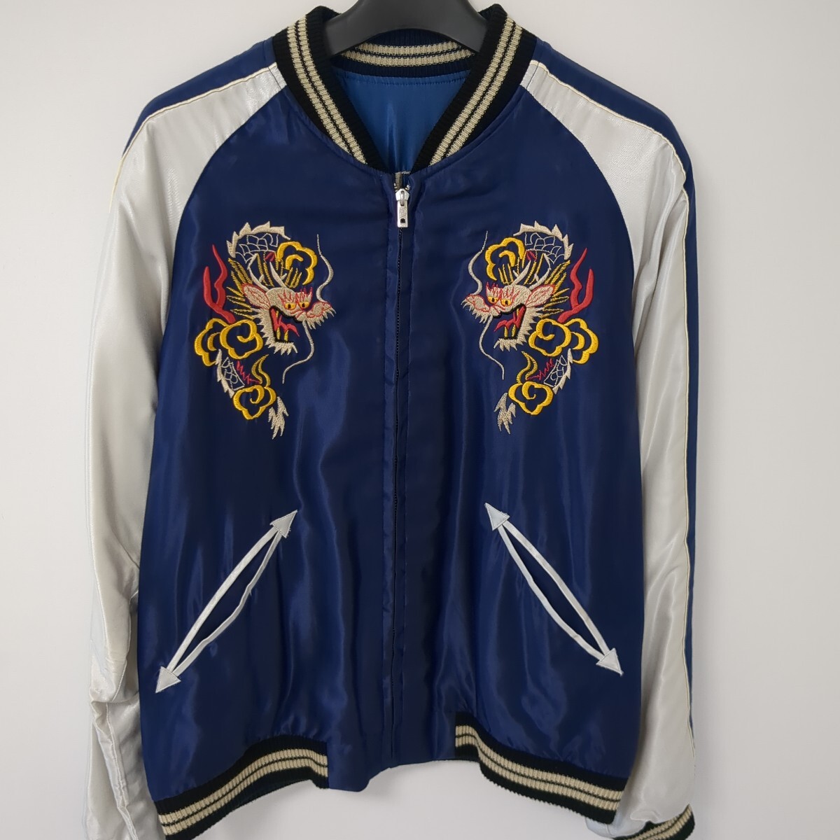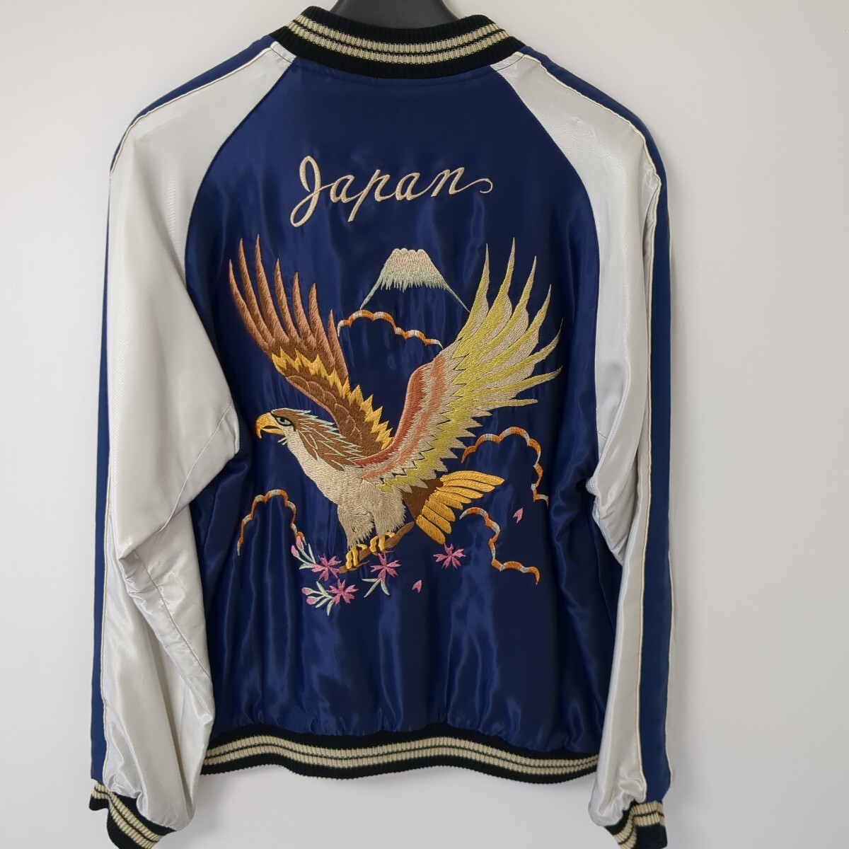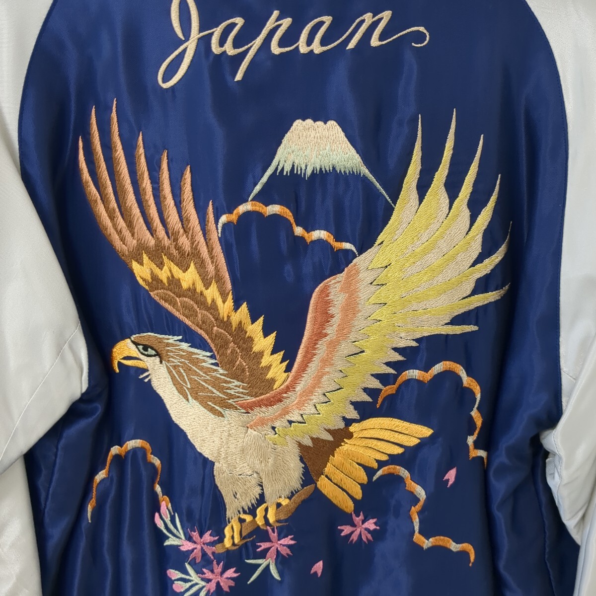 リバーシブル面は桜の木から飛び立とうとする鷲の絵柄。大きく広げた翼を描写するため多色の刺繍糸を使い、翼の外側は濃色、内側は淡色のグラデーションで表現している。ネイビーのアセテート生地に映える桜の花も印象的な作品。