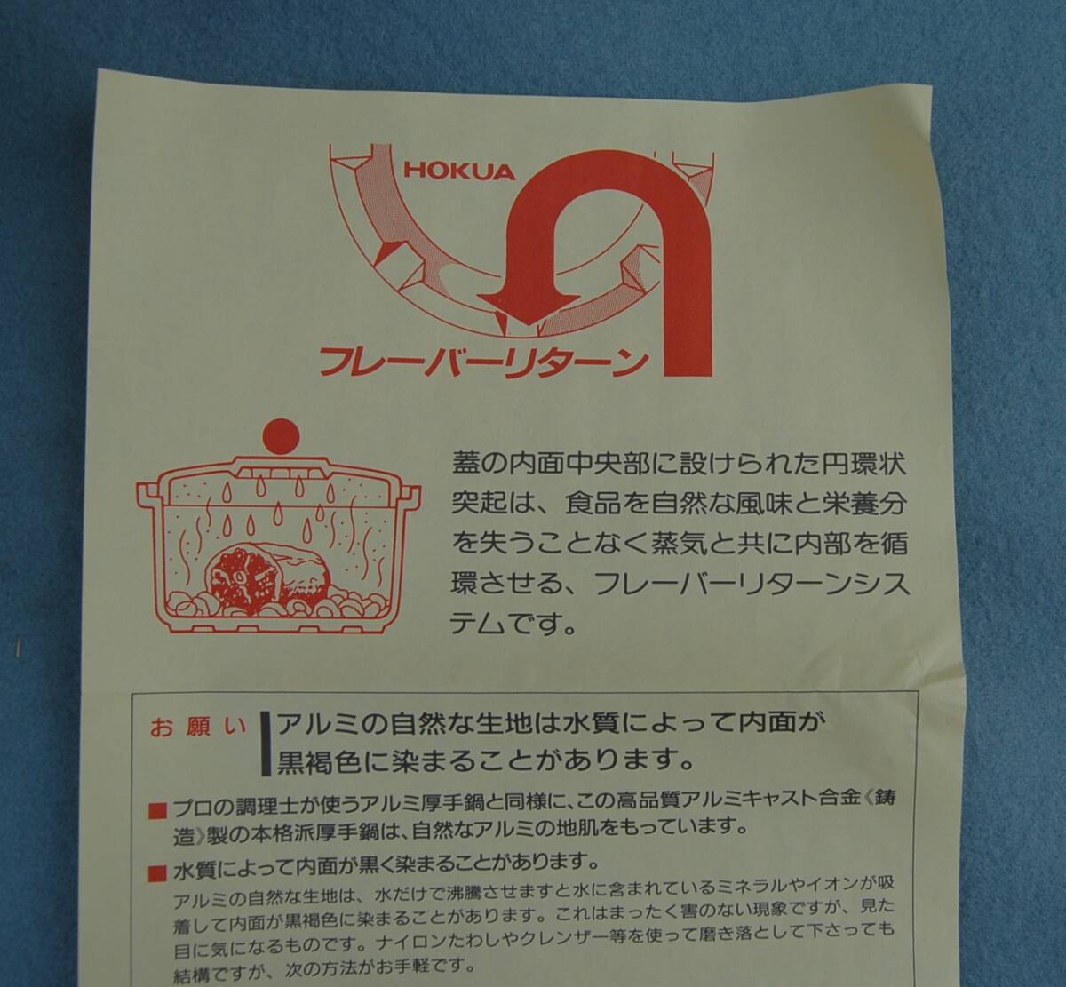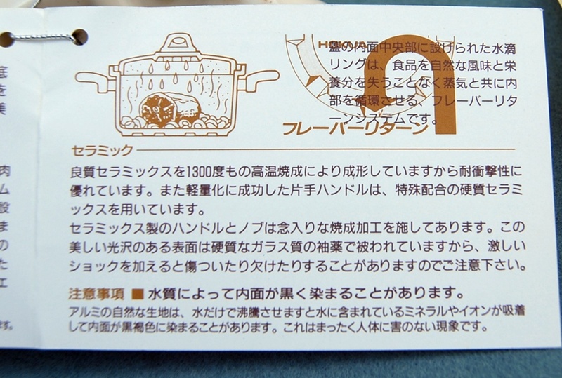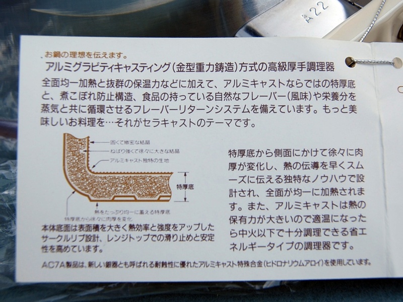 金型重力鋳造方式の高級厚手調理器と説明書に記載です。