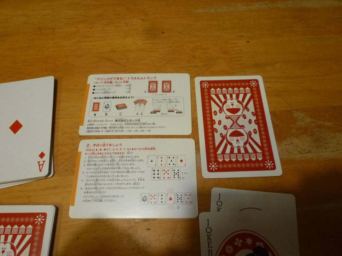 こちらはお子様が大好きなドラえもんで、セブン-イレブン限定とあるマジックが出来る!ドラえもんトランプの未開封品です。カード予知編ともあり、マジック1はカード予知(あなたの選ぶカード当て) 2のずばり当てましょう 3は集まれA 等の解説もあります。