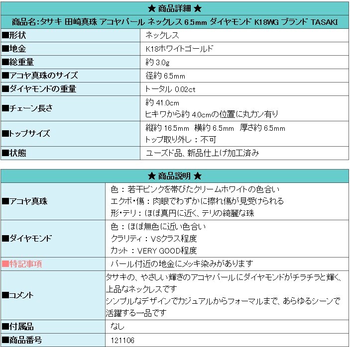 | 商品名:タサキ 田崎真珠 アコヤパール ネックレス 6.5mm ダイヤモンド K18WG ブランド TASAKI | |