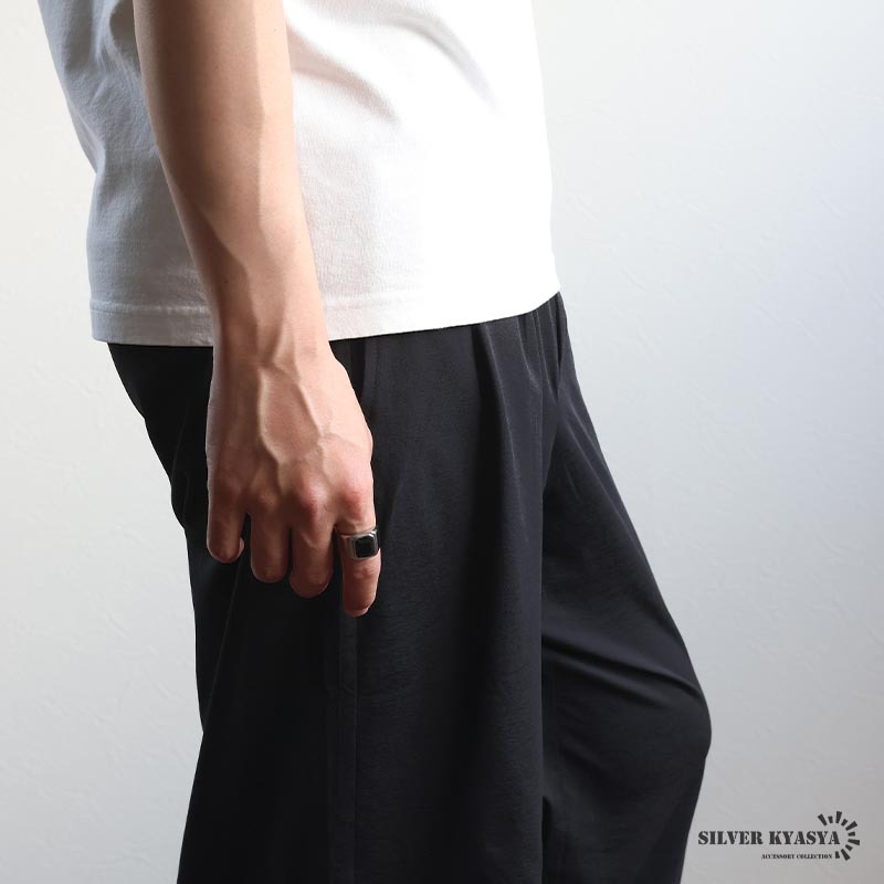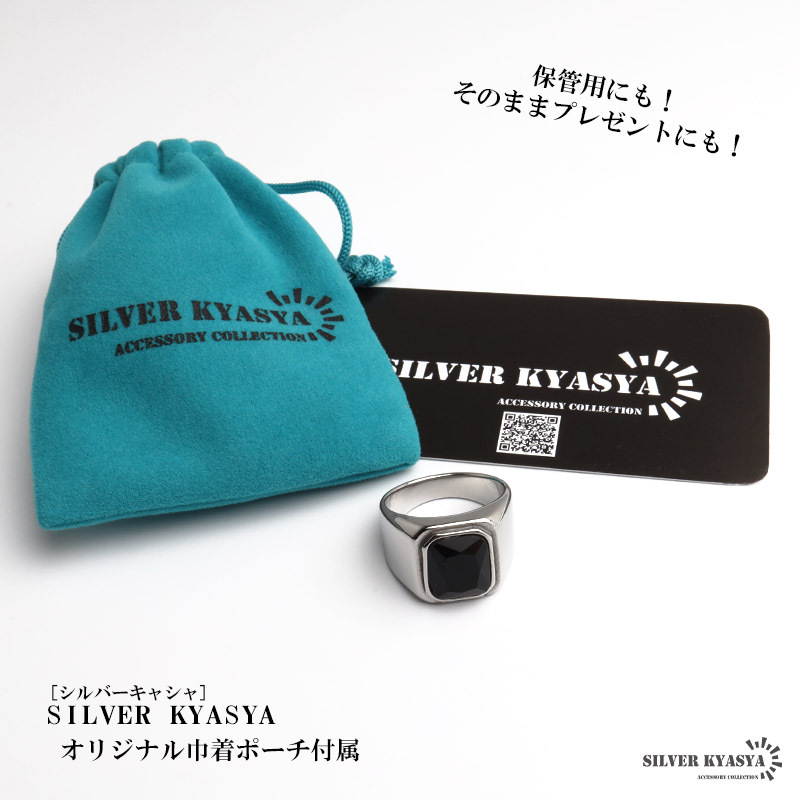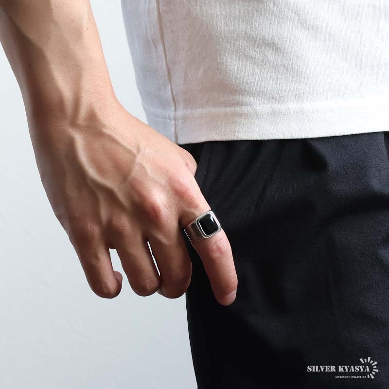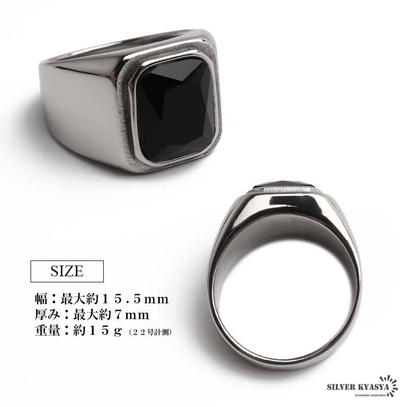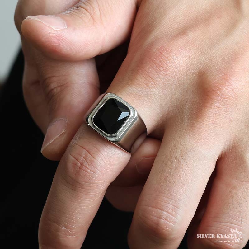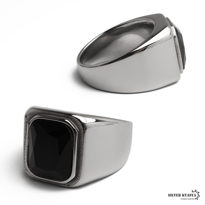 特大のブラックジルコニアが目を惹くワイド印台リング。単品使いでも十分に存在感を演出してくれます。ステンレス製なのでつけっぱなしでも問題ありません!