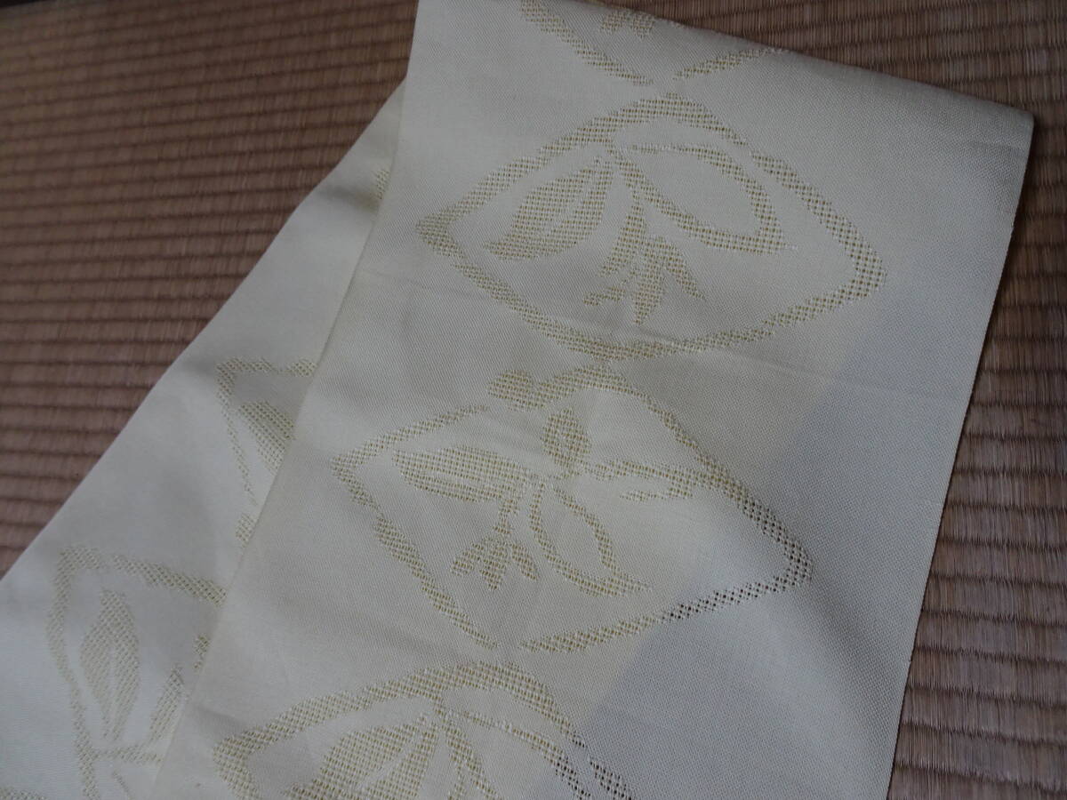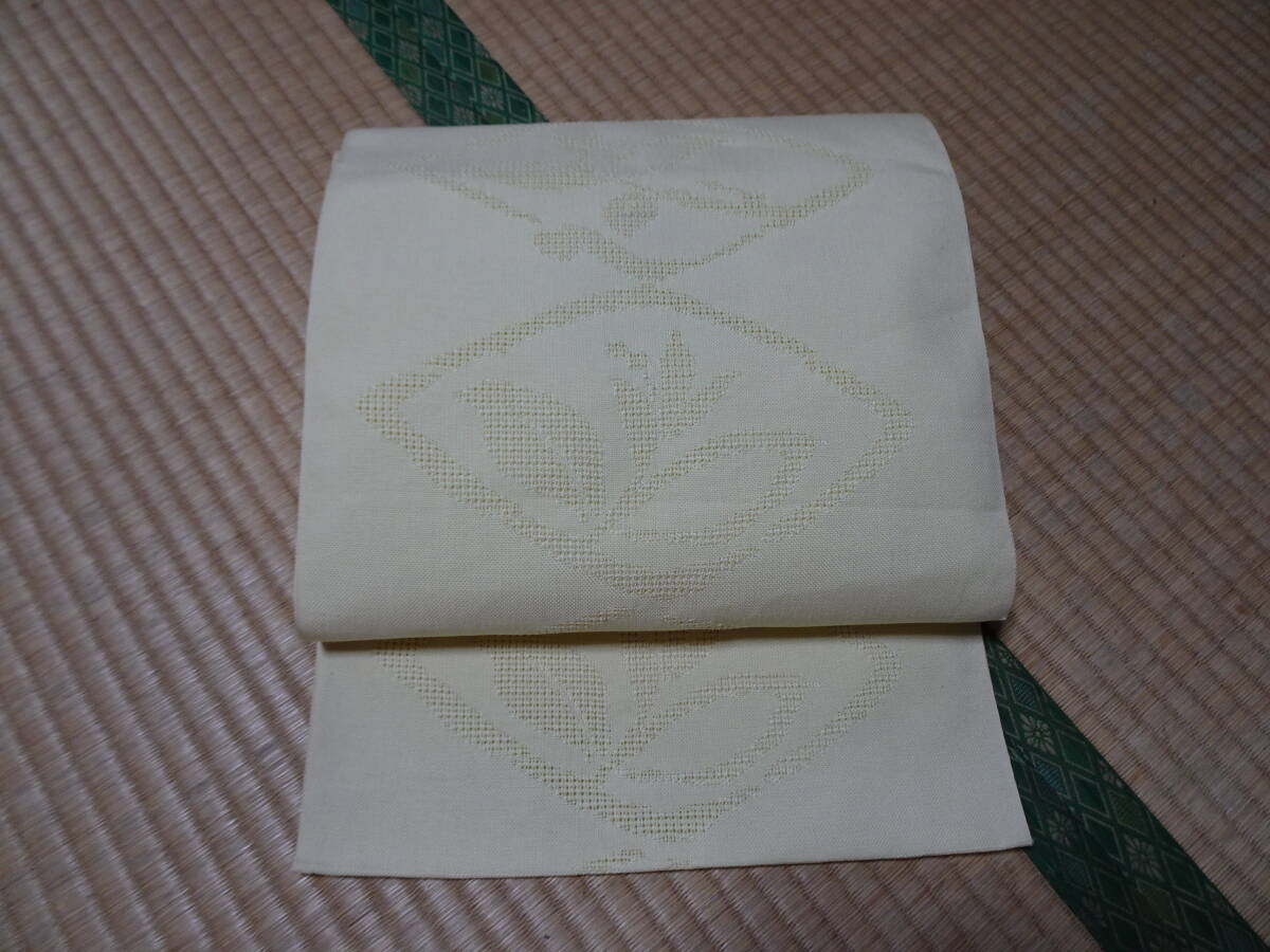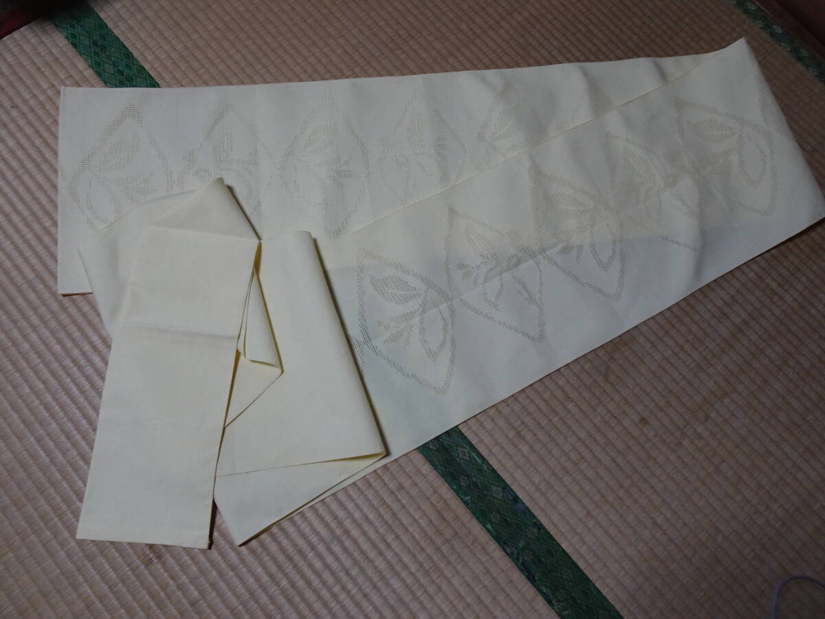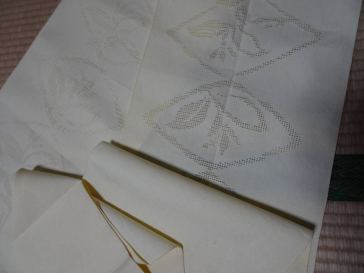 淡い黄色地に透かし柄が涼しそうです。幅約15,5cmと約30,5cm、長さ約336cmです。二番目の写真が実物に近いお色です。出品しております商品は中古品やアンティーク品です。充分点検しておりますが、僅かな見落としがある場合はご容赦下さい。また、色合いも忠実に再現できない場合もありますのでご理解下さい。完品をお求めの方や匂いが気になる方、神経質な方のご入札はお控え下さいませ。また、いかなる理由があっても入札後の取り消しには応じられませんので慎重なご入札をお願い致します。24時間以内にご連絡頂ける方、3日以内に入金頂ける方のご入札をお待ちしております。お取り置きは10日位までお受け致します。
