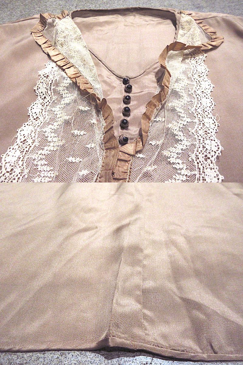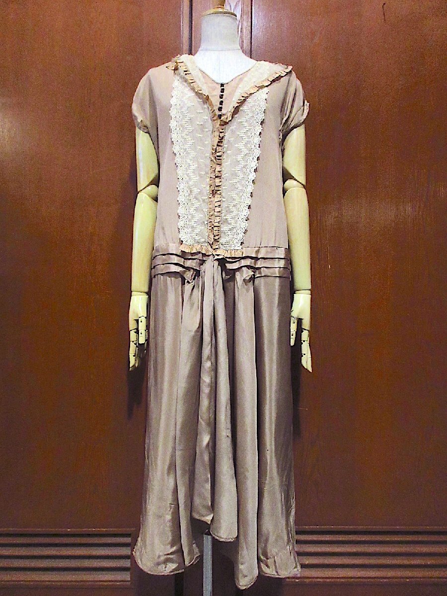 ビンテージ~20s●レース刺繍付きシルクノースリーブワンピース茶●250802m3-w-nsdrsアンティークドレスレディース古着