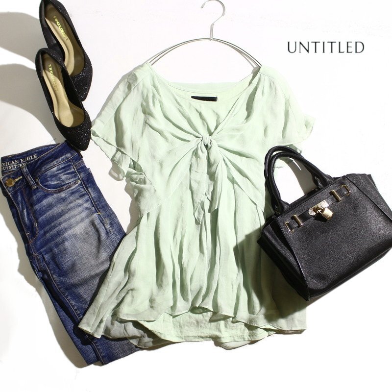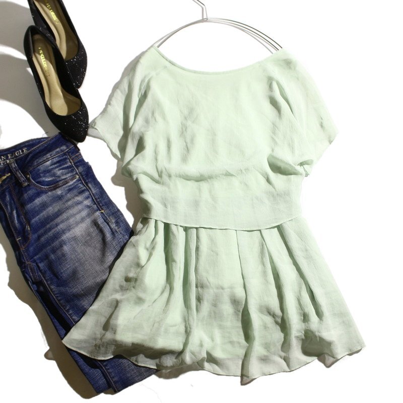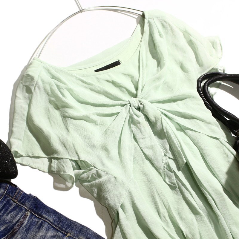美品 アンタイトル UNTITLED 株)ワールド 夏 上品 爽快 デザイン シフォンカットソー 半袖 カットソー 9号 2 ミントグリーン ミセス 綺麗め