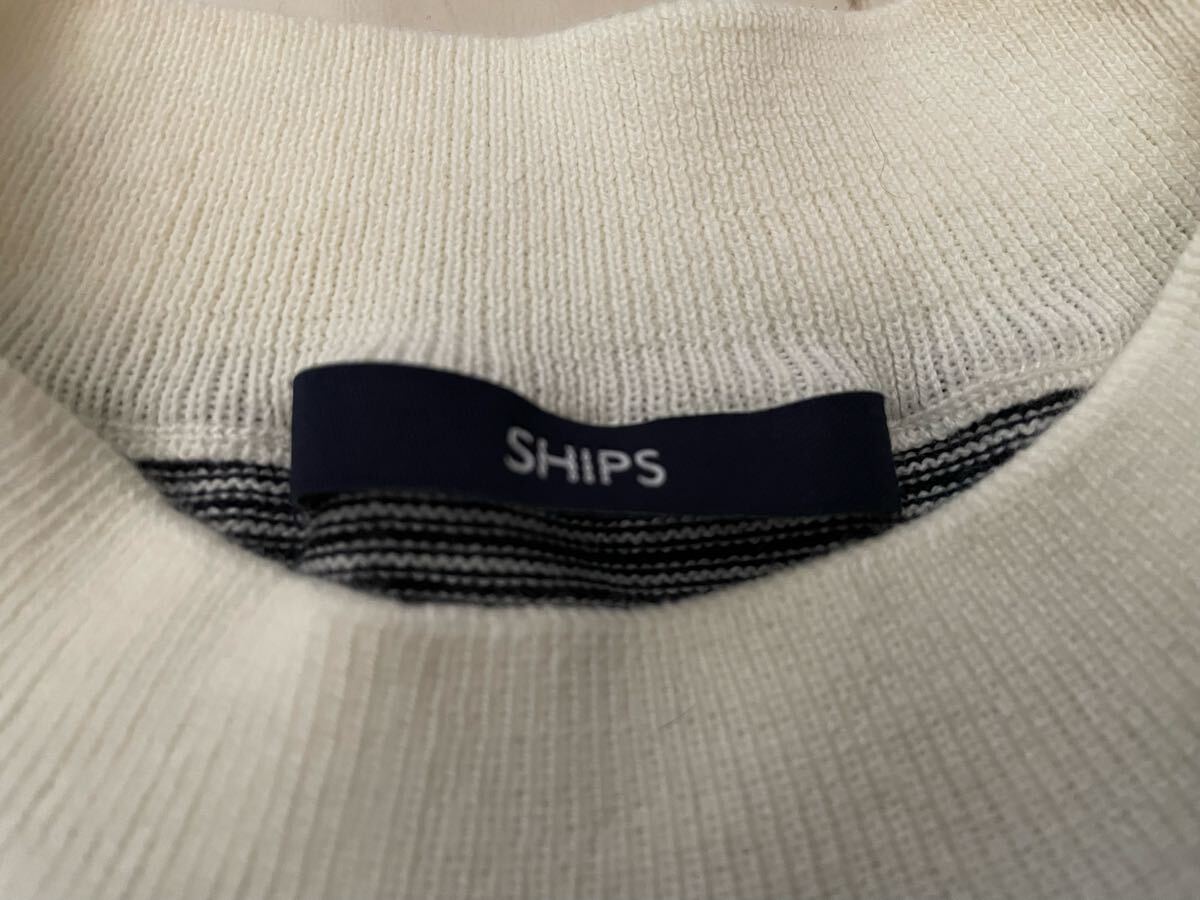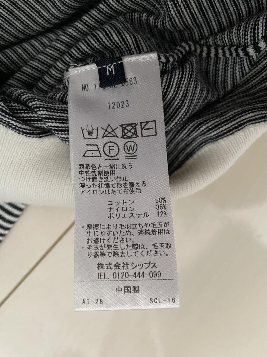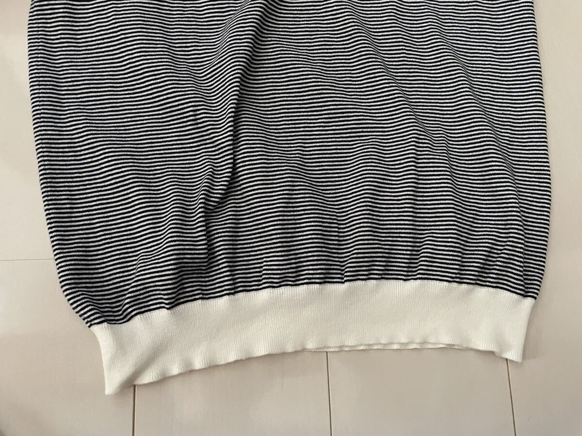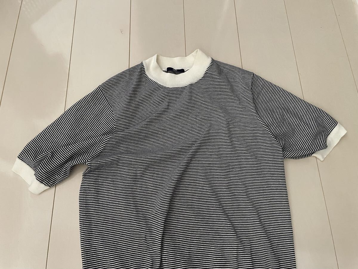 色はネイビーのボーダー。サイズはMです。素人採寸で着丈は約64cm、肩幅は約43cm、身幅は約50cm、袖丈は約26cmです。3回使用しましたが、白い部分には目立たない程度の汚れはありますが、特に目立つダメージは無く着用して頂けます。173cm、65kgで丁度良いです。
