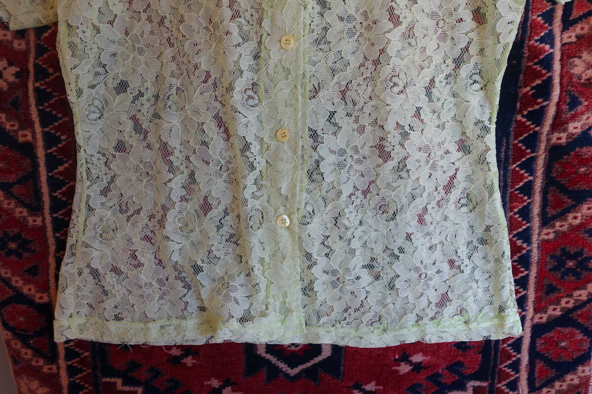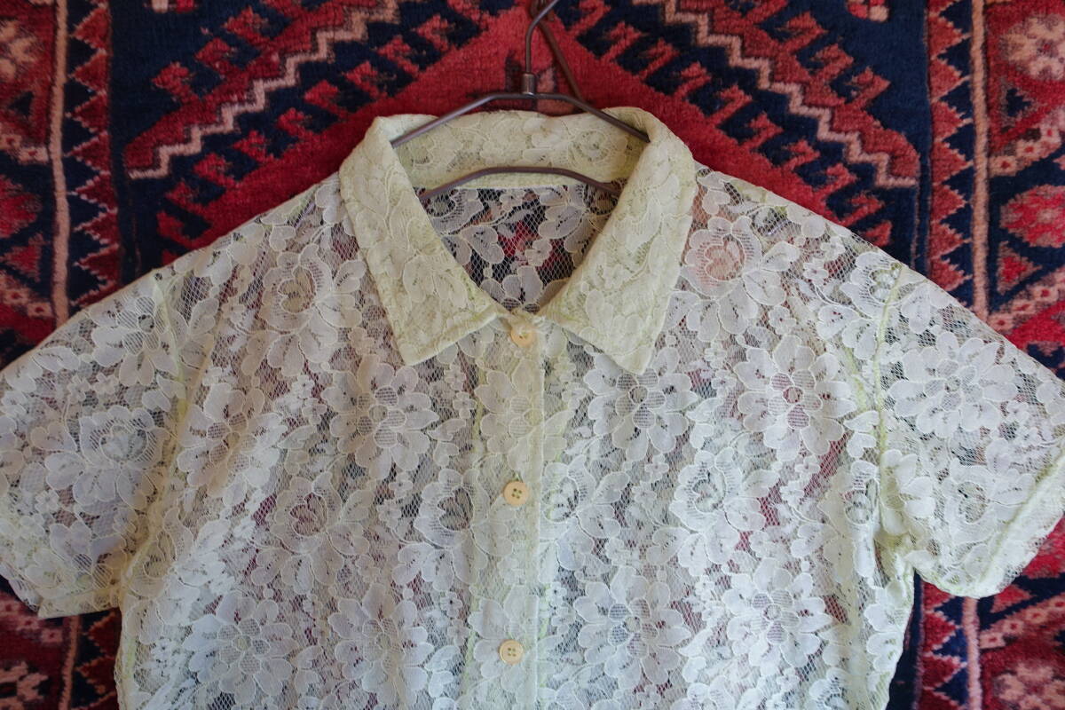 ○[80s90s00s vintage ヴィンテージ 緑 グリーン レース 花柄 透け感 レトロシャツ]USED古着 昭和レトロ・モダン・モッズ